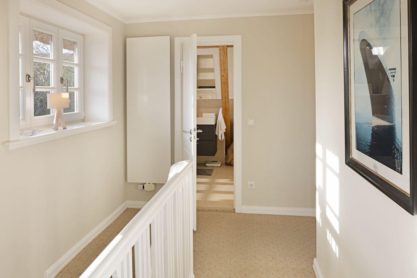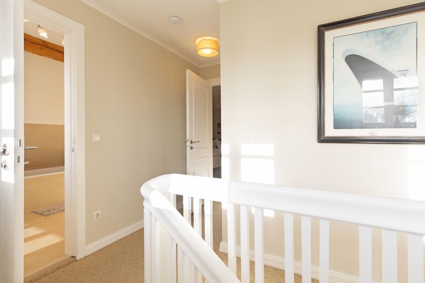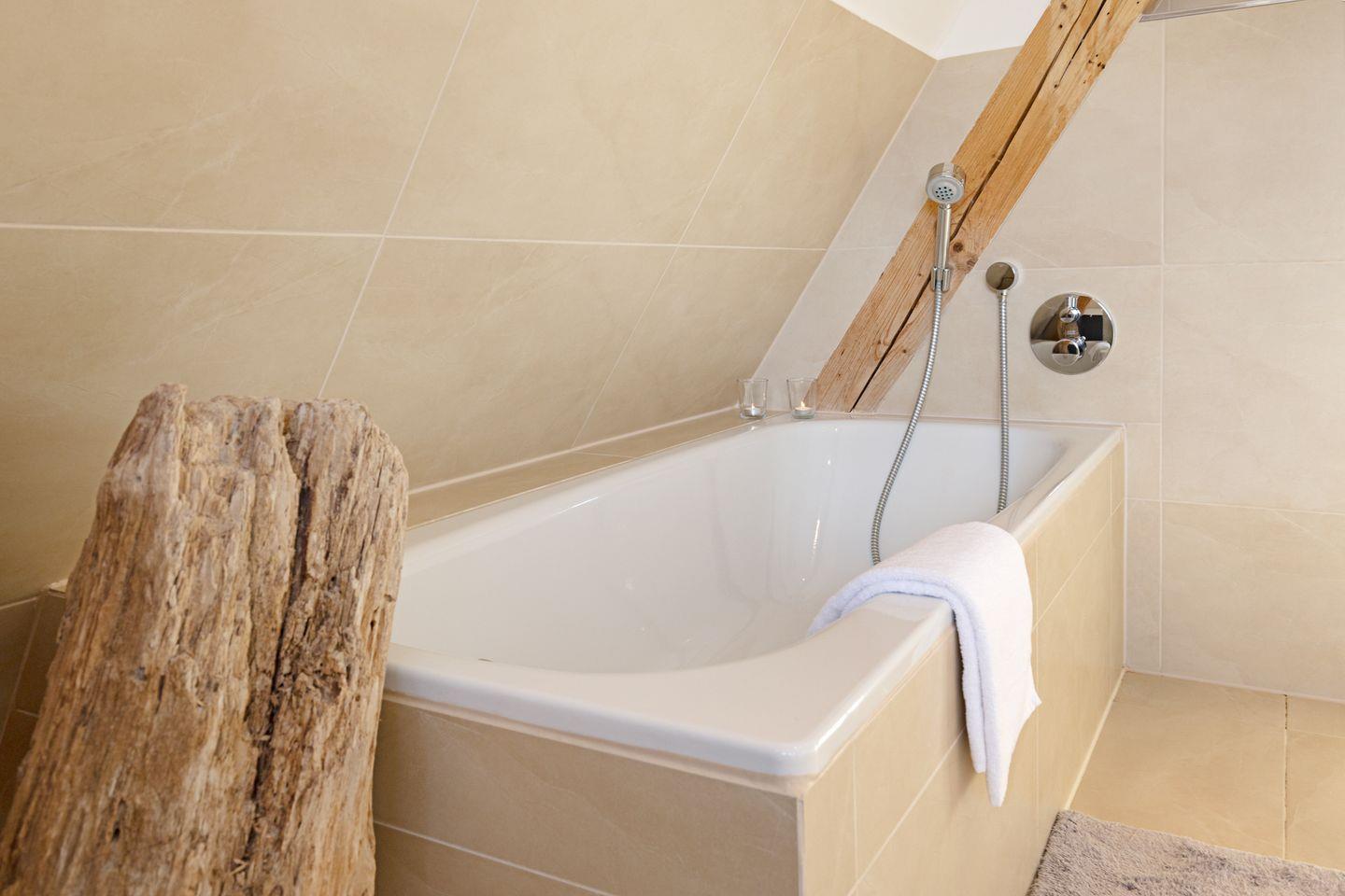 Im Obergeschoss finden Sie zwei Schlafzimmer mit Doppelbetten und ein großes Badezimmer mit Dusche und Badewanne.