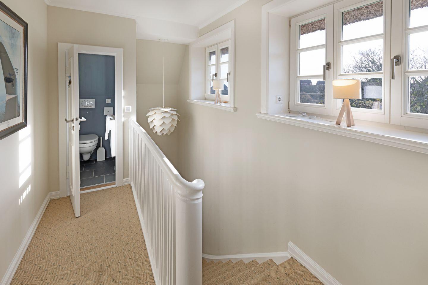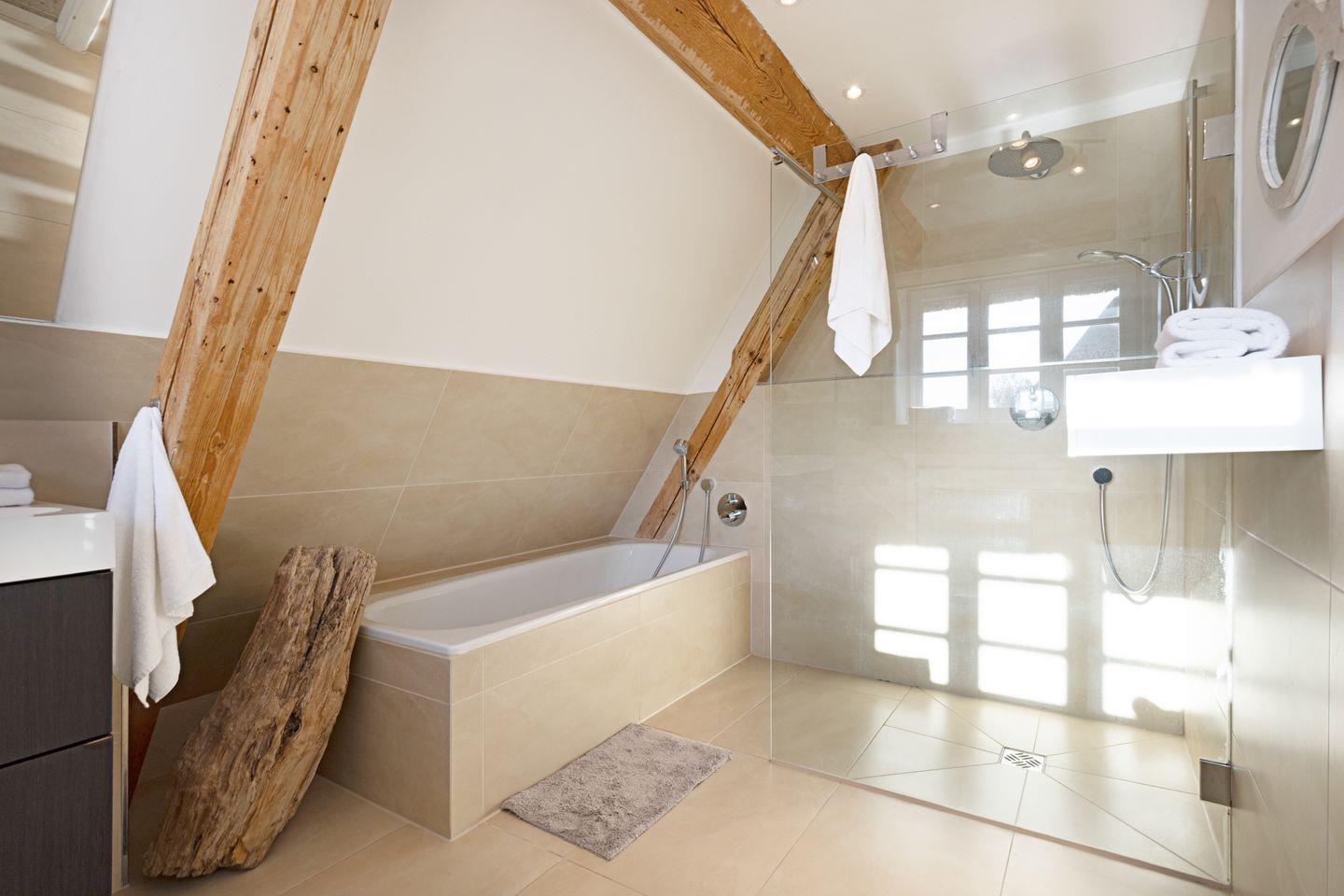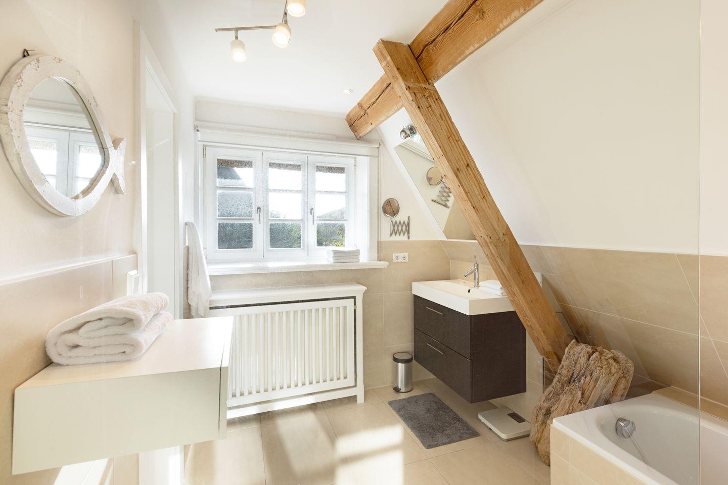 Im Obergeschoss finden Sie zwei Schlafzimmer mit Doppelbetten und ein großes Badezimmer mit Dusche und Badewanne.