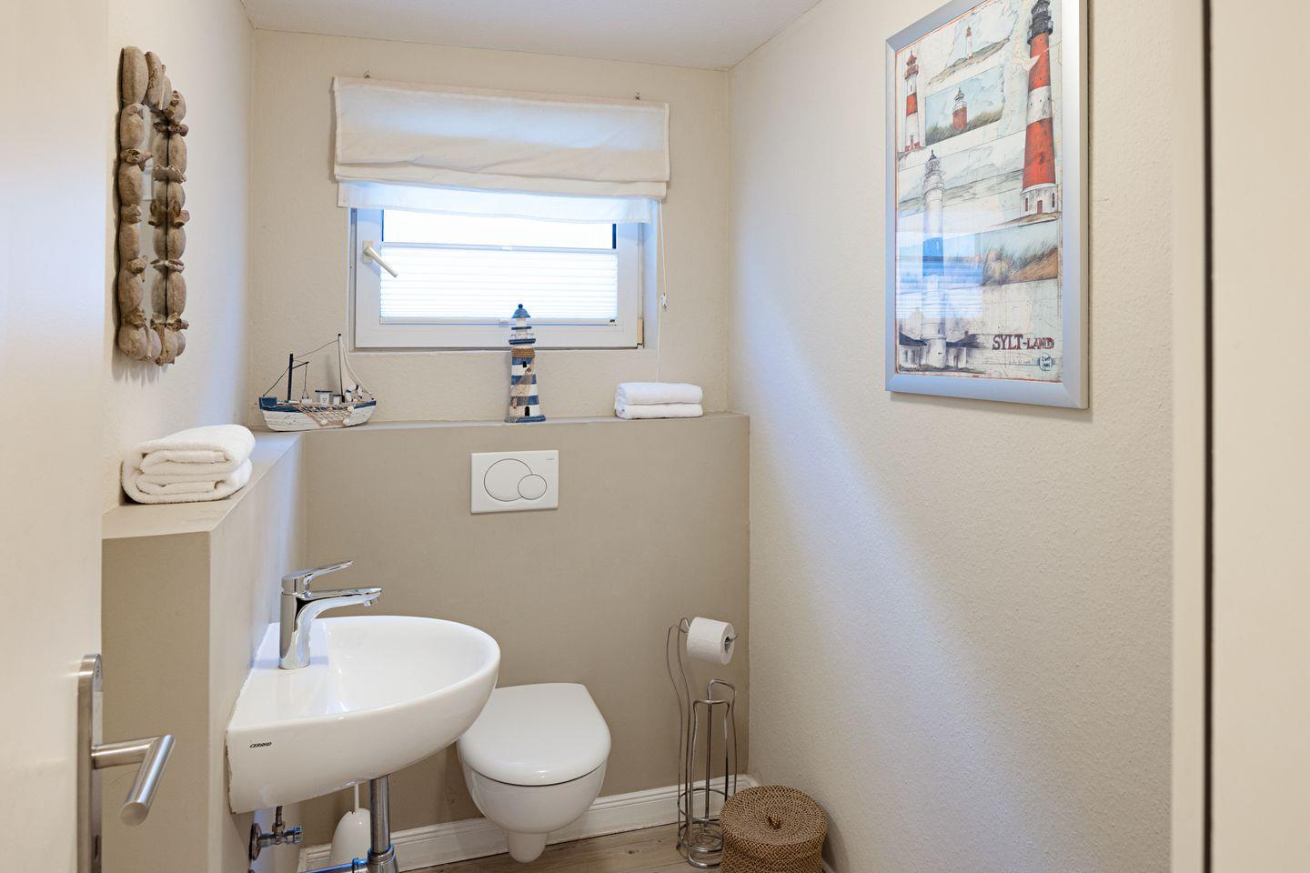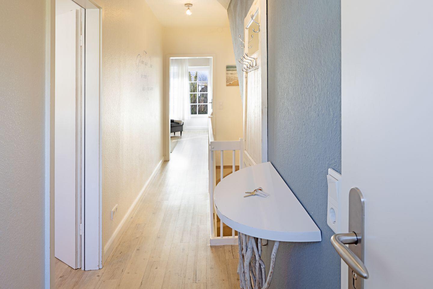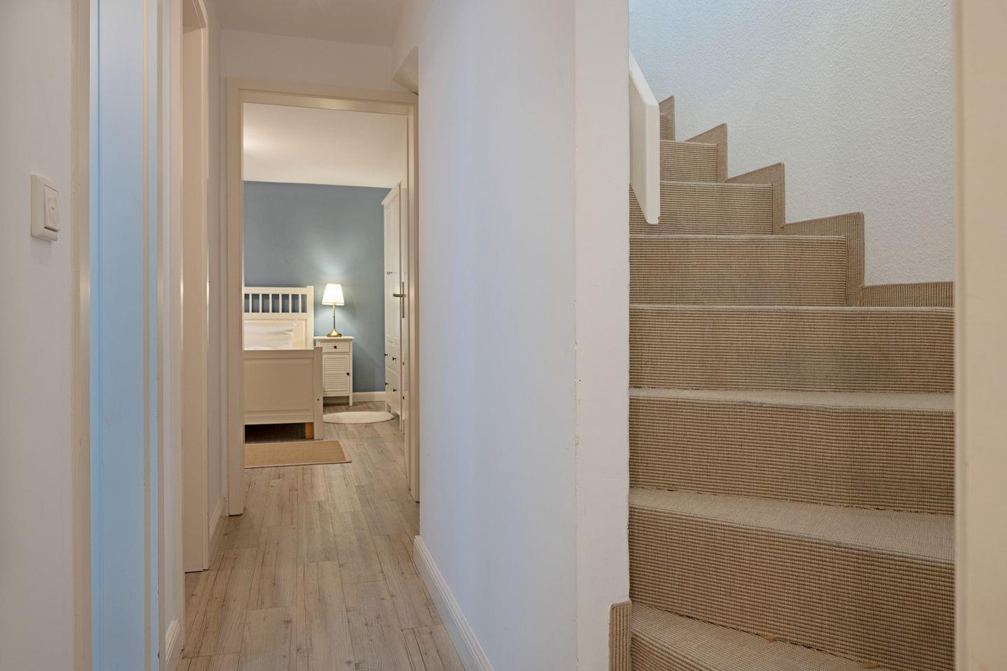Auf der mit Gartenmöbeln ausgestatteten Terrasse finden Sie auch einen Strandkorb. Der hübsch gestaltete Flur führt nach unten, wo Sie zwei weitere Schlafzimmer finden, die jeweils mit Doppelbetten ausgestattet sind. Auch das Badezimmer und ein zusätzliches Gäste-WC finden Sie in dieser Ebene.