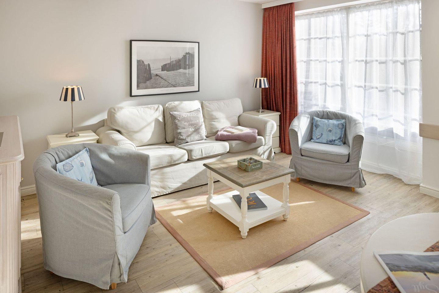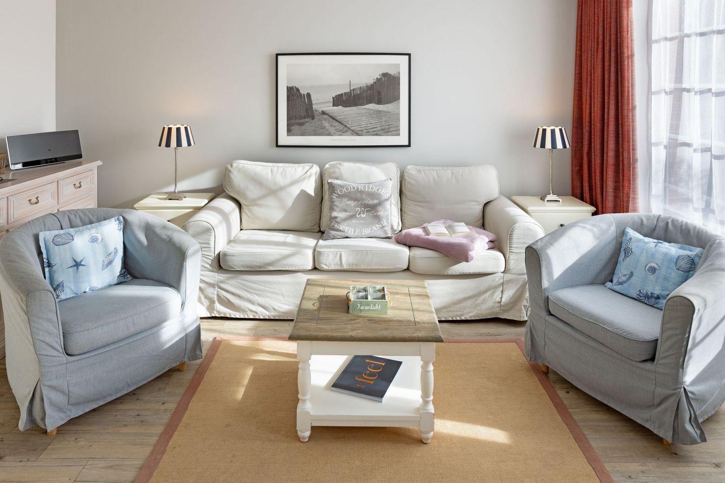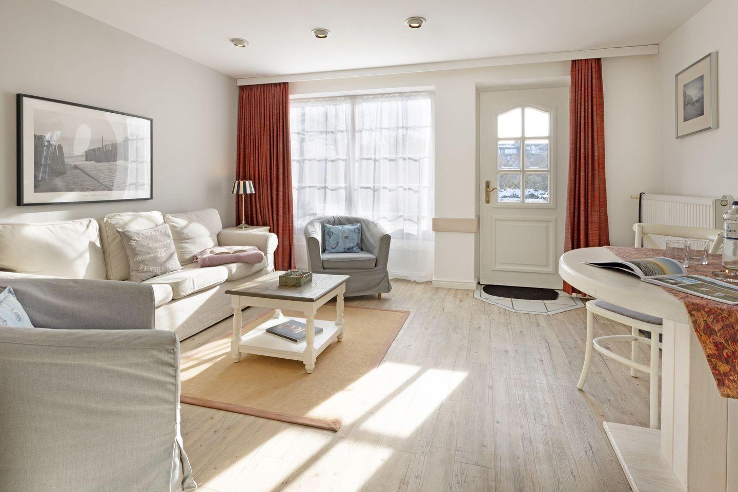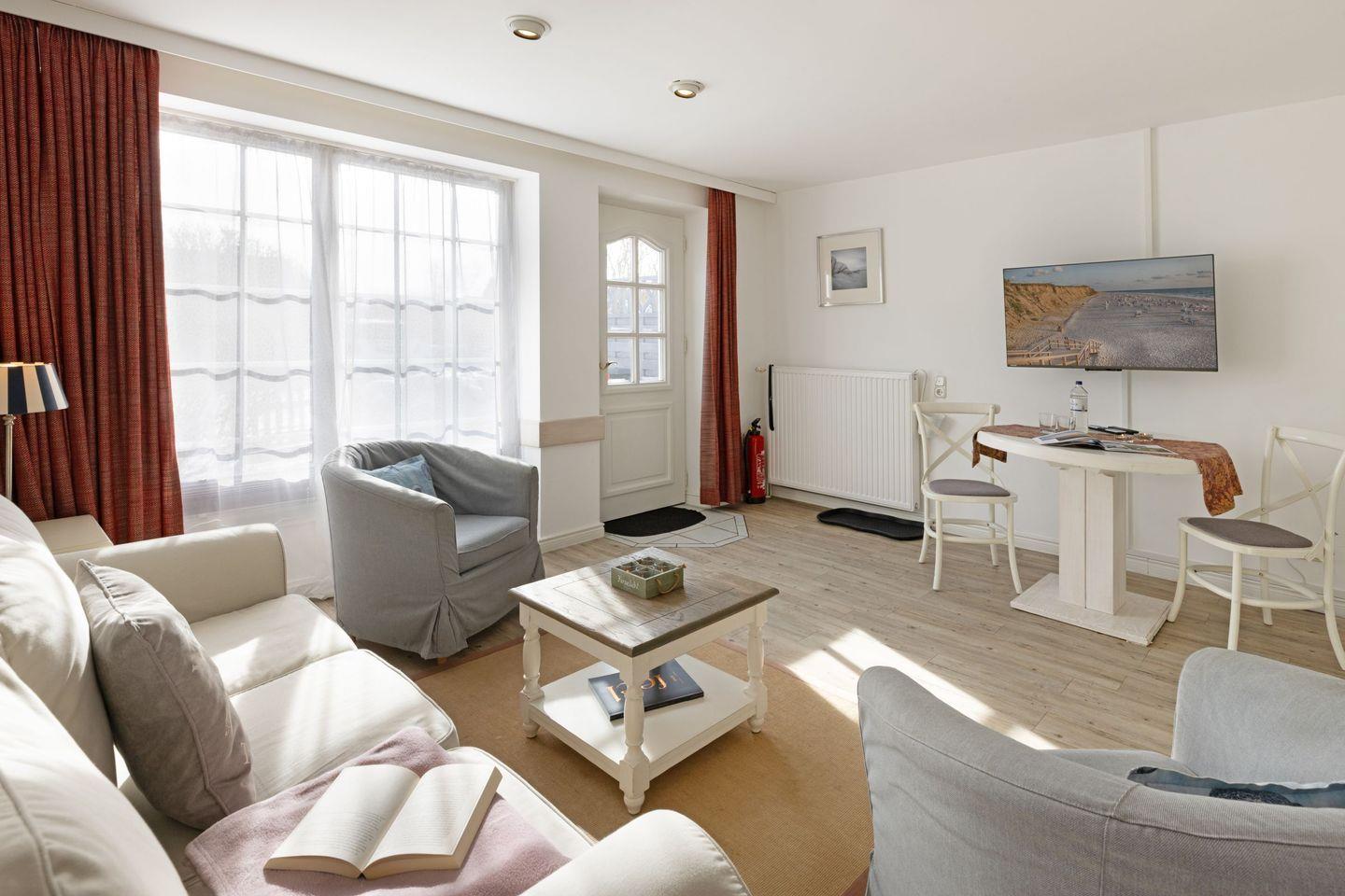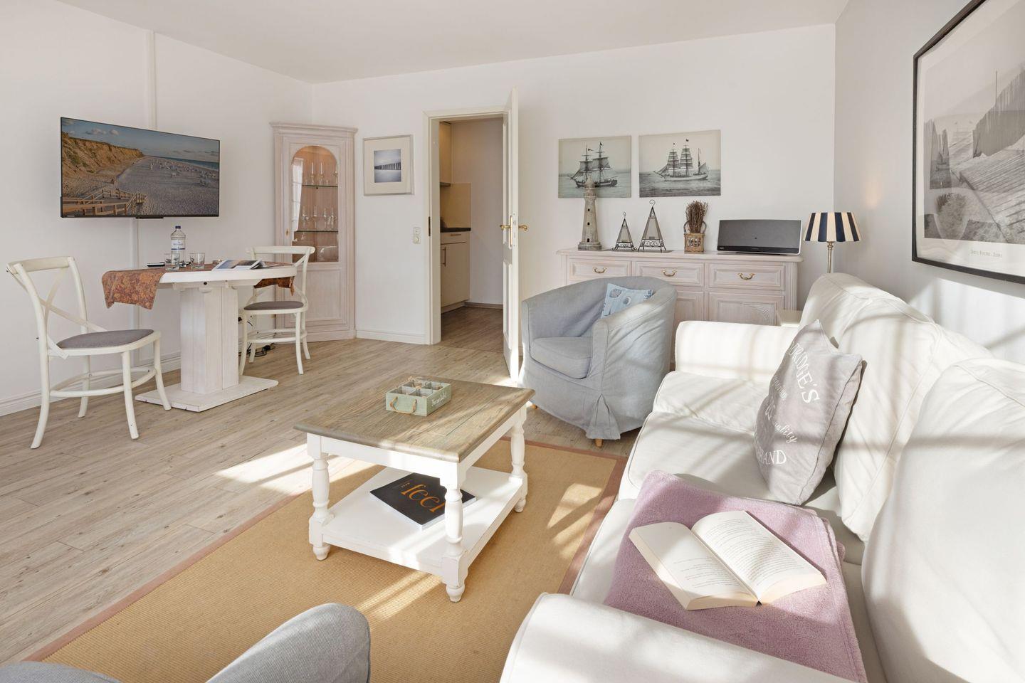 Die Wohnung befindet sich im Parterre und bietet einen direkten Zugang zur privaten Terrasse, wo Sie entspannen und die frische Luft der Nordsee genießen können. Die Terrasse ist mit bequemen Gartenmöbeln ausgestattet, ideal für ein Frühstück im Freien oder ein entspannendes Glas Wein am Abend. Innen überzeugt die Wohnung mit einem modernen Wohnkonzept, das den Essbereich und die offene Küche harmonisch integriert. Die voll ausgestattete Küche lässt keine Wünsche offen – von der Nespresso-Maschine bis hin zu Geschirrspüler und Kühlschrank, hier finden Sie alles, was Sie brauchen, um Ihre Lieblingsgerichte zuzubereiten.