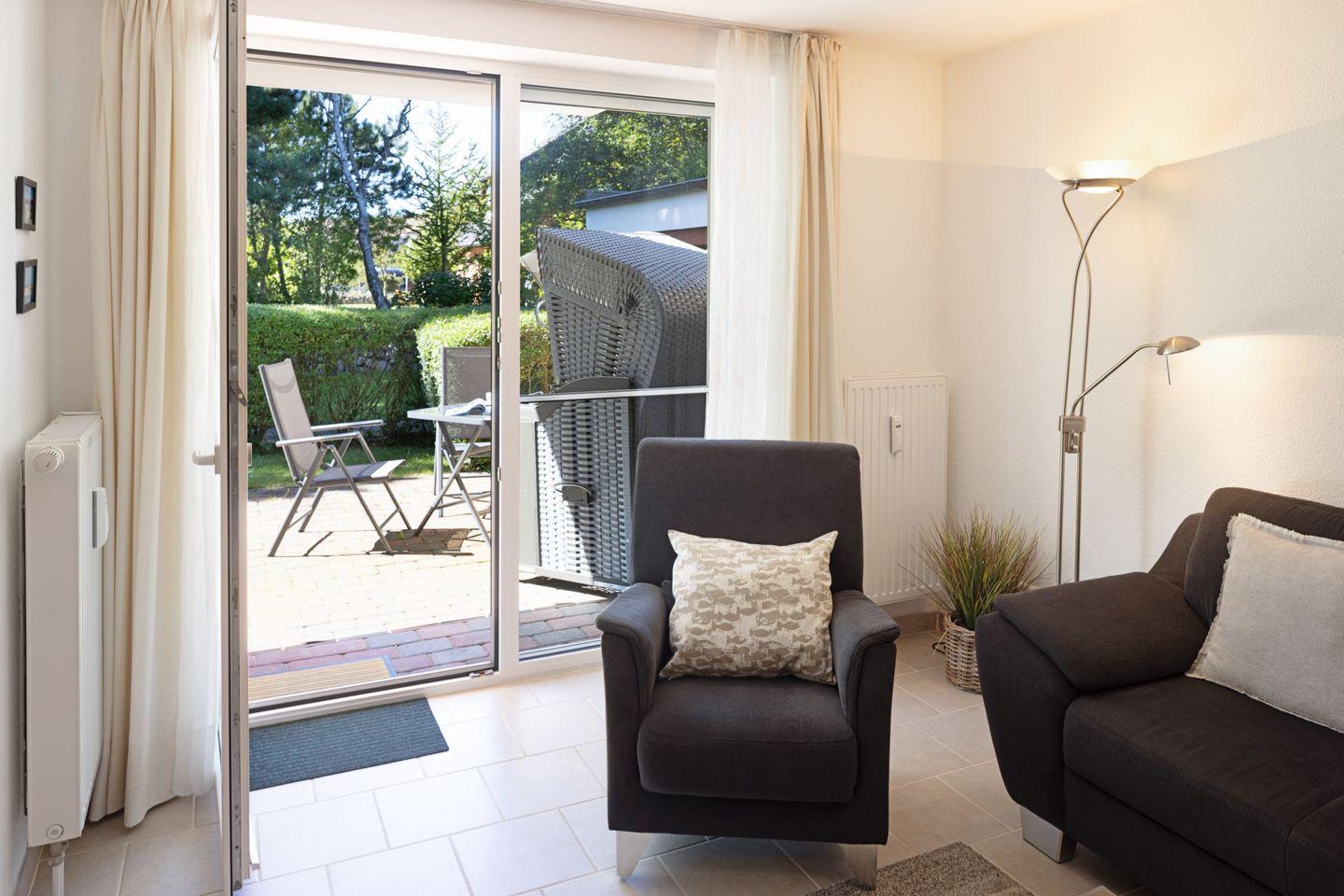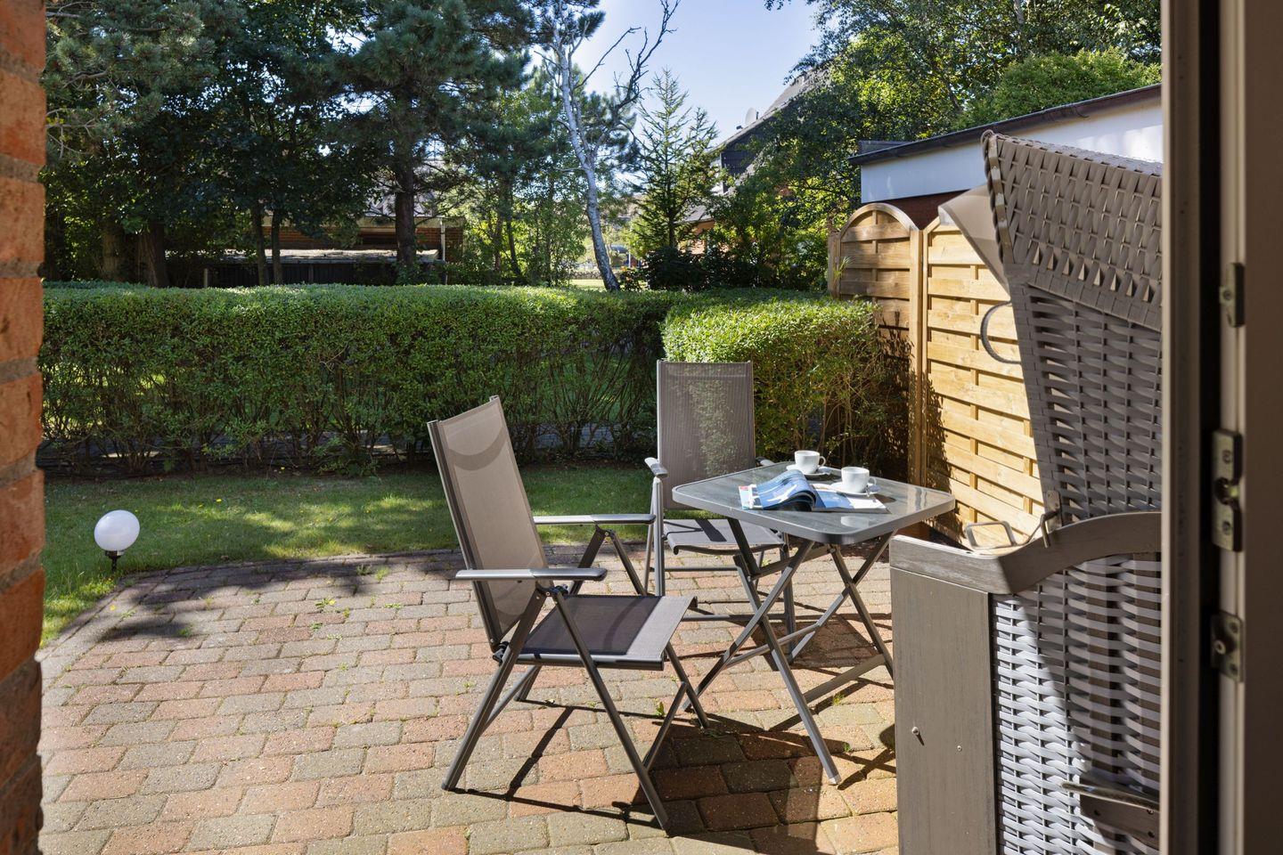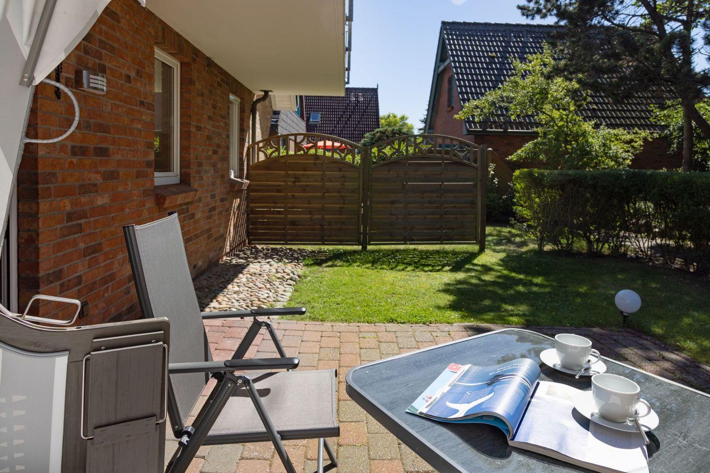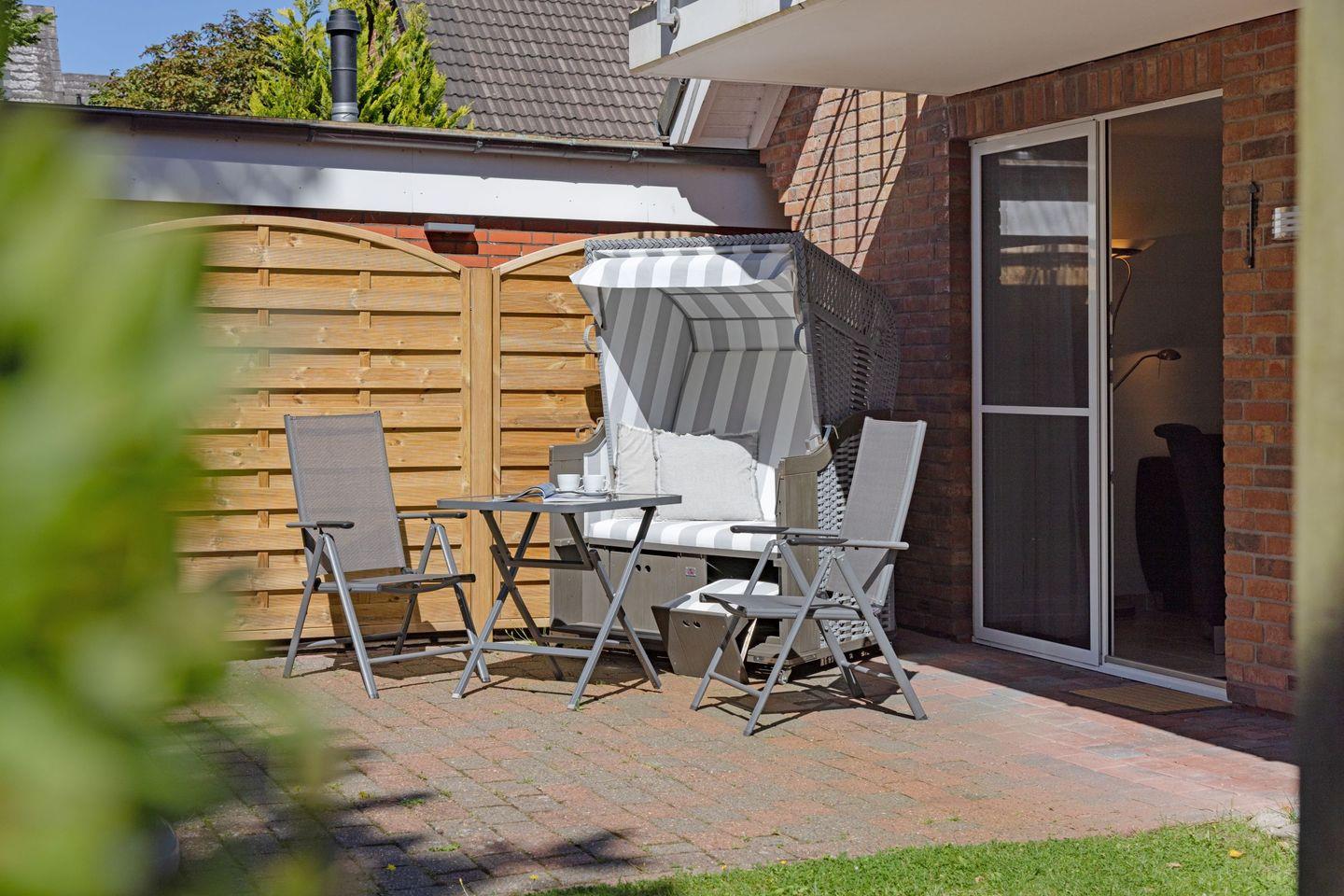 Strandkorb und Gartenmöbeln stehen Ihnen saisonal zur Verfügung.