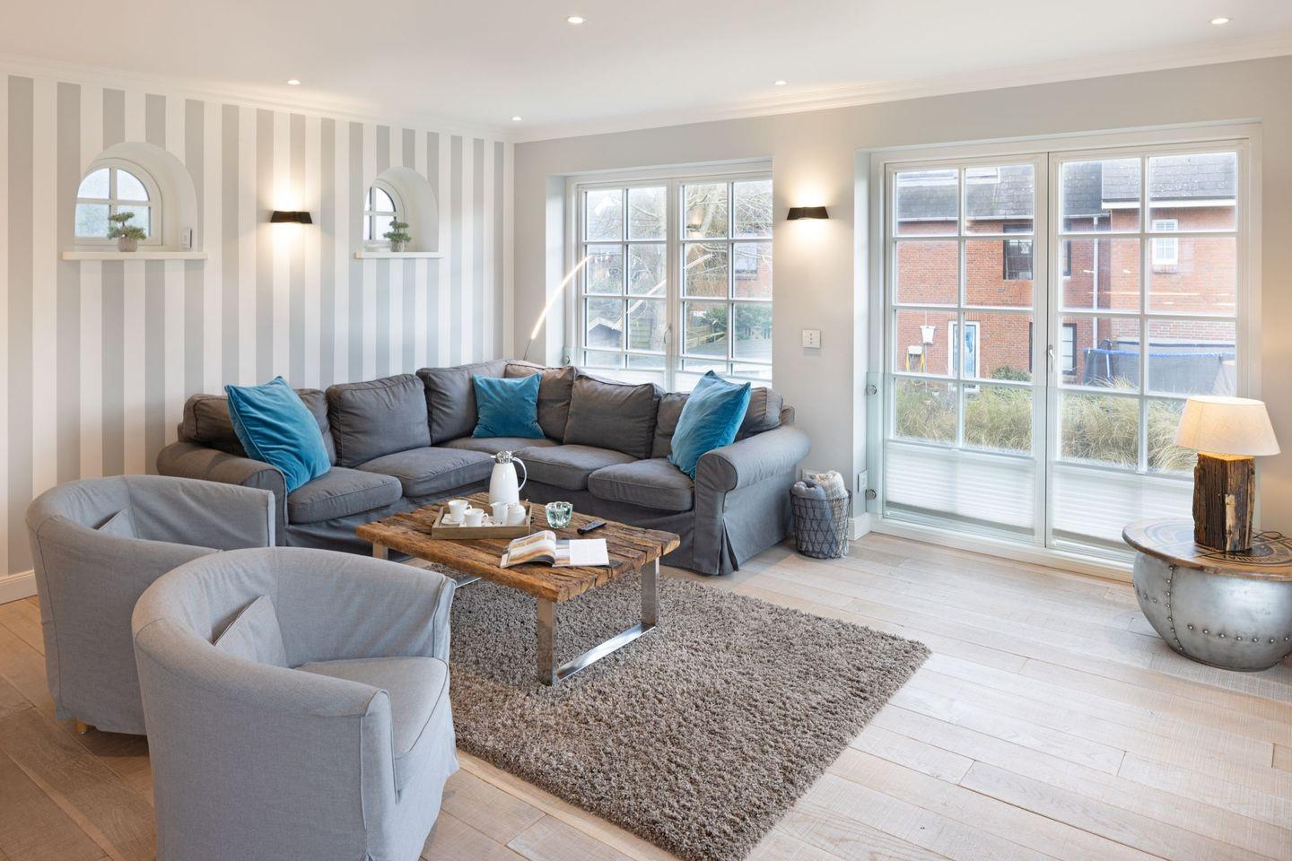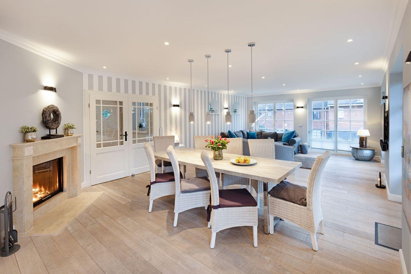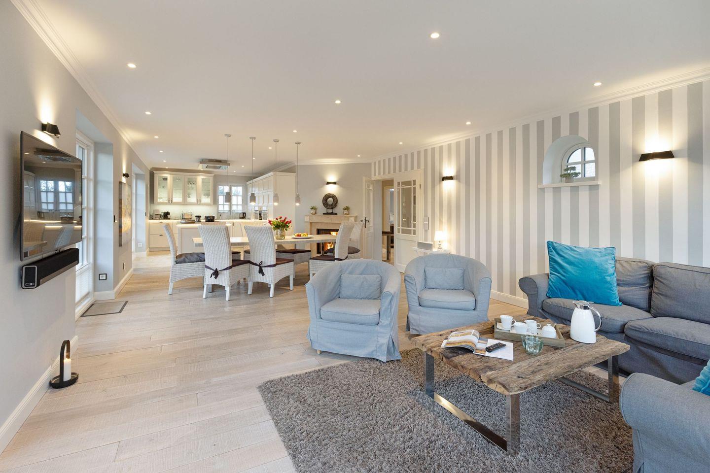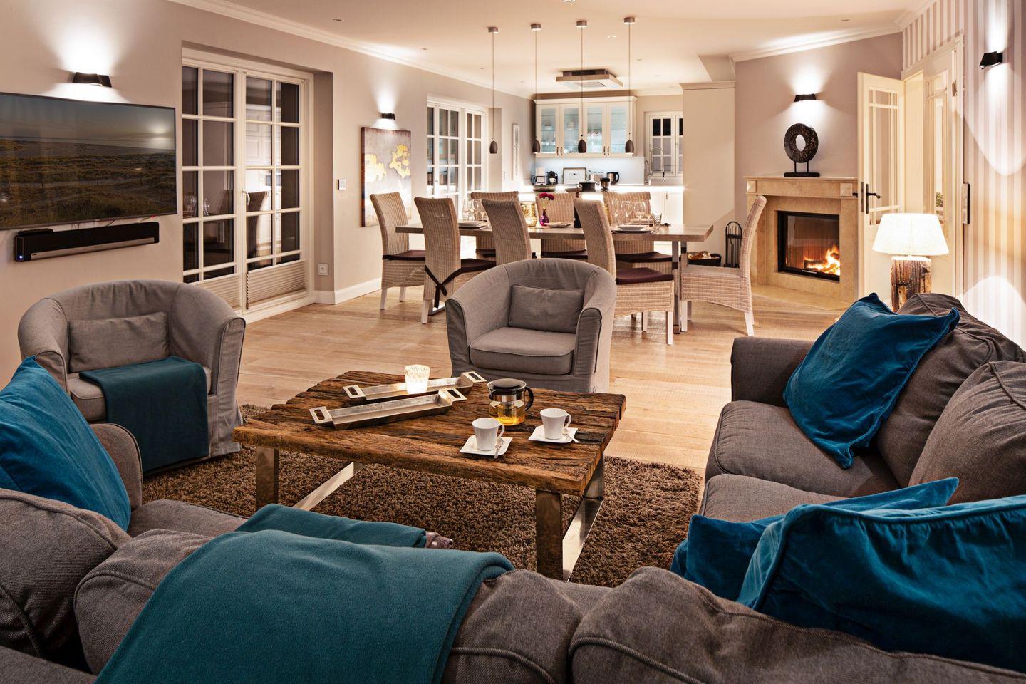 Die Syltresidenz ist mit vier gemütlichen Schlafzimmern ausgestattet, die Ihnen höchster Schlafkomfort bieten. Jedes Zimmer ist liebevoll eingerichtet und sorgt für eine entspannte Atmosphäre. Mit drei modernen Badezimmern und einem Gäste-WC müssen Sie sich nie um lange Wartezeiten kümmern – ideal für einen erholsamen Urlaub mit mehreren Personen. Das offene Wohnzimmer ist das Herzstück der Wohnung, ausgestattet mit einer komfortablen Sofaecke, einem modernen Kaminofen und einem Entertainment-Bereich mit insgesamt sechs Fernsehern und einer HiFi-Anlage, die für gemütliche Abende sorgen.