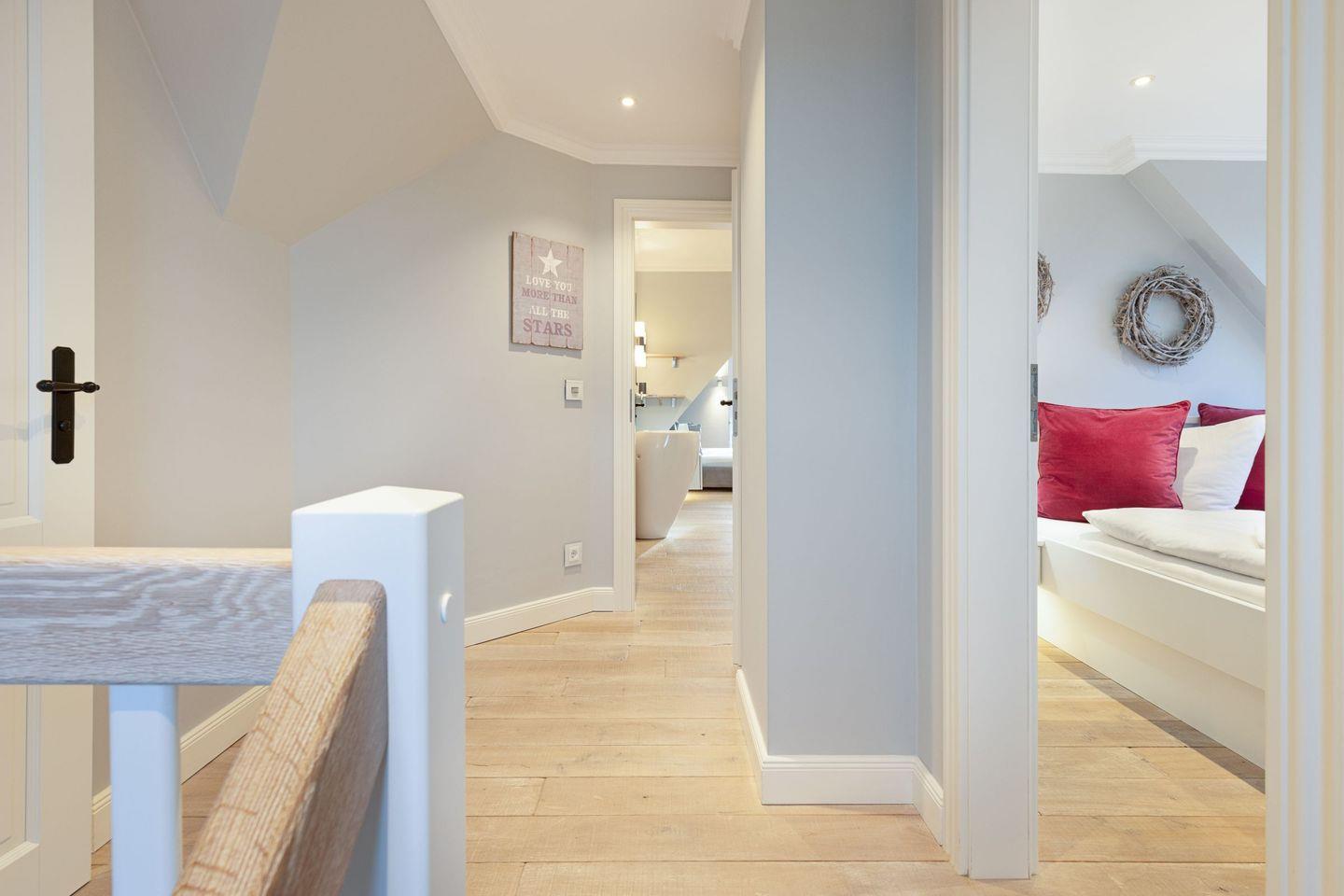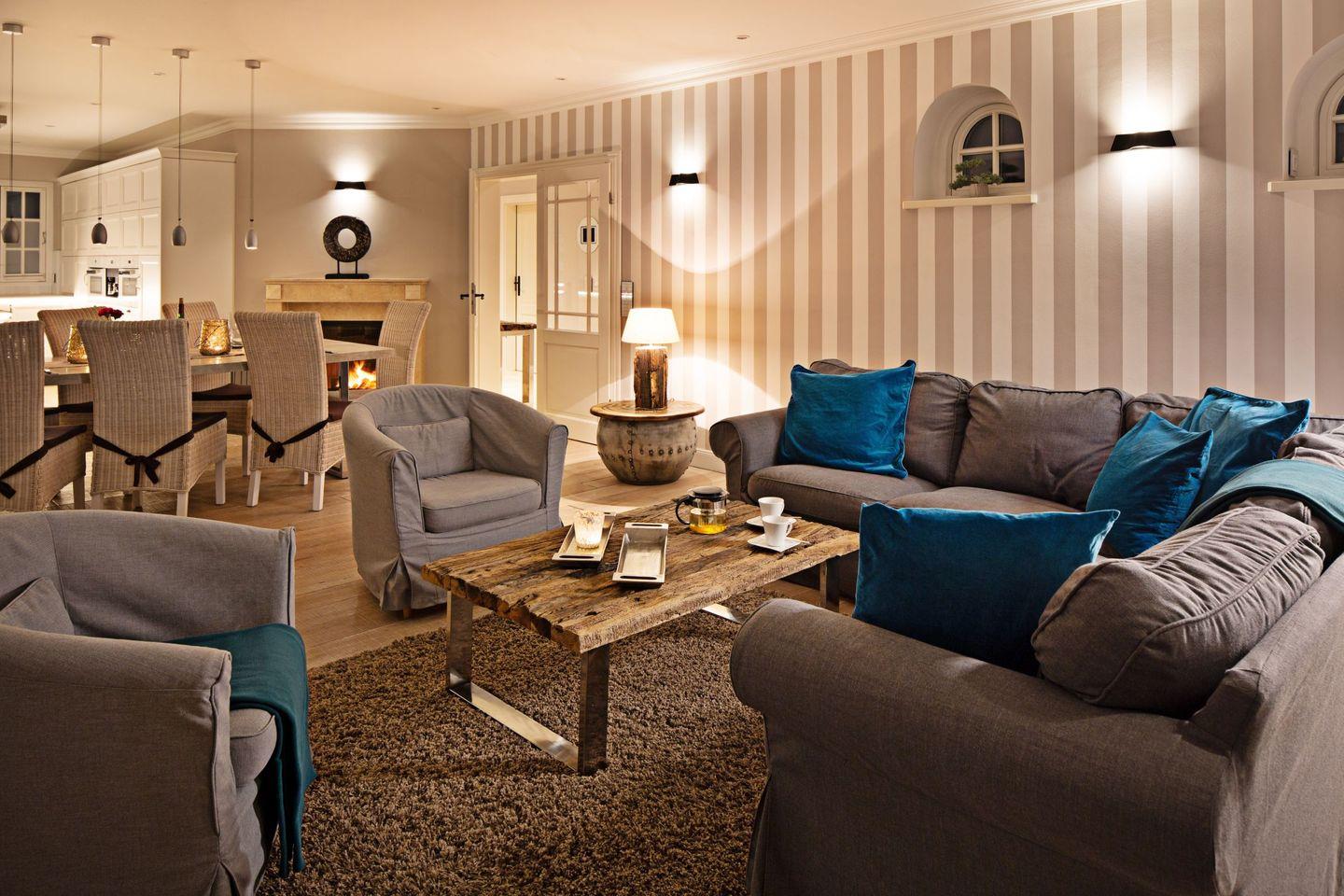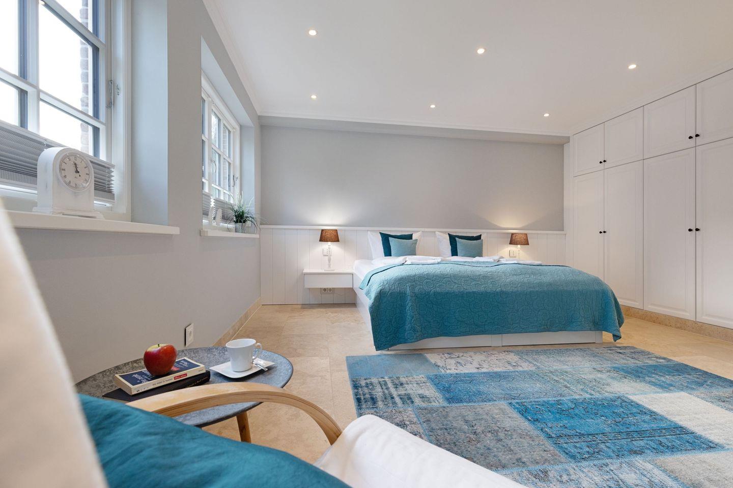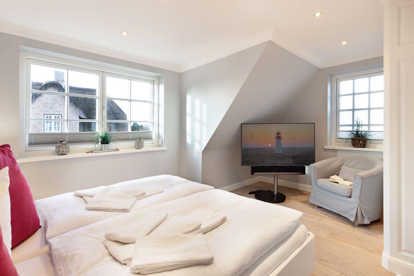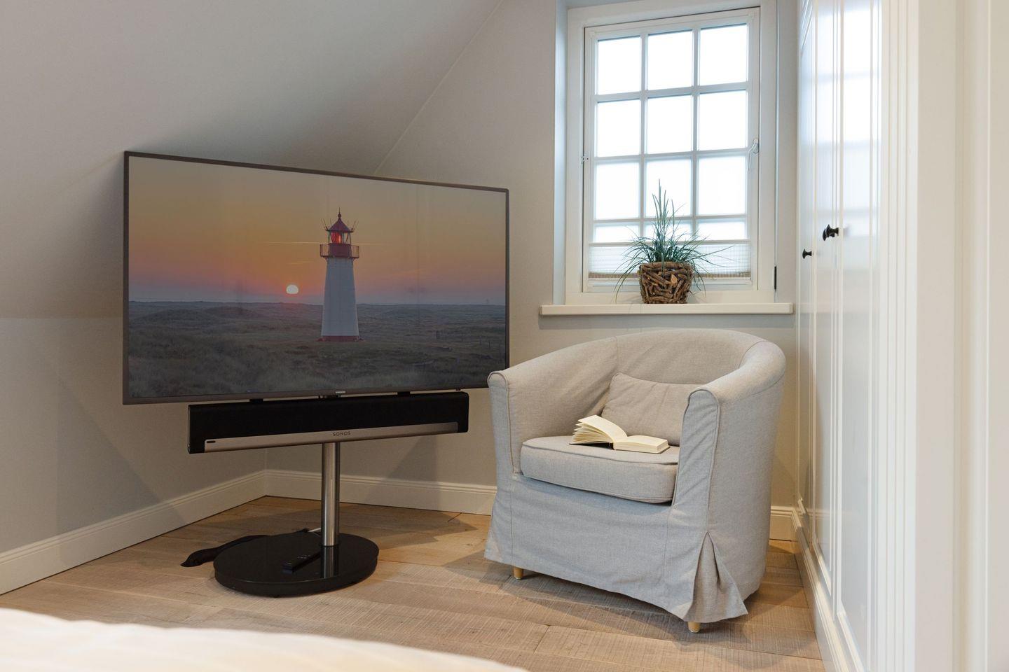 Die Syltresidenz ist mit vier gemütlichen Schlafzimmern ausgestattet, die Ihnen höchster Schlafkomfort bieten. Jedes Zimmer ist liebevoll eingerichtet und sorgt für eine entspannte Atmosphäre. Mit drei modernen Badezimmern und einem Gäste-WC müssen Sie sich nie um lange Wartezeiten kümmern – ideal für einen erholsamen Urlaub mit mehreren Personen. Das offene Wohnzimmer ist das Herzstück der Wohnung, ausgestattet mit einer komfortablen Sofaecke, einem modernen Kaminofen und einem Entertainment-Bereich mit insgesamt sechs Fernsehern und einer HiFi-Anlage, die für gemütliche Abende sorgen.