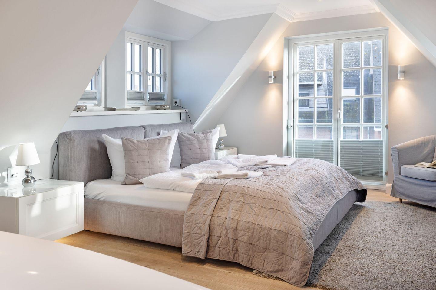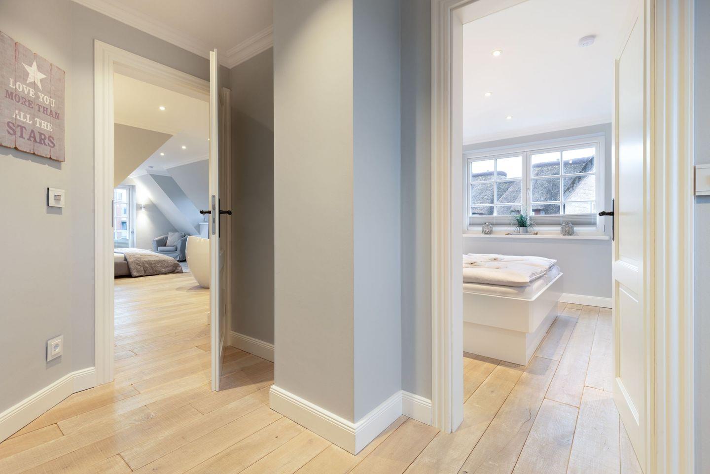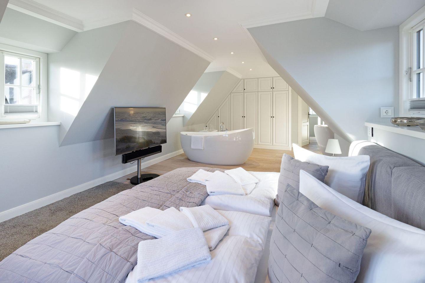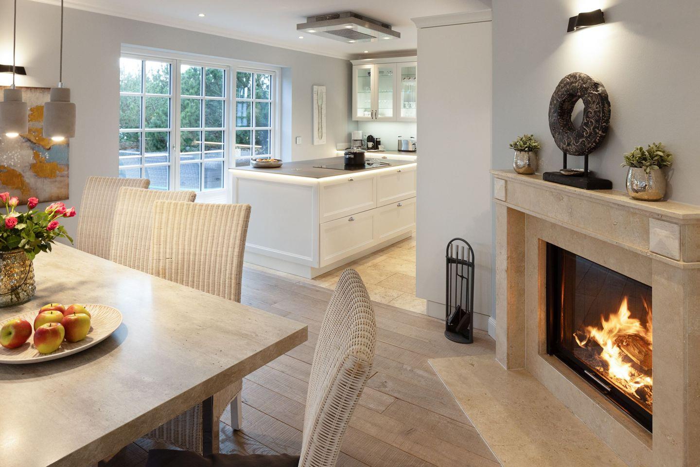 Die Syltresidenz ist mit vier gemütlichen Schlafzimmern ausgestattet, die Ihnen höchster Schlafkomfort bieten. Jedes Zimmer ist liebevoll eingerichtet und sorgt für eine entspannte Atmosphäre. Mit drei modernen Badezimmern und einem Gäste-WC müssen Sie sich nie um lange Wartezeiten kümmern – ideal für einen erholsamen Urlaub mit mehreren Personen. Das offene Wohnzimmer ist das Herzstück der Wohnung, ausgestattet mit einer komfortablen Sofaecke, einem modernen Kaminofen und einem Entertainment-Bereich mit insgesamt sechs Fernsehern und einer HiFi-Anlage, die für gemütliche Abende sorgen.