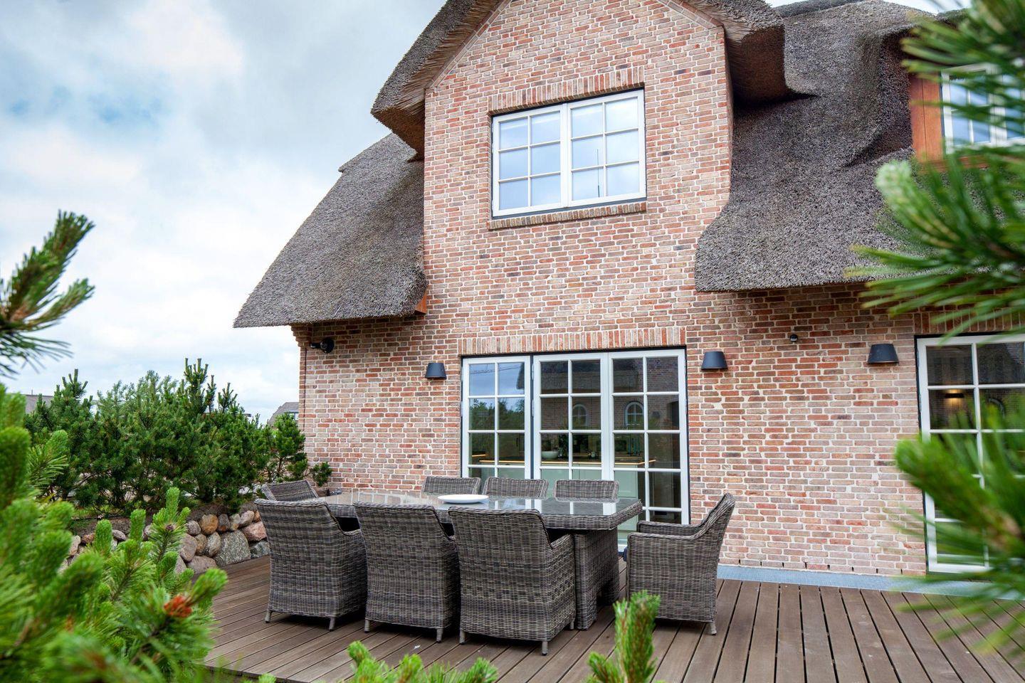 Hochwertig ausgestattete Neubau-Friesendoppelhaushälfte unter Reet mit Sauna, Terrasse und Strandkorb für bis zu acht Personen.