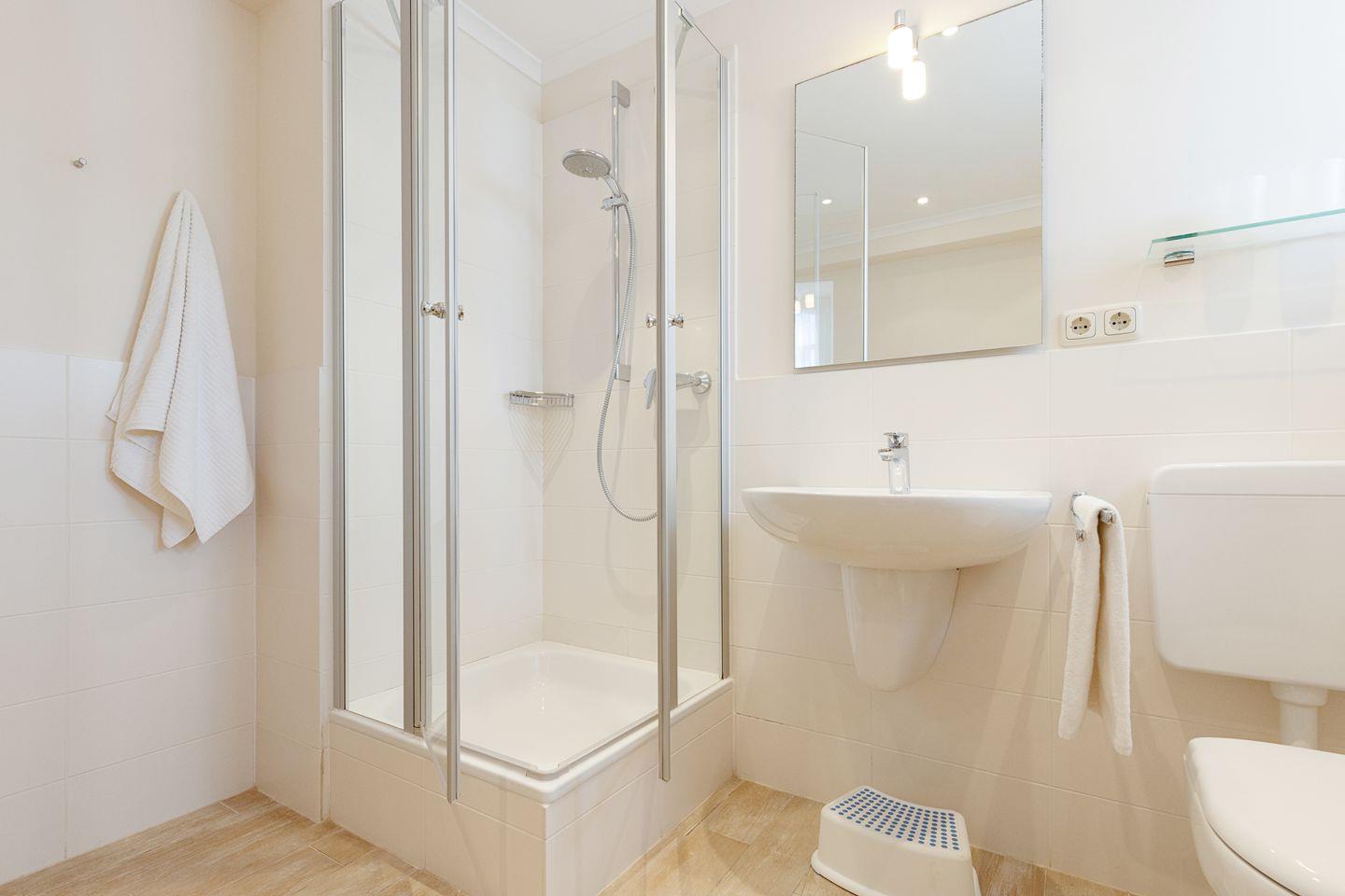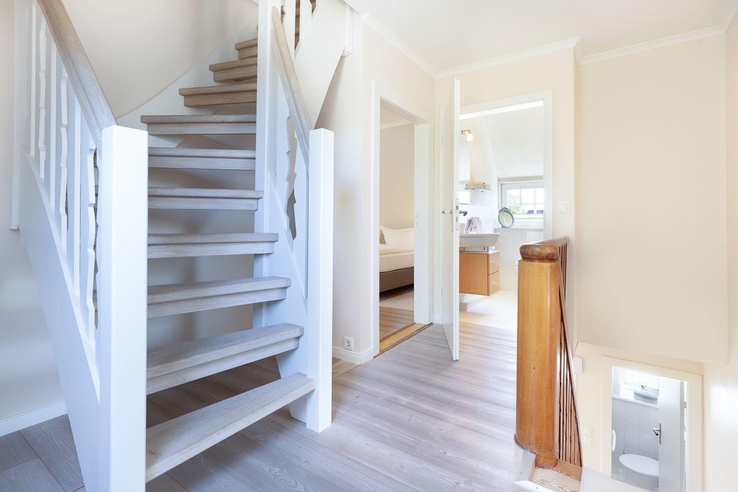 Zwei Badezimmer mit Dusche und ein Gäste-WC, sowie die große Küche mit guter Ausstattung. Sie haben einen eigenen Garten mit großer Liegewiese und Strandkorb und eine überdachte Terrasse. Ein Einstellplatz für Fahrräder und 2 PKW-Stellplätze befinden sich am Haus.