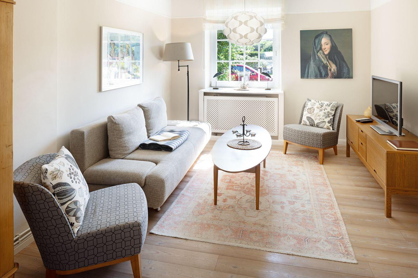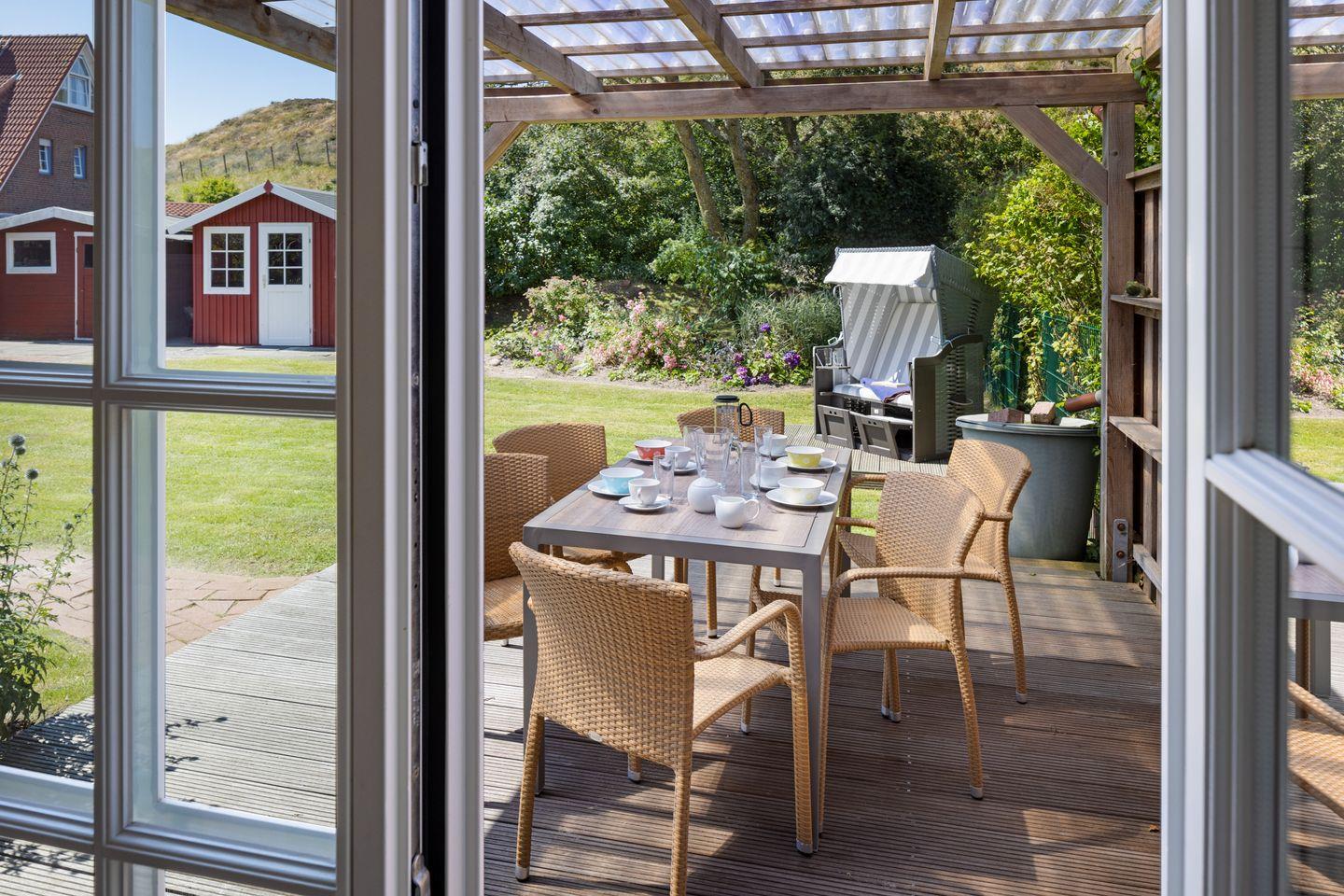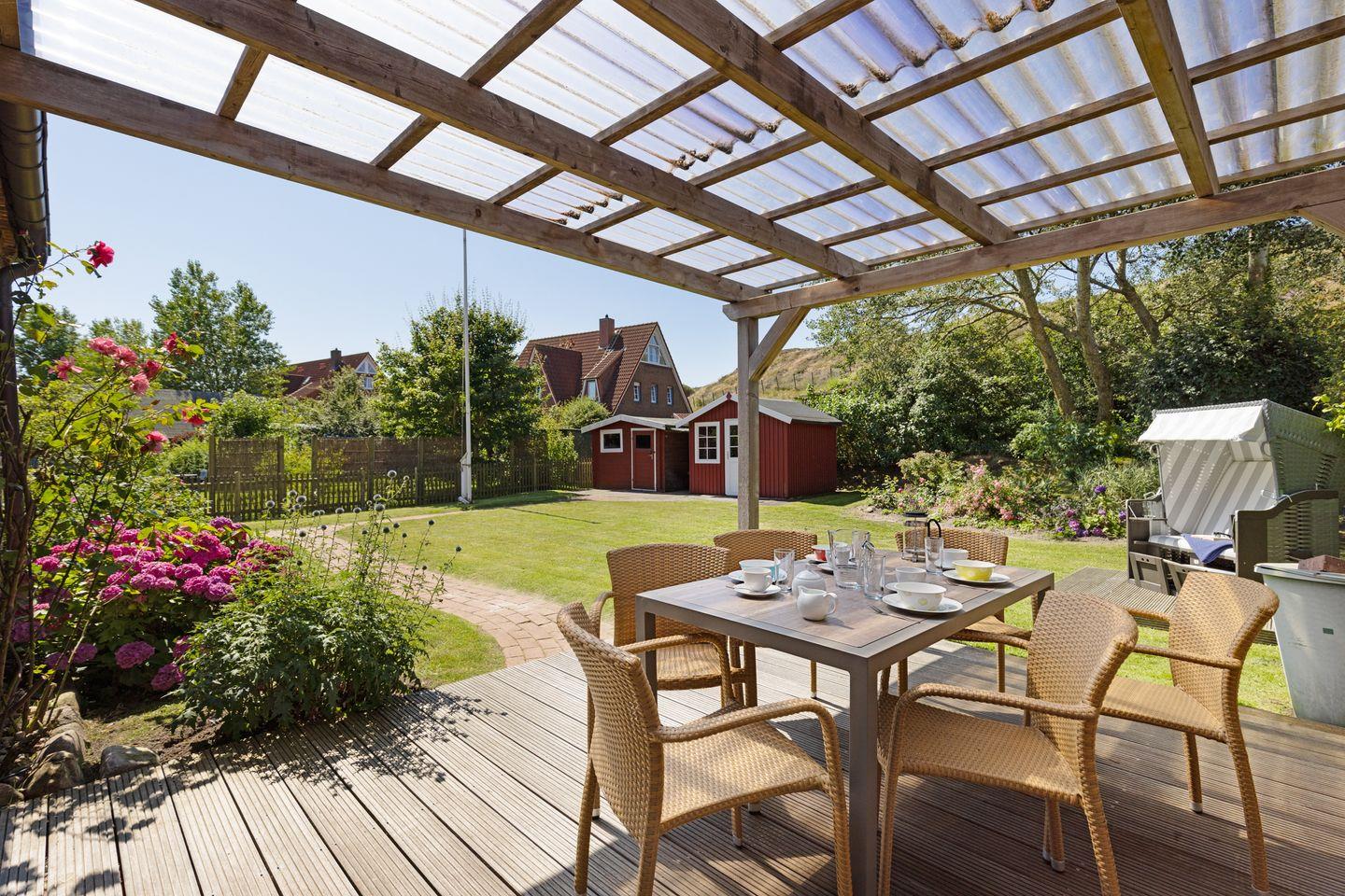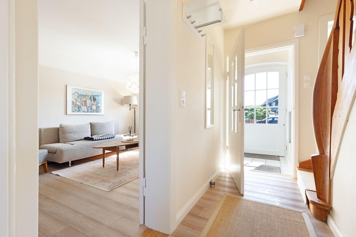 Individuell eingerichtetes Ferienreihenhaus mit Holzfußböden ausgestattet für bis zu sieben Personen mit Garten, großer Liegewiese und Strandkorb.