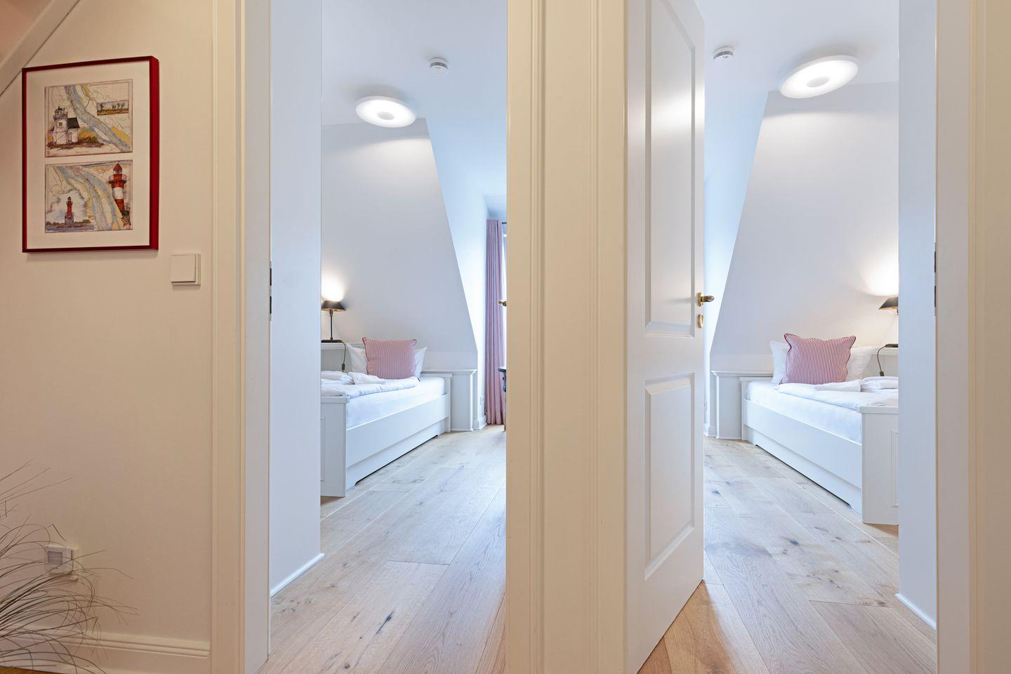 In der ersten Etage befindet sich ein Schlafzimmer mit Doppelbett, zwei Zimmer mit jeweils einem Einzelbett und ein Bad.