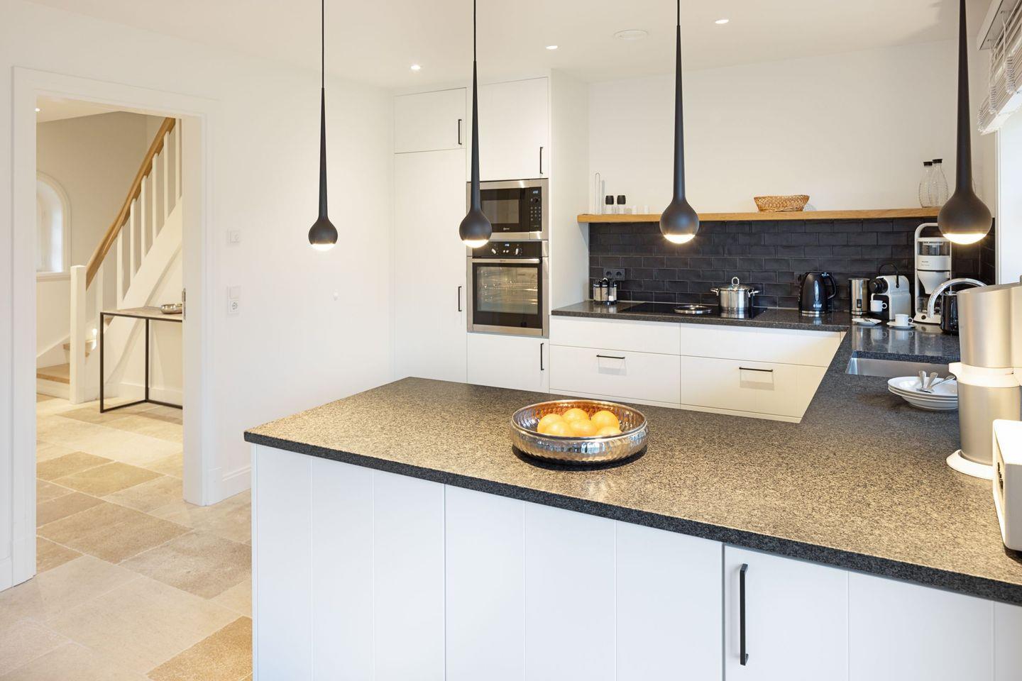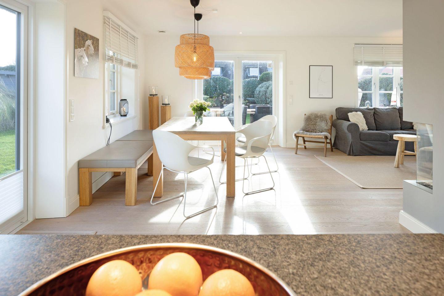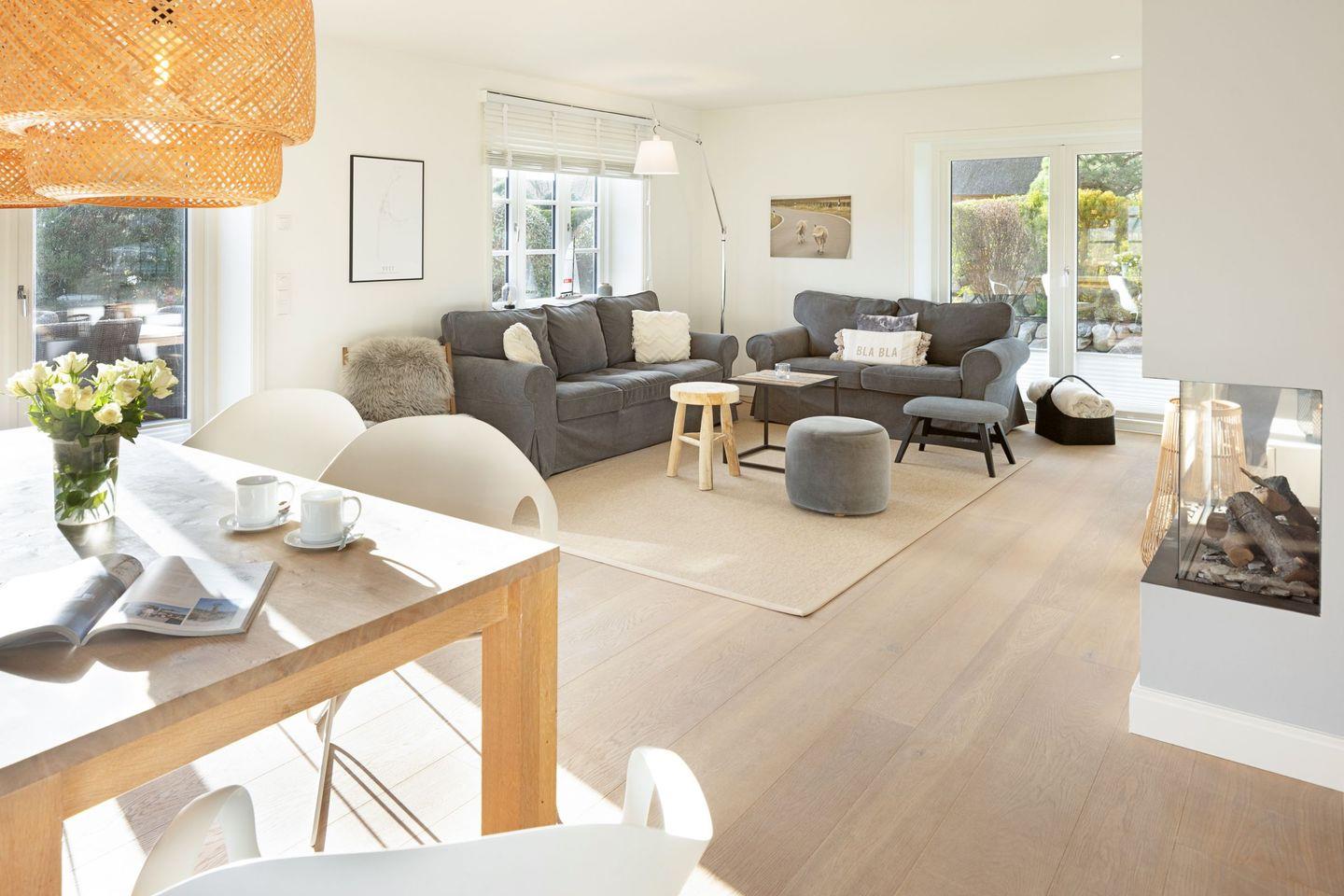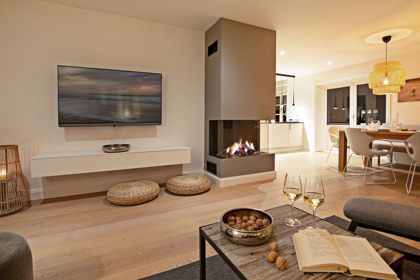 Im Erdgeschoss befindet sich der große Wohnbereich mit offener Küche, der sich um den an drei Seiten einsehbaren, verglasten Gas-Kamin anordnet. Über drei Terrassentüren gelangen Sie in den Garten mit Terrasse. Im 1 Obergeschoss finden Sie zwei Schlafzimmer mit Doppelbett, ein Duschbad und ein weiteres Bad mit Dusche und freistehender Wanne.