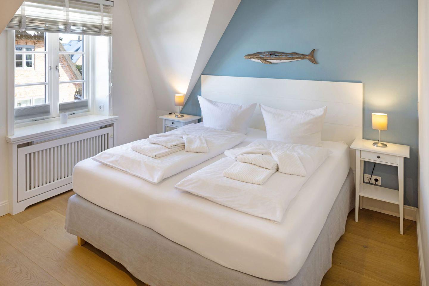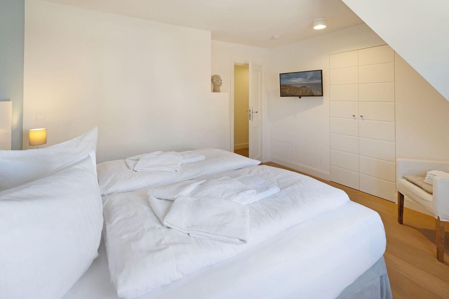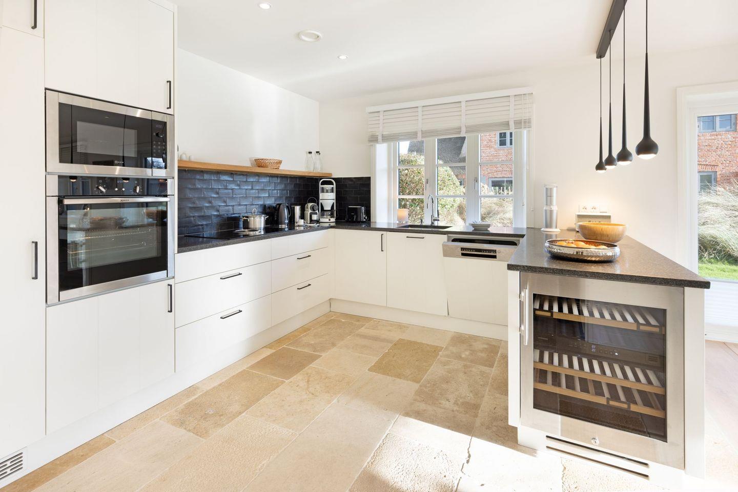 Im Erdgeschoss befindet sich der große Wohnbereich mit offener Küche, der sich um den an drei Seiten einsehbaren, verglasten Gas-Kamin anordnet. Über drei Terrassentüren gelangen Sie in den Garten mit Terrasse. Im 1 Obergeschoss finden Sie zwei Schlafzimmer mit Doppelbett, ein Duschbad und ein weiteres Bad mit Dusche und freistehender Wanne.