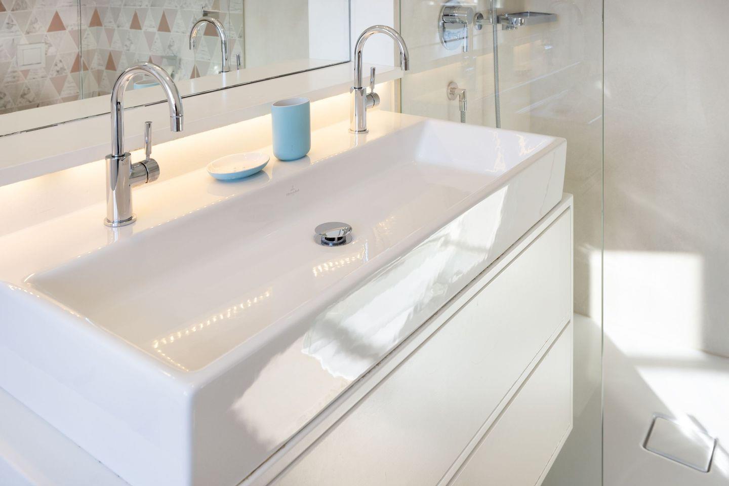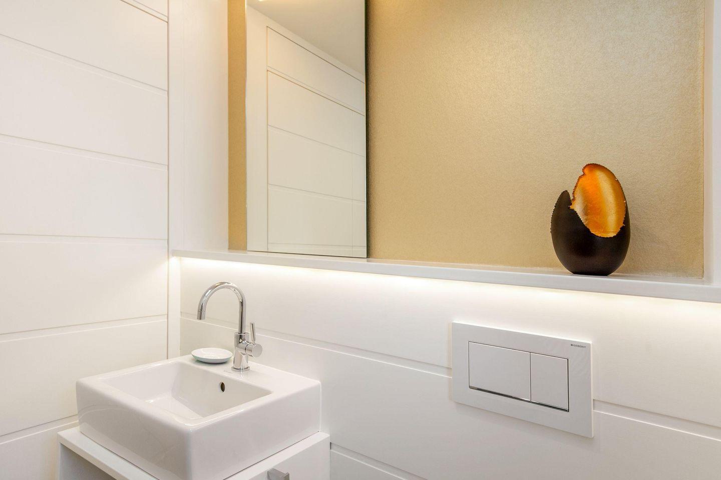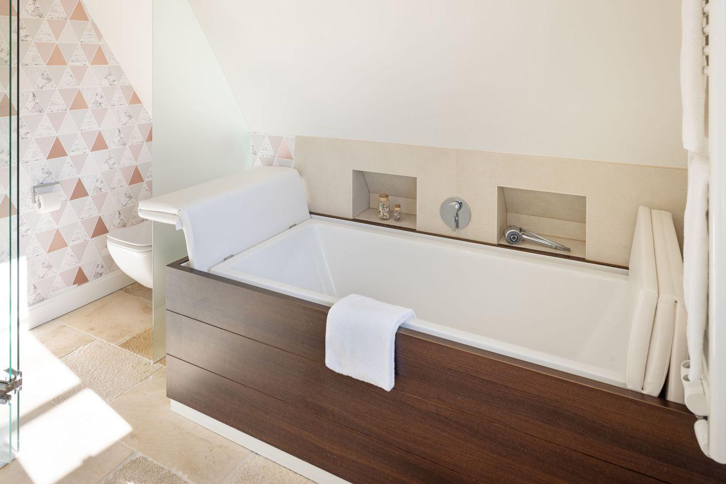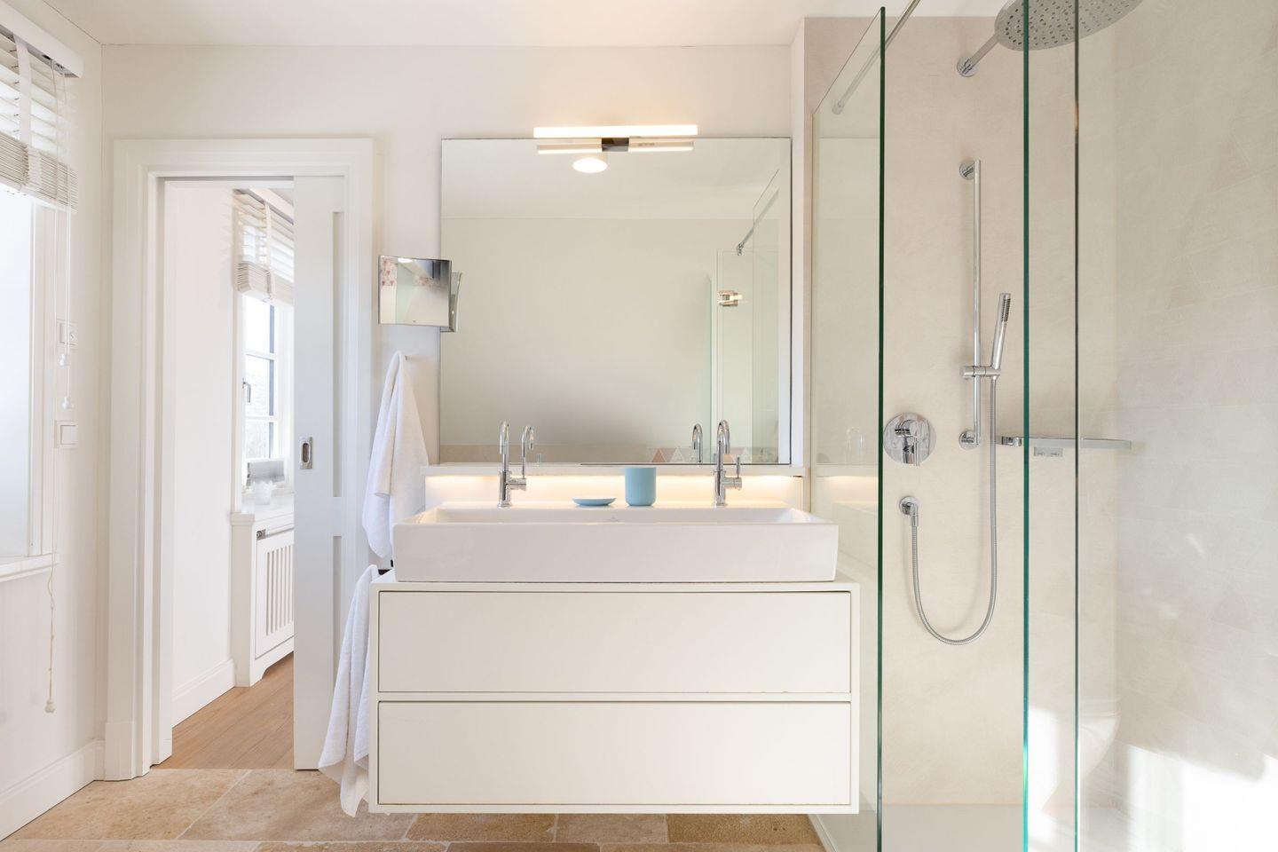 Im Erdgeschoss befindet sich der große Wohnbereich mit offener Küche, der sich um den an drei Seiten einsehbaren, verglasten Gas-Kamin anordnet. Über drei Terrassentüren gelangen Sie in den Garten mit Terrasse. Im 1 Obergeschoss finden Sie zwei Schlafzimmer mit Doppelbett, ein Duschbad und ein weiteres Bad mit Dusche und freistehender Wanne.