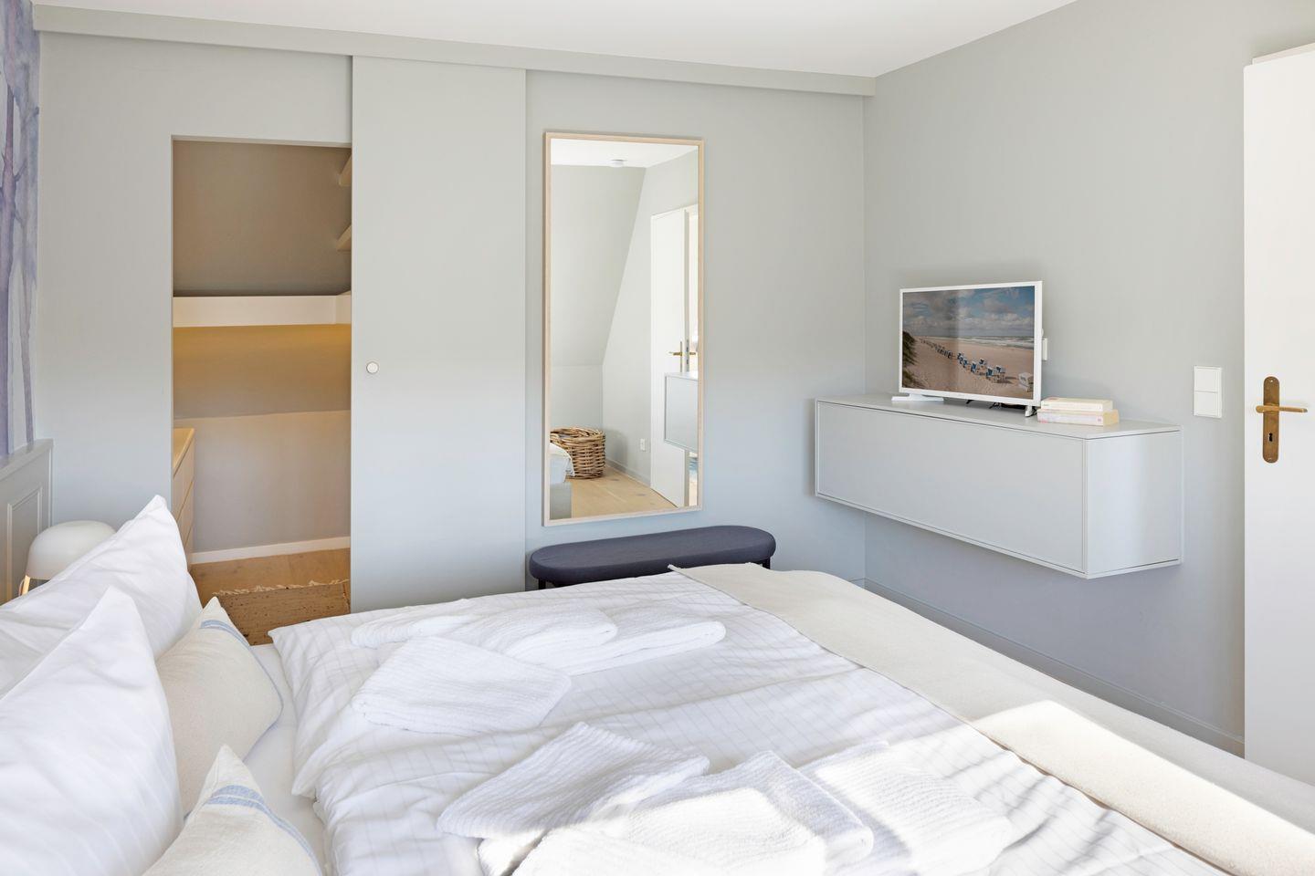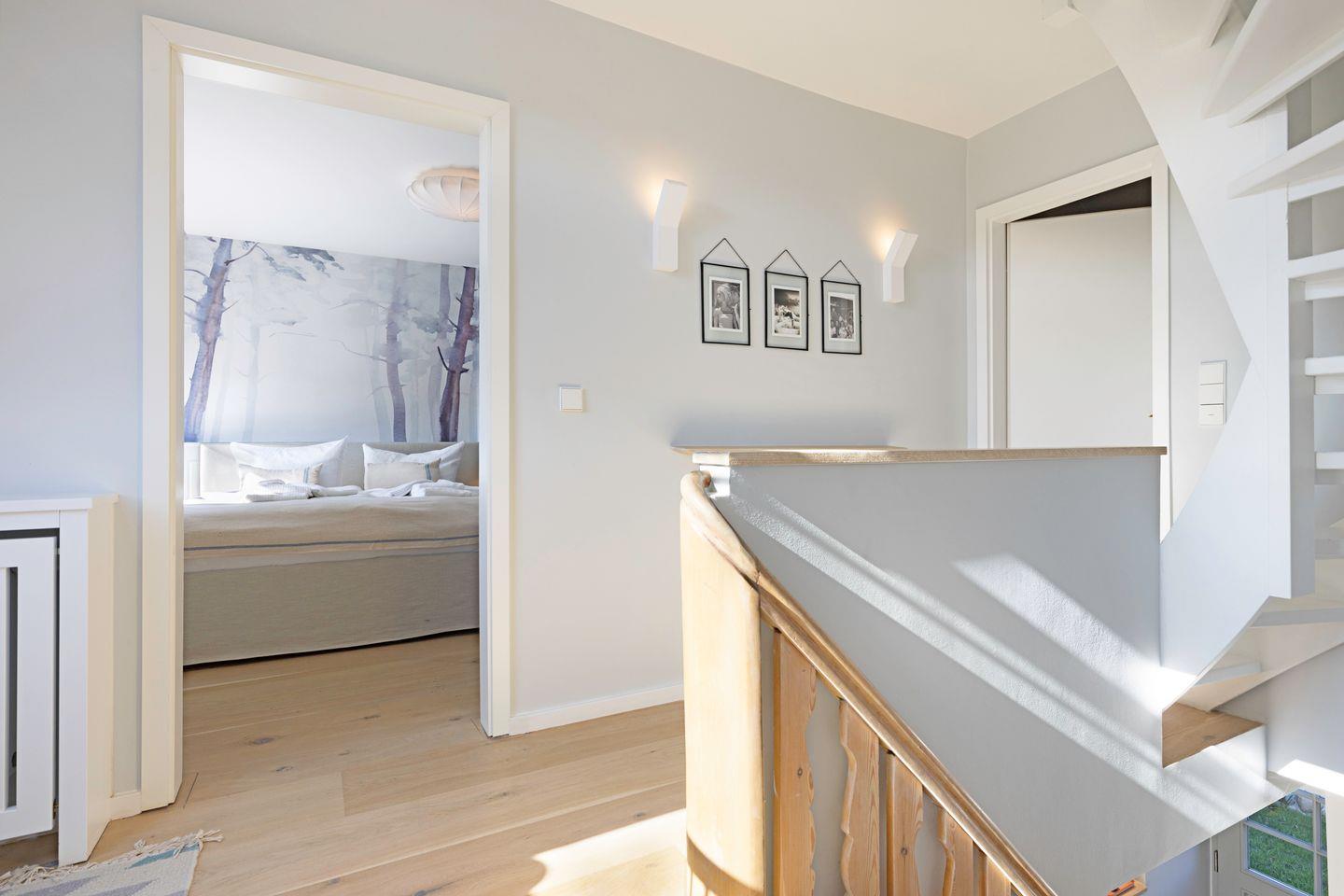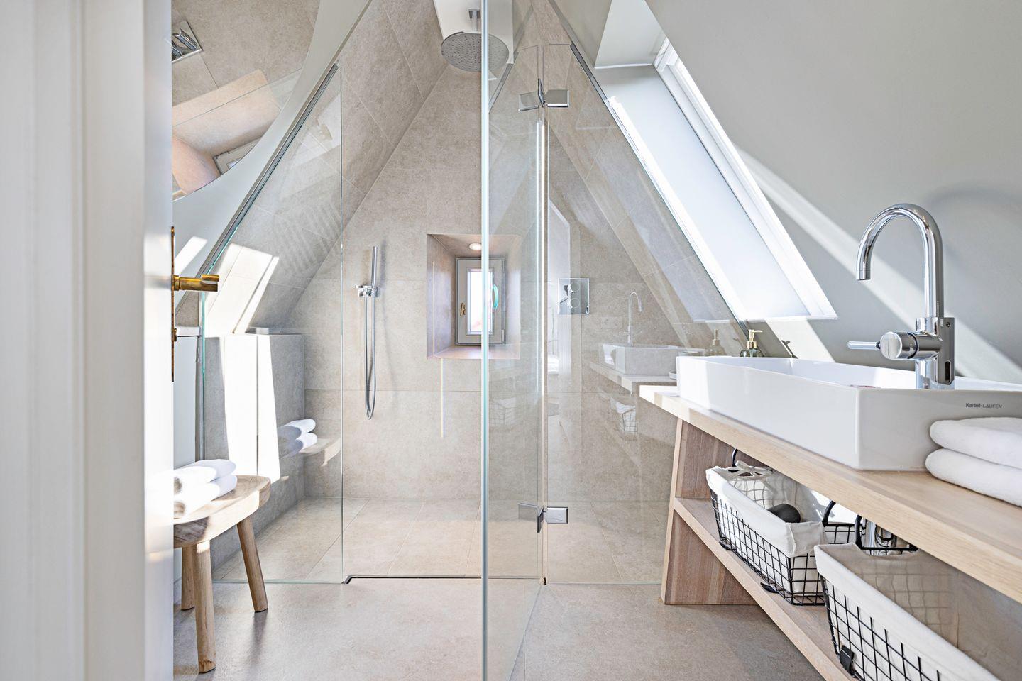 Das Haus verfügt über zwei Schlafräume mit jeweils Doppelbett (-eines im 1. Stock, eines im DG) und einem Schlafraum mit einem Einzelbett im 1. Stock. Ein edles Duschbad, sowie ein Wannenbad (1. Stock) vervollständigen Ihr Urlaubsdomizil.
