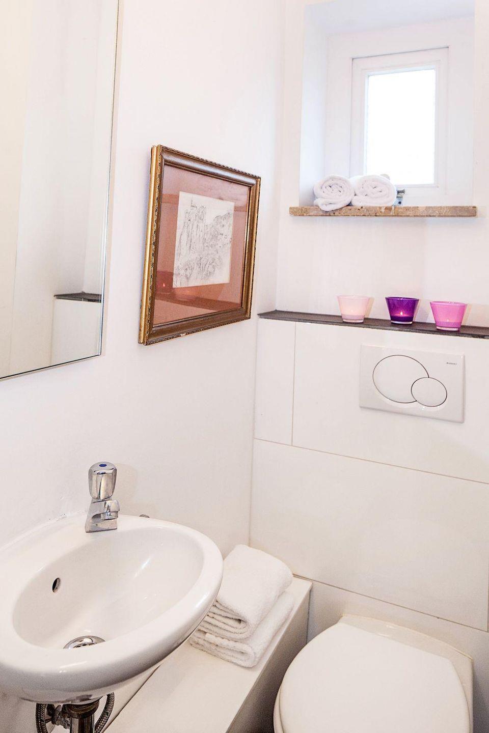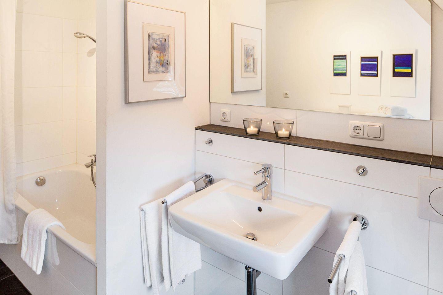 Im ersten OG befindet sich ein zweites Bad am Flur. Außerdem bietet das Haus Strandgut ein Gäste-WC welches sich im Erdgeschoss befindet.