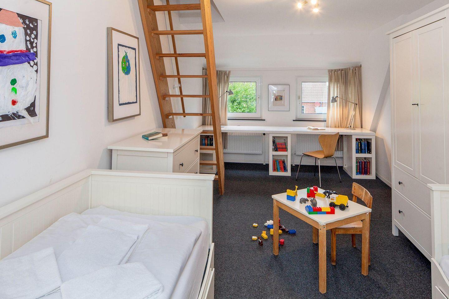 Als Familiendomizil eignet sich das Haus Strandgut besonders gut, da es über zwei Schlafzimmer (eines davon im EG und das im ersten OG mit Bad en suite) mit Doppelbett und ein kindgerechtes Zimmer mit zwei Einzelbetten verfügt.