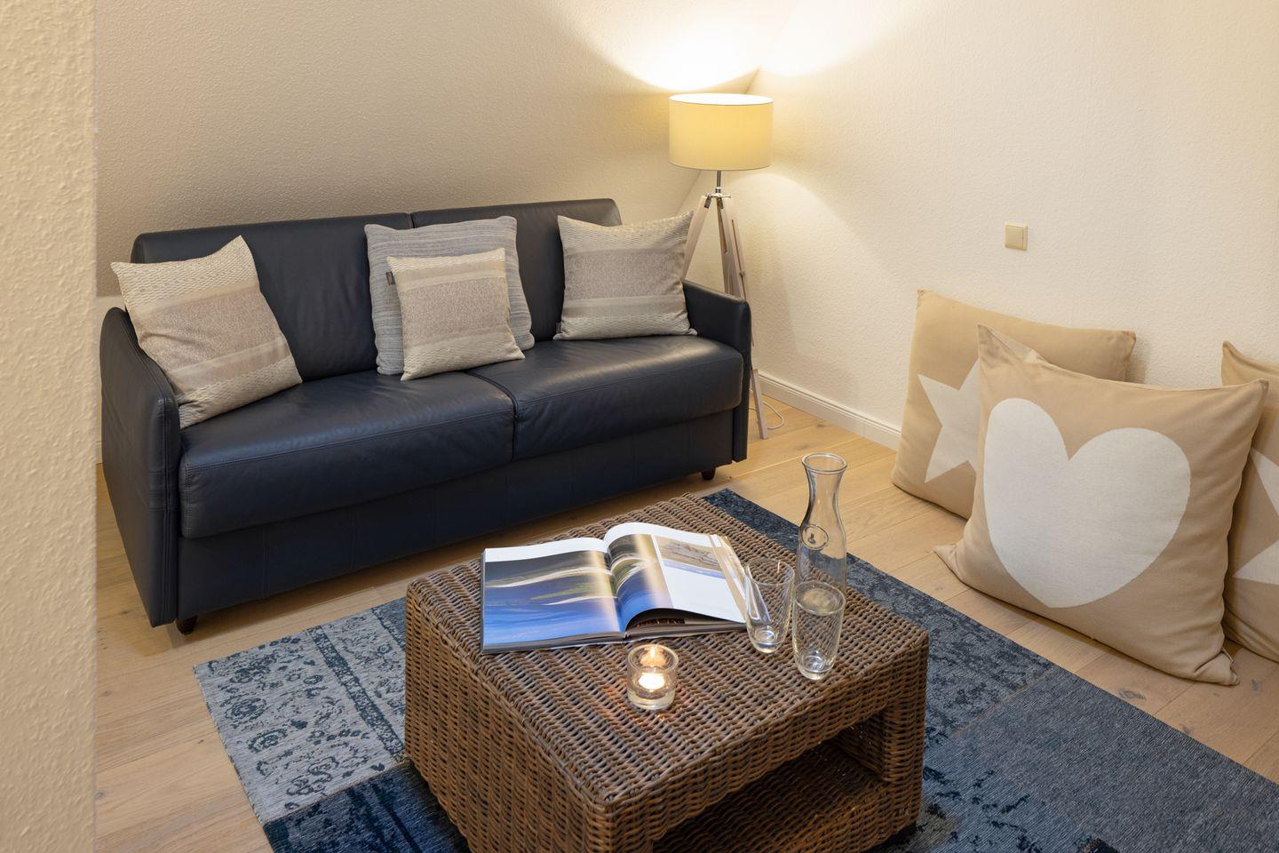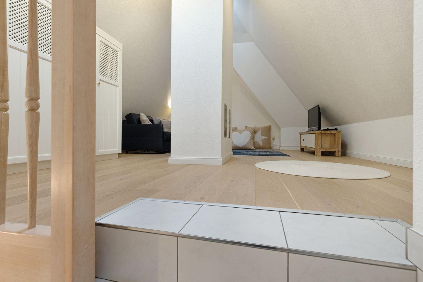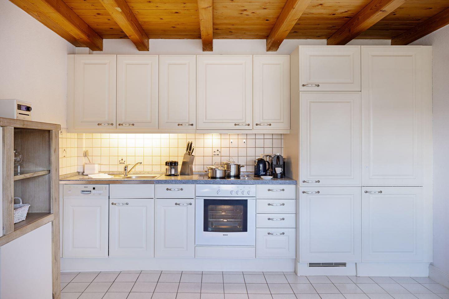 Die Wohnung ist geschmackvoll und modern eingerichtet, wobei Komfort und Gemütlichkeit großgeschrieben werden. Der offene Wohnbereich mit einer bequemen Sofaecke lädt zum Entspannen ein, während Sie den Blick auf die Landschaft genießen. Zwei Fernseher mit internationalen Kanälen, WLAN und ein hochwertiges Soundsystem sorgen dafür, dass Sie auch während Ihres Urlaubs unterhalten werden. Die helle und funktionale Küche ist mit modernen Geräten ausgestattet – von der Nespresso-Maschine über einen Induktionsherd bis hin zu einem Geschirrspüler, alles ist vorhanden, um kulinarische Köstlichkeiten zu zaubern. Der angrenzende Essbereich bietet genügend Platz für gesellige Mahlzeiten.