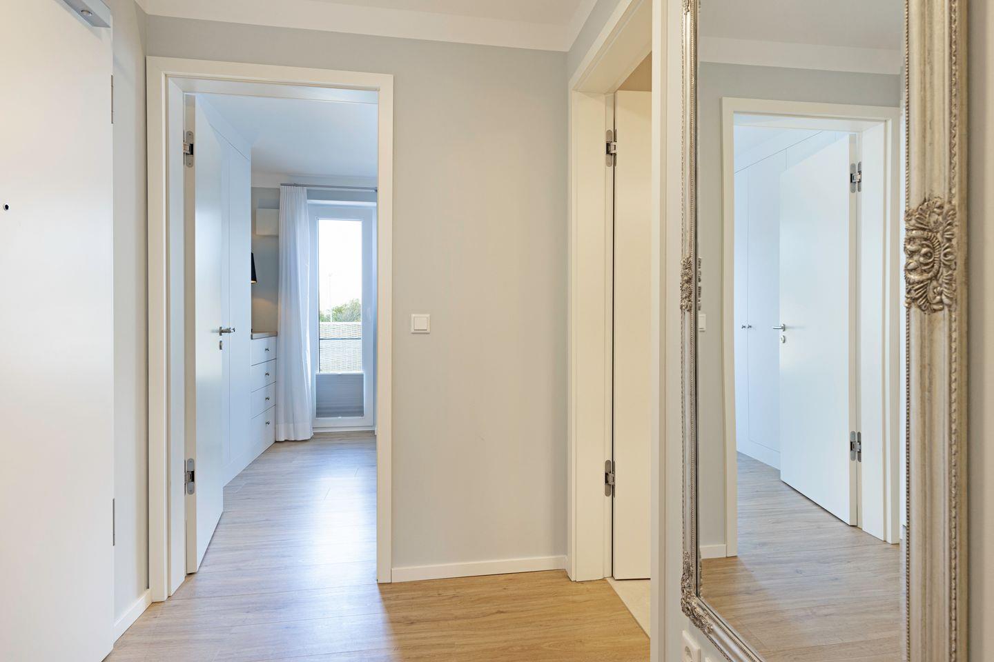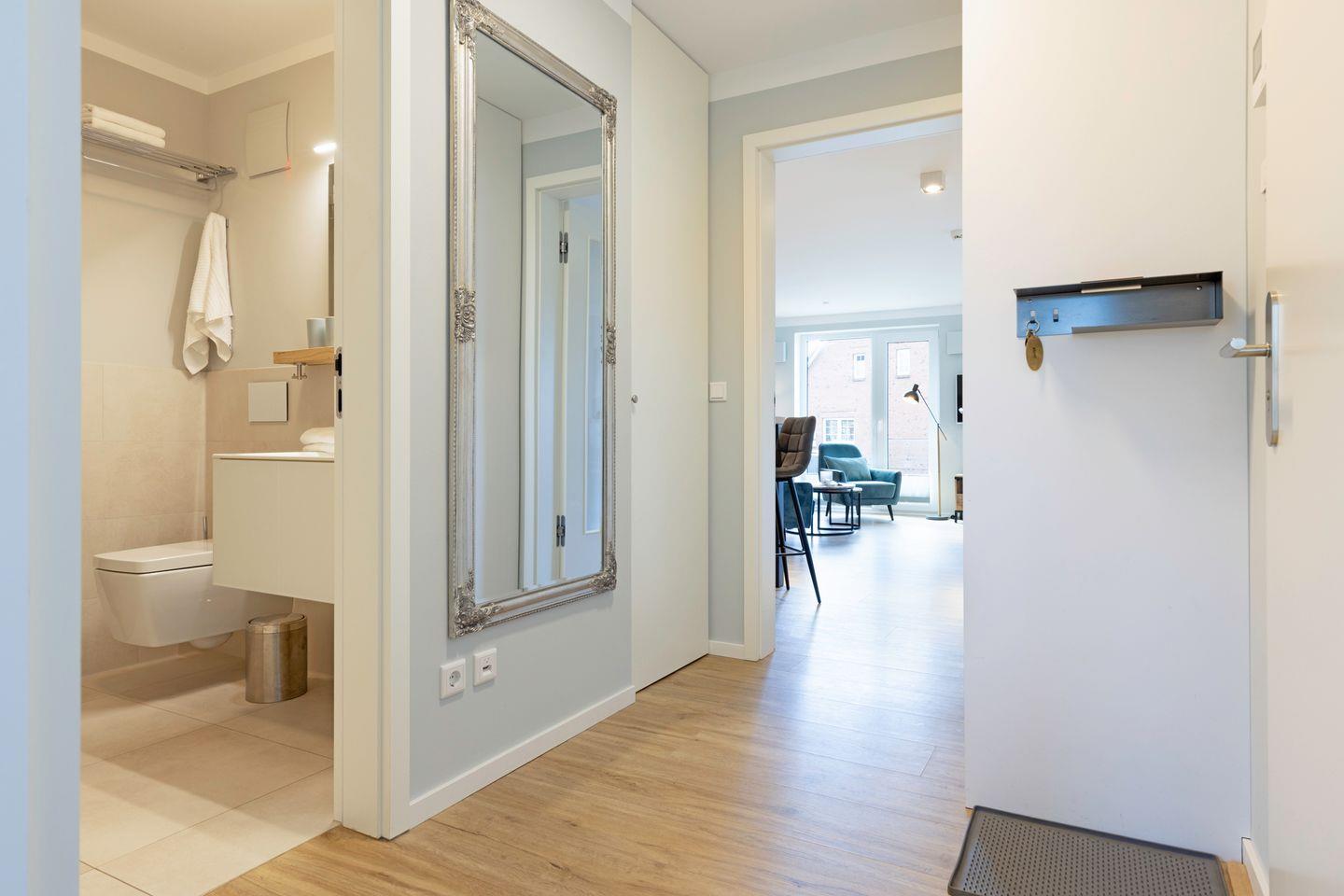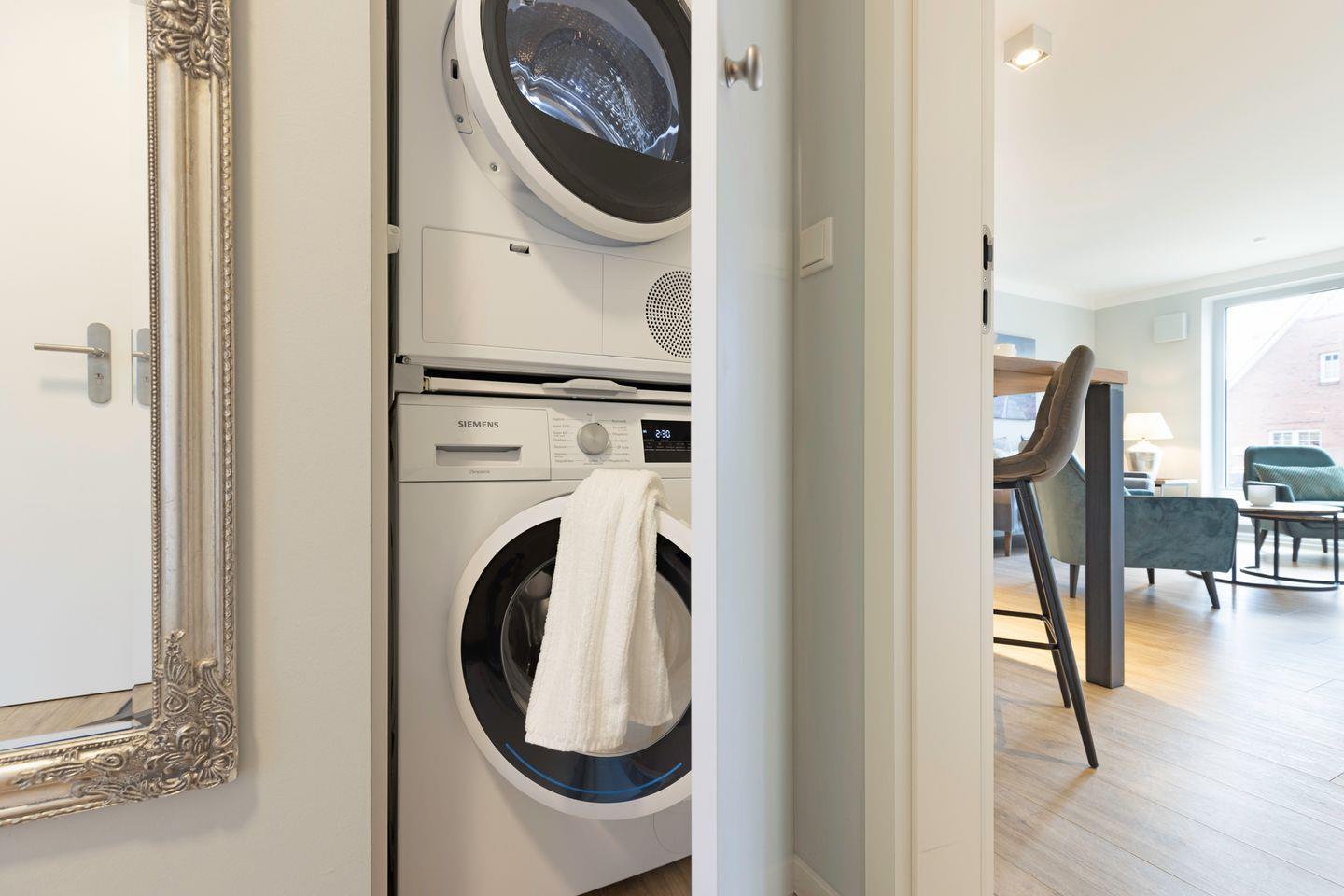 Im Flur stehen eine Waschmaschine und ein Trockner zur Nutzung bereit. Außerdem gibt es einen Ganzkörperspiegel und eine Garderobe.