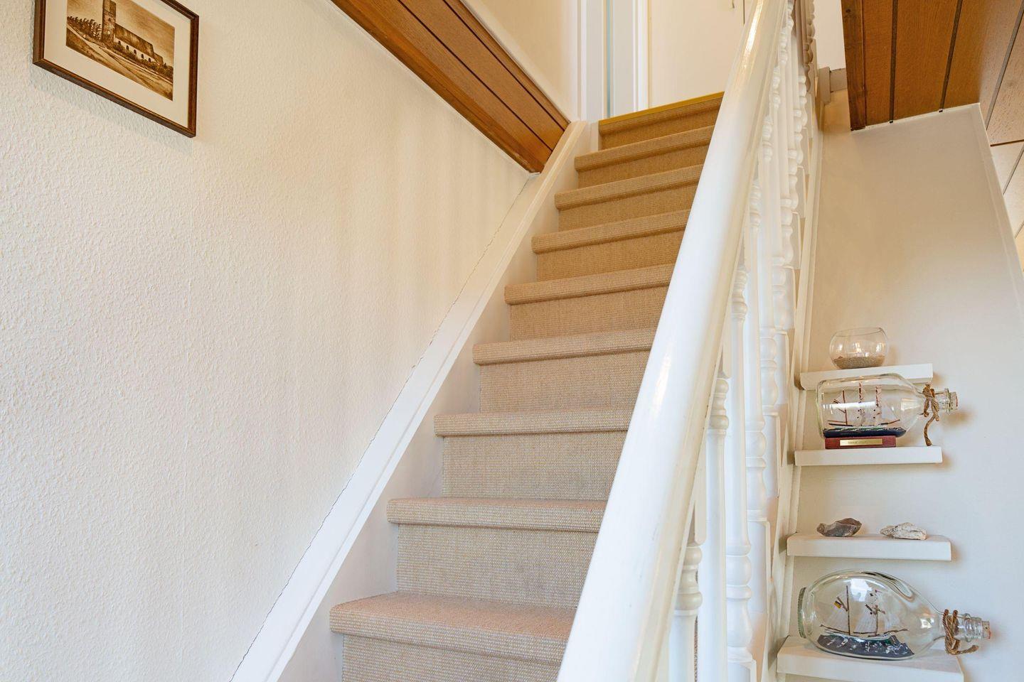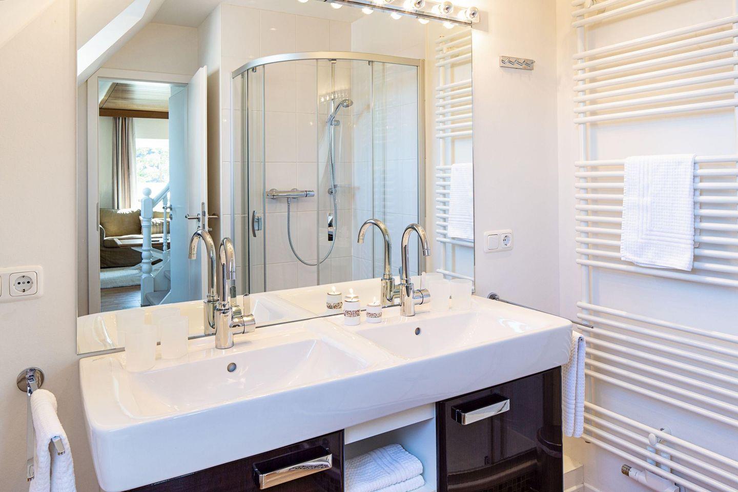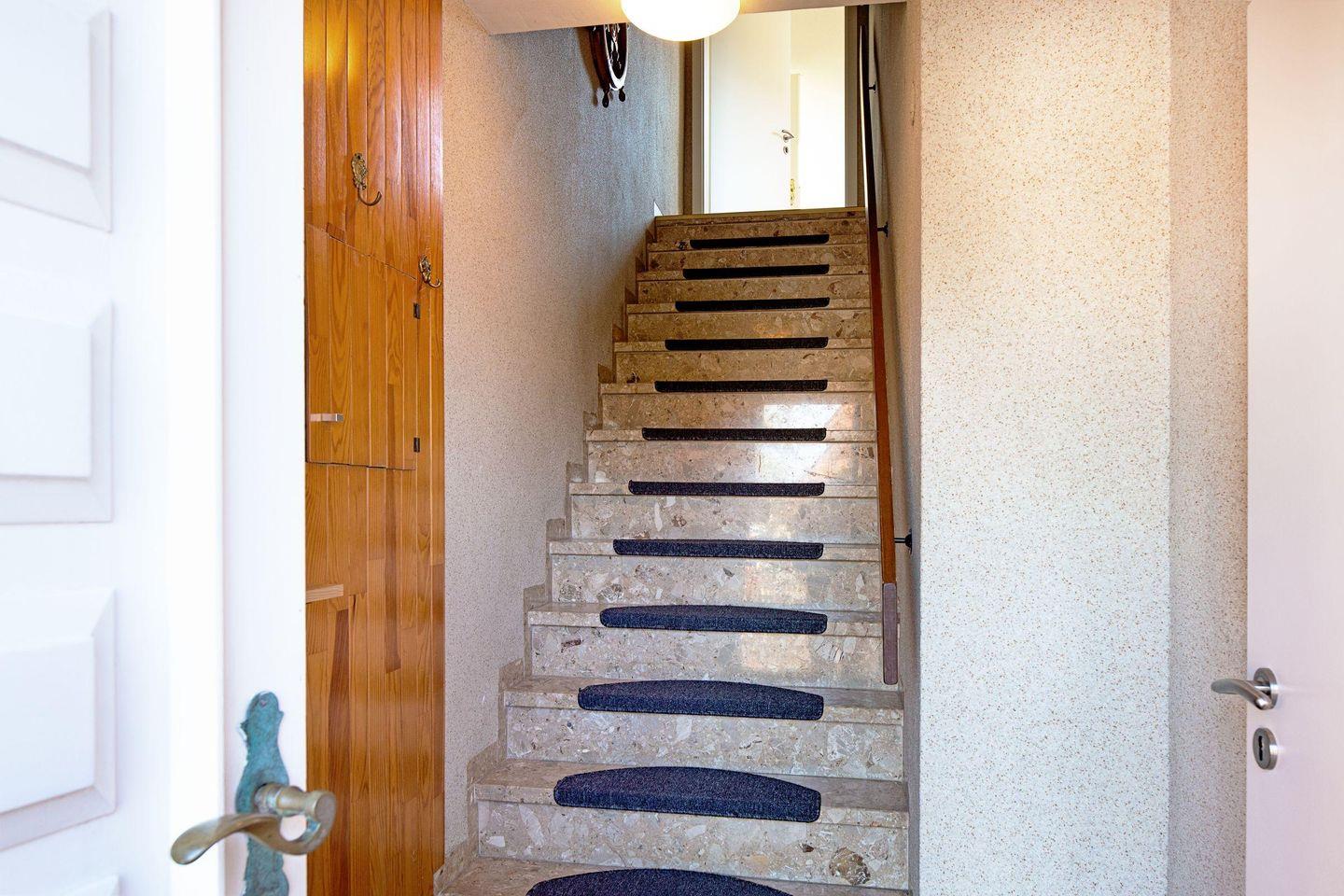 Im 1. Obergeschoss befindet sich die Küche, ein Schlafzimmer mit zwei Einzelbetten, das Ess- und Wohnzimmer, die separate Gästetoilette sowie das Badezimmer mit großer Dusche.