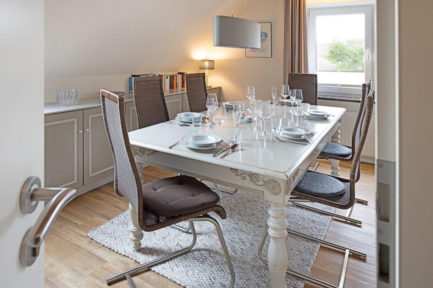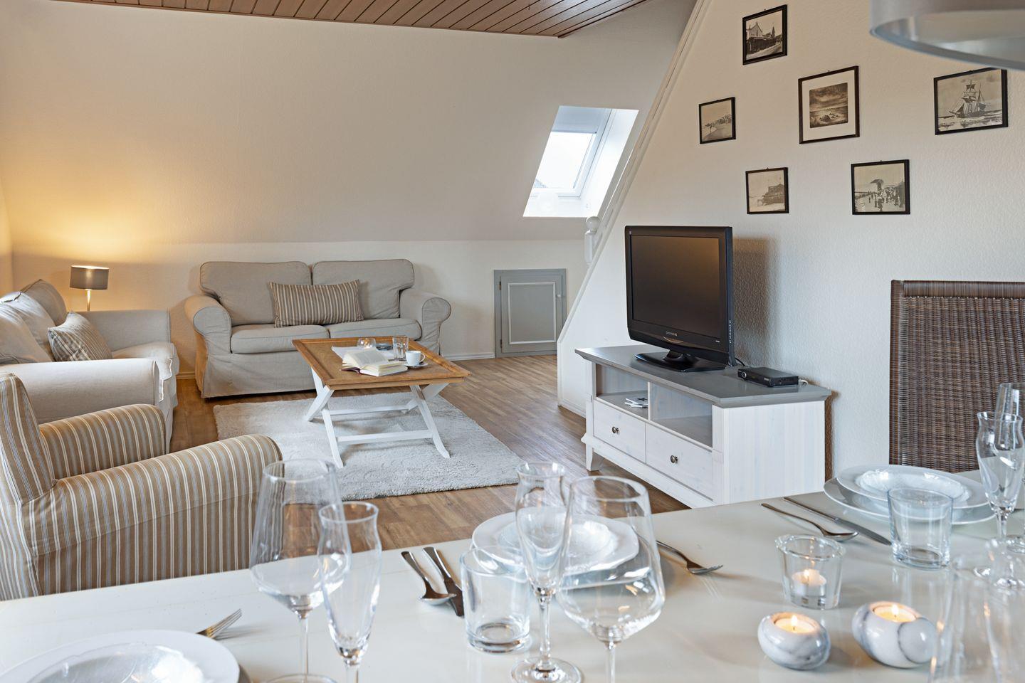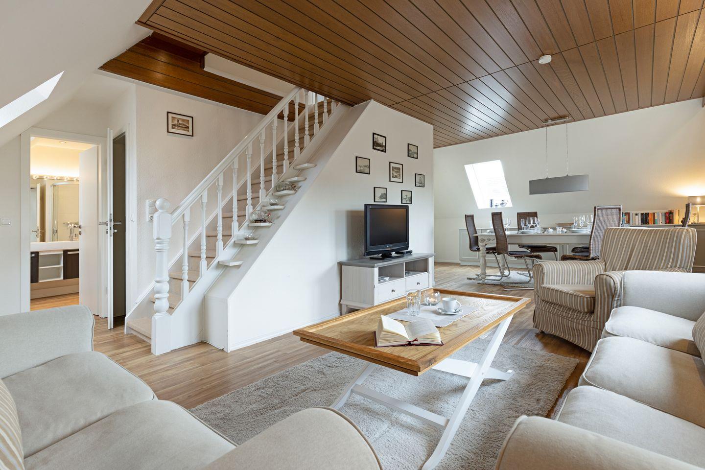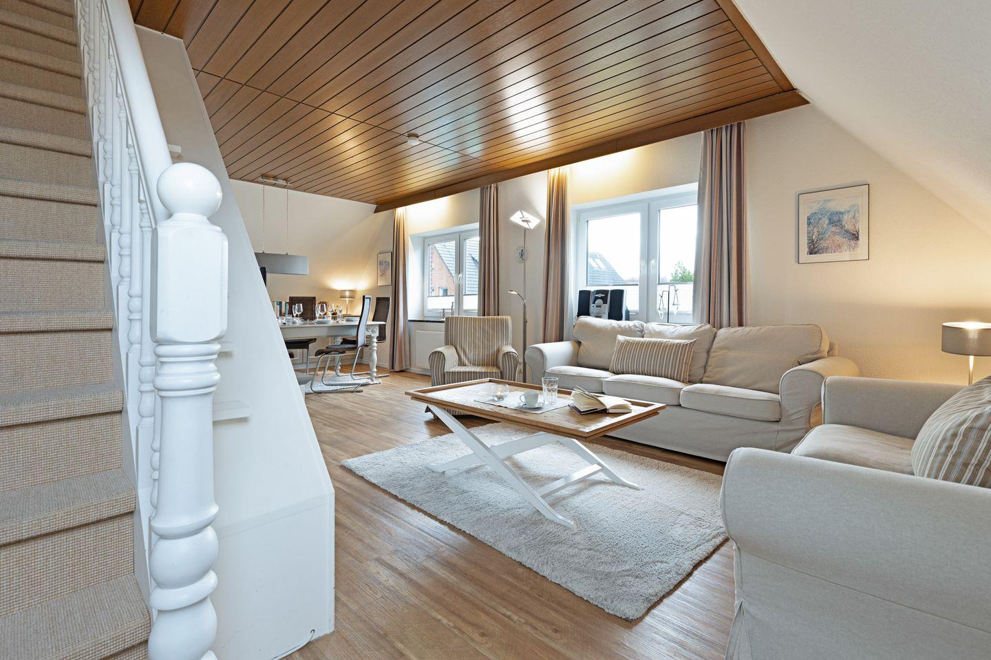 Das 102m² große Ferienappartement für bis zu sechs Personen erstreckt sich über zwei Ebenen mit Blick in die Lister Dünen und über das Wattenmeer bis hin nach Dänemark.