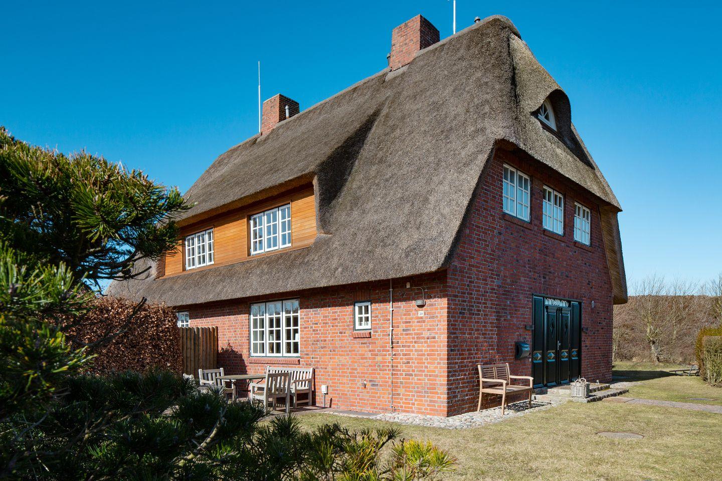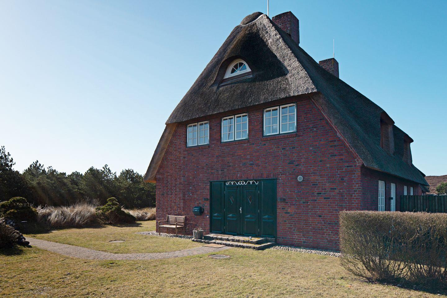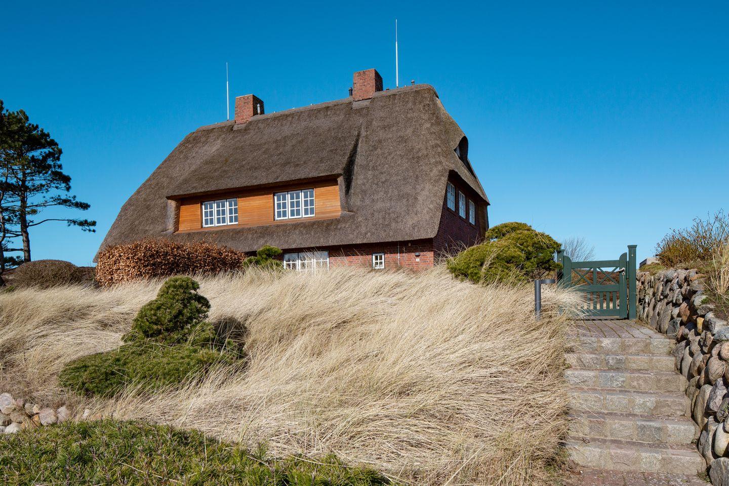Wunderschöne Reetdachhaushälfte am südlichen Ortsrand von List mit einzigartigem Weitblick über die traumhafte Sylter Dünen- und Heidelandschaft. Der große Garten (1600 qm) mit 3 Terrassen und die erhöhte Lage bieten ein Höchstmaß an Privatsphäre und Ruhe. Trotzdem sind Sie fußläufig schnell im Ortskern von List, wo Sie alles für den täglichen Bedarf sowie Restaurants, Ärzte etc. finden. Der Strand ist ebenfalls nur 700 m entfernt und mit dem hauseigenen Bollerwagen oder den Rollern auch für kleinere Kinder schnell zu erreichen. Das Haus wurde 2019 frisch renoviert. Es gibt 3 Schlafzimmer (1x ist unter dem Giebel und ist ein offenes Zimmer mit Zugang einer Treppe) , 2 Bäder, ein Gäste- WC, eine gemütliche Wohnküche, einen Kachelofen und Holzfußböden. Ein PKW Stellplatz ist auf dem Grundstück vorhanden.