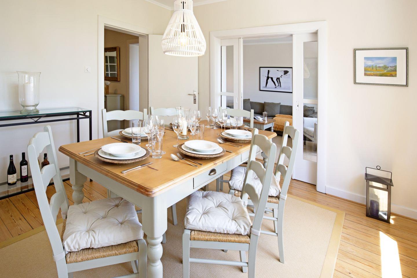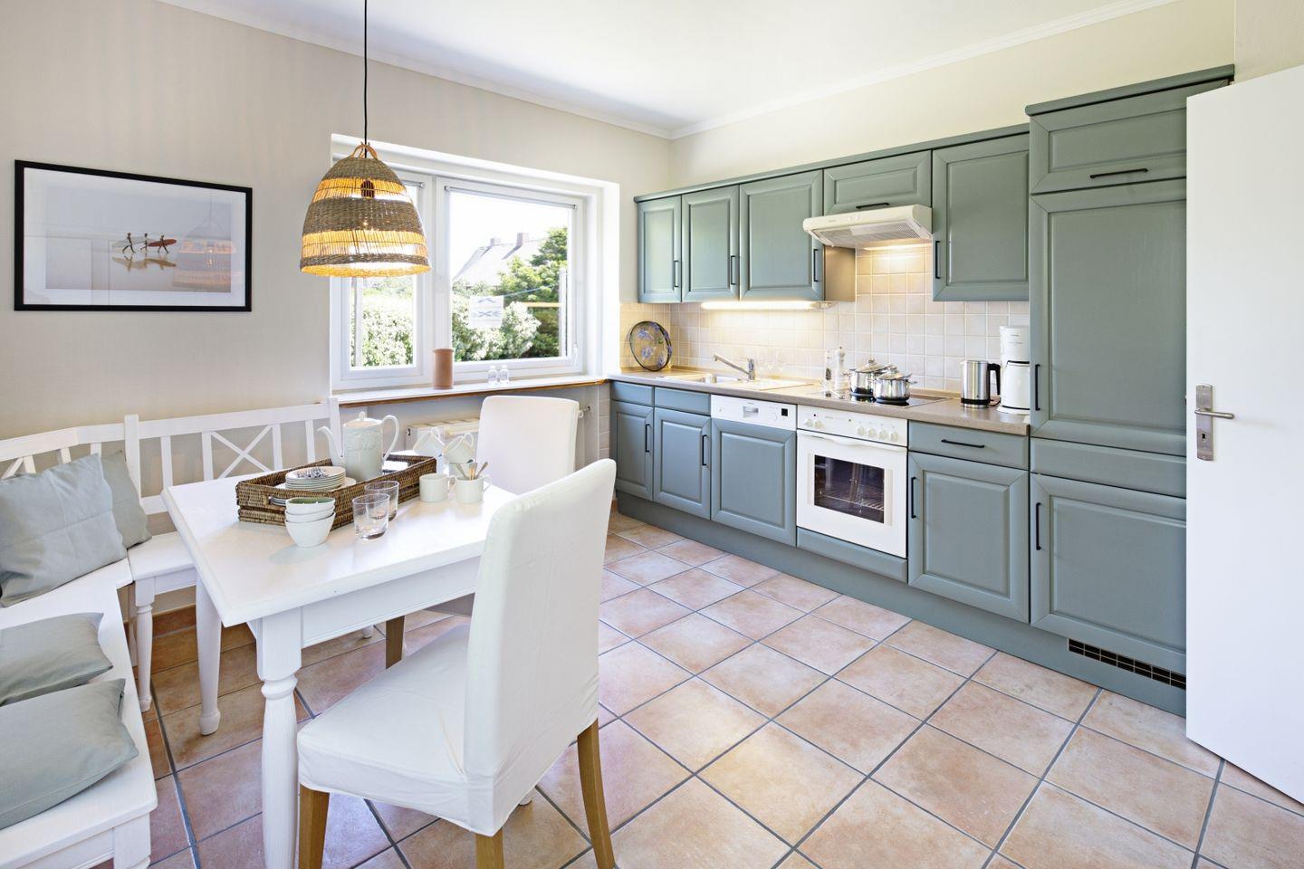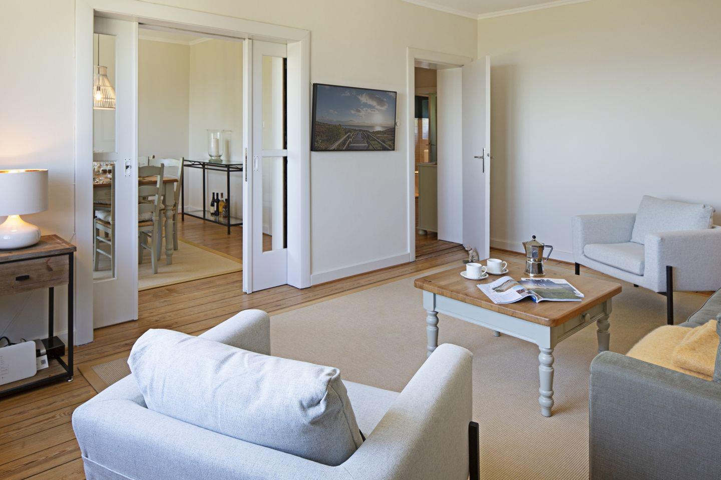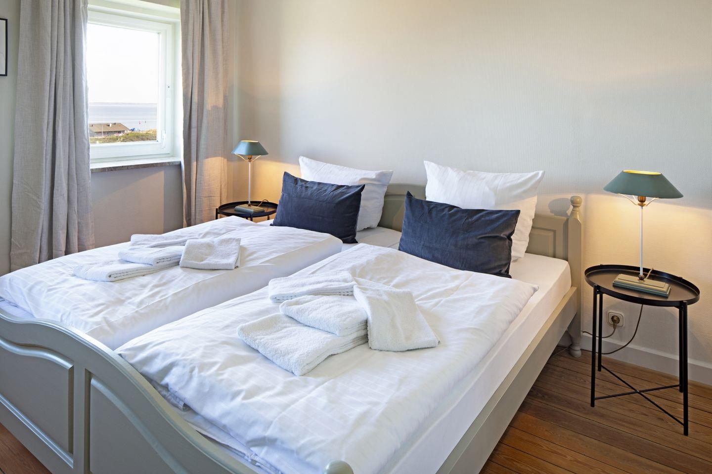 Das Feriendoppelhaus (160 m²) für bis zu 6 Personen verfügt über ein hell eingerichtetes Wohnzimmer, eine große geschlossene Küche, ein separates Schlafzimmer mit Doppelbett und zwei Schlafzimmer mit Einzelbetten. Alle Schlafräume befinden sich in der 1. Etage.