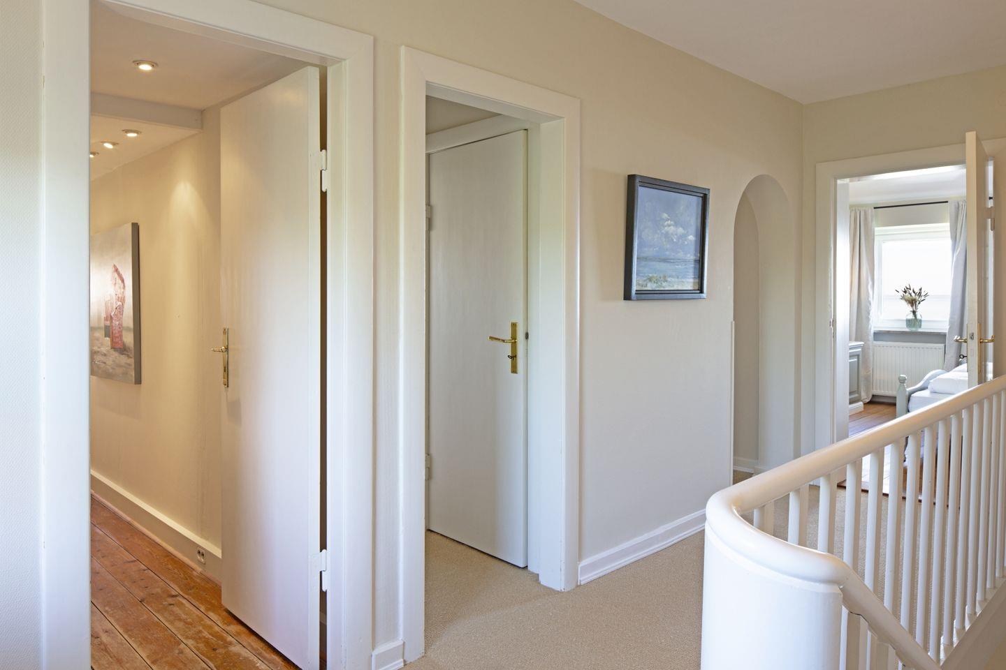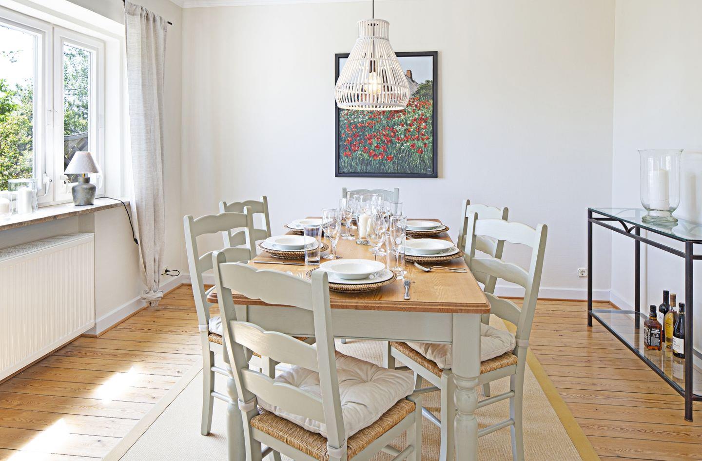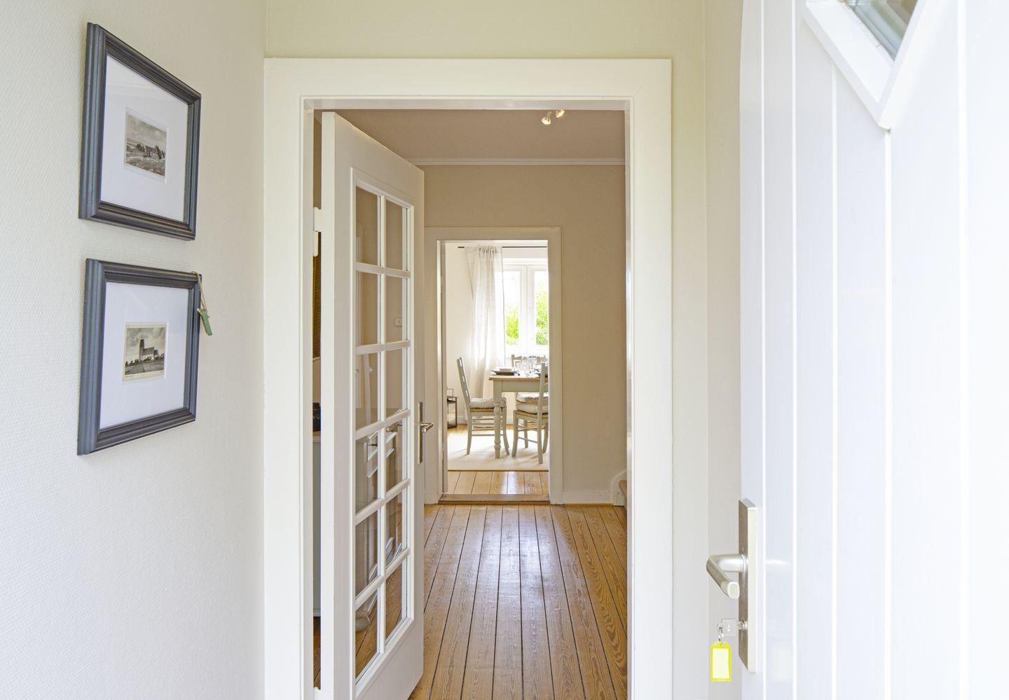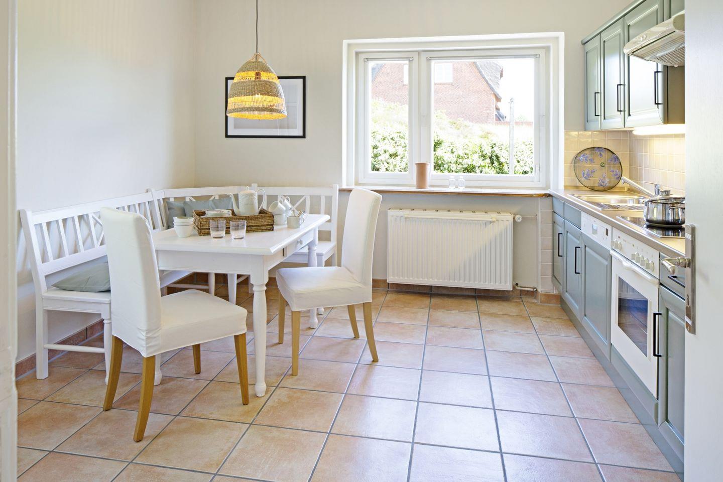 Das Feriendoppelhaus (160 m²) für bis zu 6 Personen verfügt über ein hell eingerichtetes Wohnzimmer, eine große geschlossene Küche, ein separates Schlafzimmer mit Doppelbett und zwei Schlafzimmer mit Einzelbetten. Alle Schlafräume befinden sich in der 1. Etage.