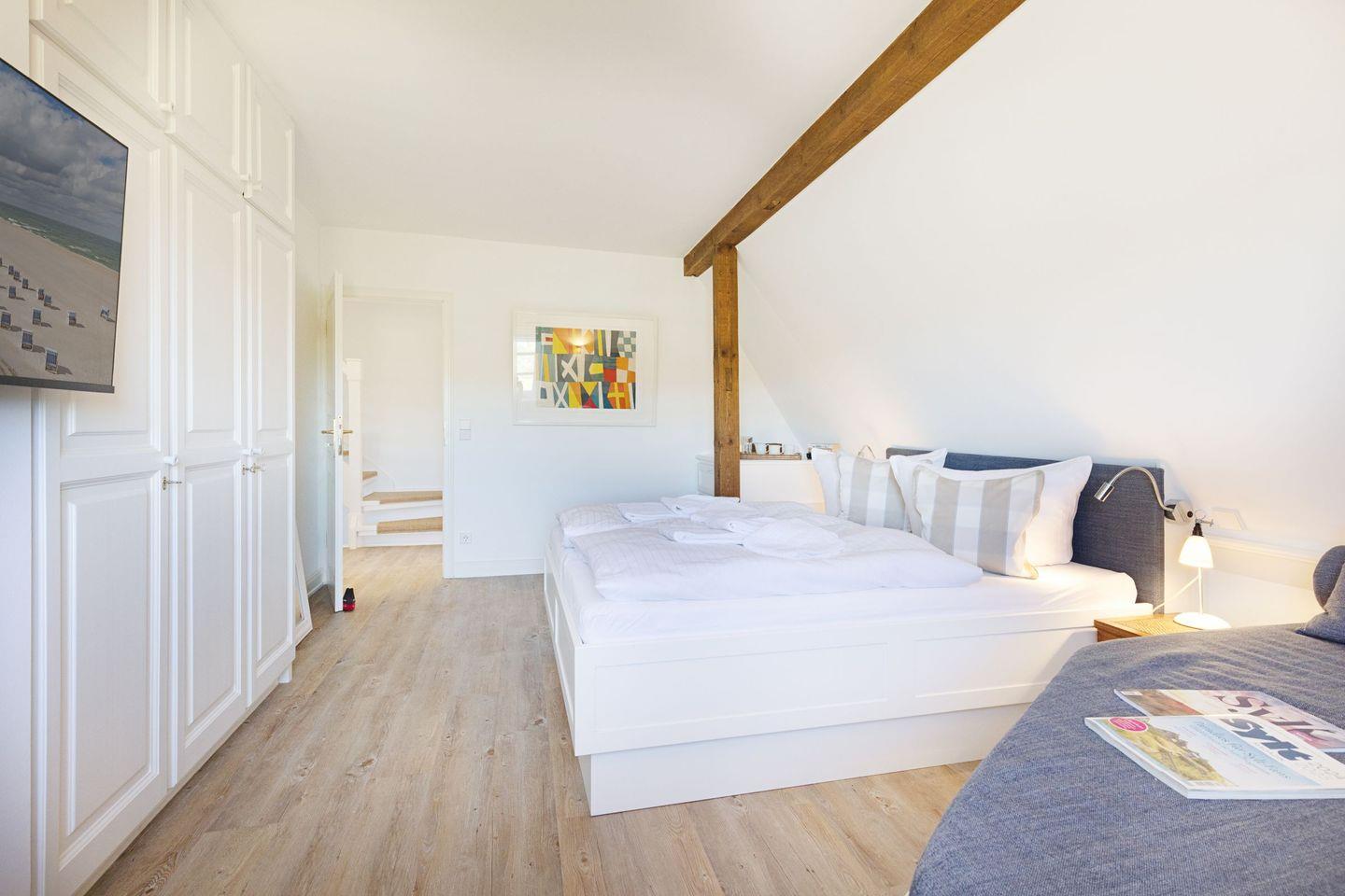 Im EG befindet sich ein Gäste-WC. Im ersten Stock befinden sich zwei Schlafzimmer – eines mit Doppelbett, eines mit Doppelbett und einem Einzelbett/Couch und ein Badezimmer mit Dusche und Wanne. Im Dachgeschoss befindet sich noch ein weiteres Schlafzimmer, ebenfalls mit zwei Einzelbetten. Auch hier finden Sie ein Badezimmer mit einer Dusche.