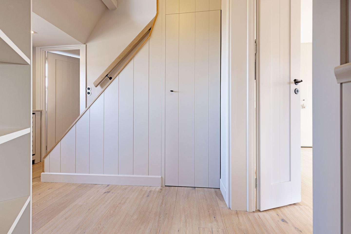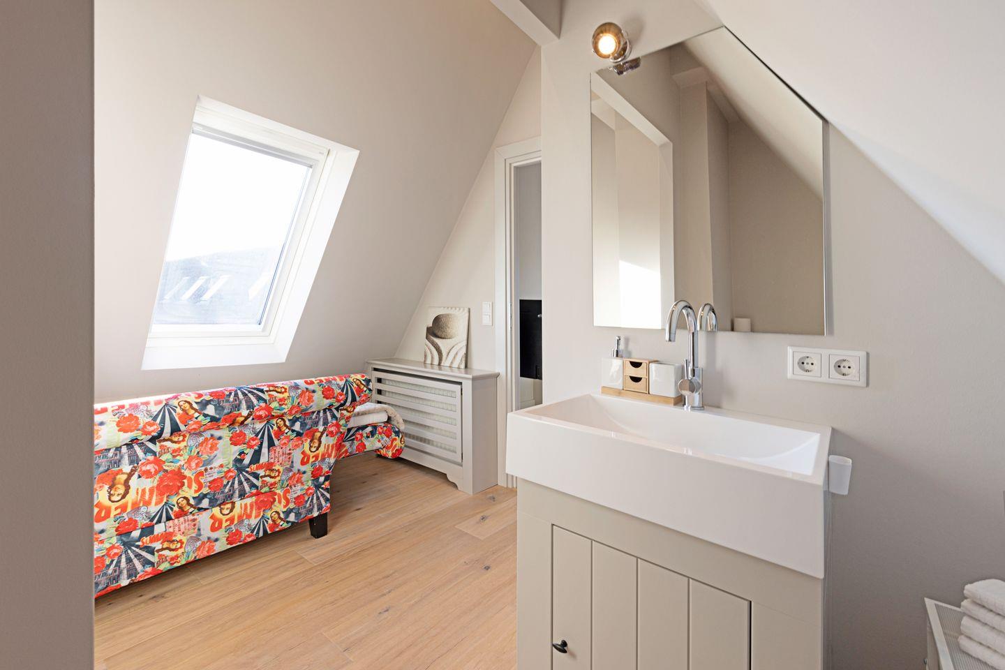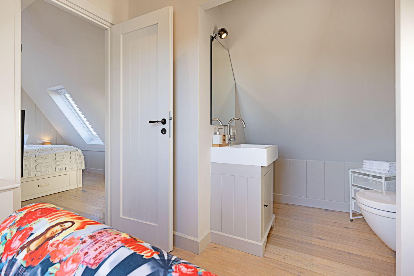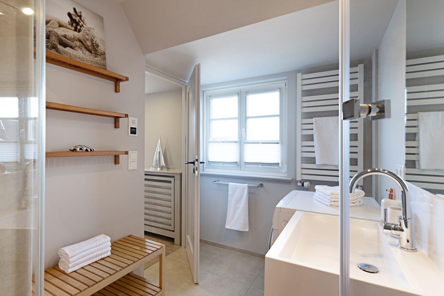 Das Gäste-WC befindet sich direkt nebenan. Das moderne Badezimmer verfügt über eine Dusche, WC und eine Waschmaschine.