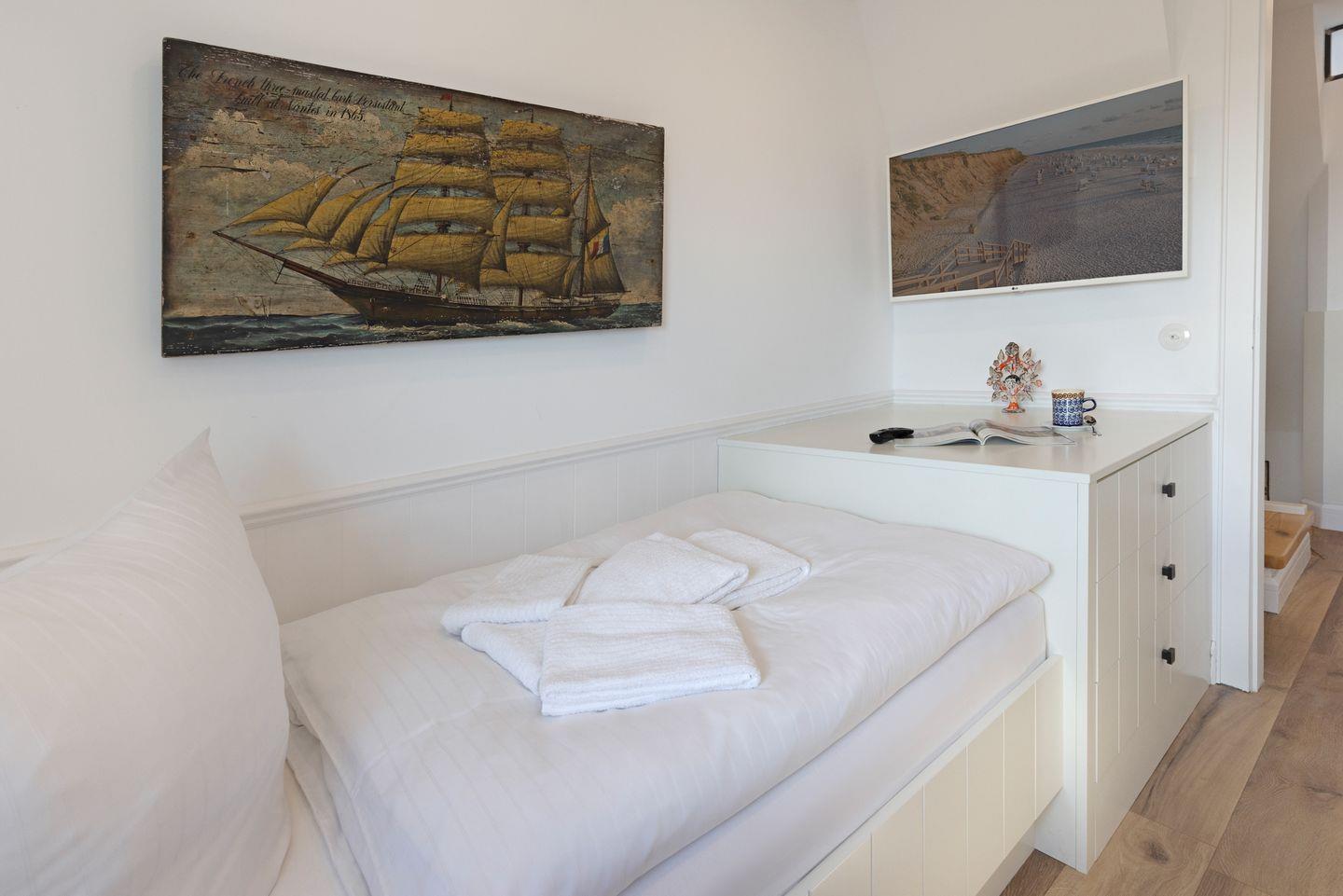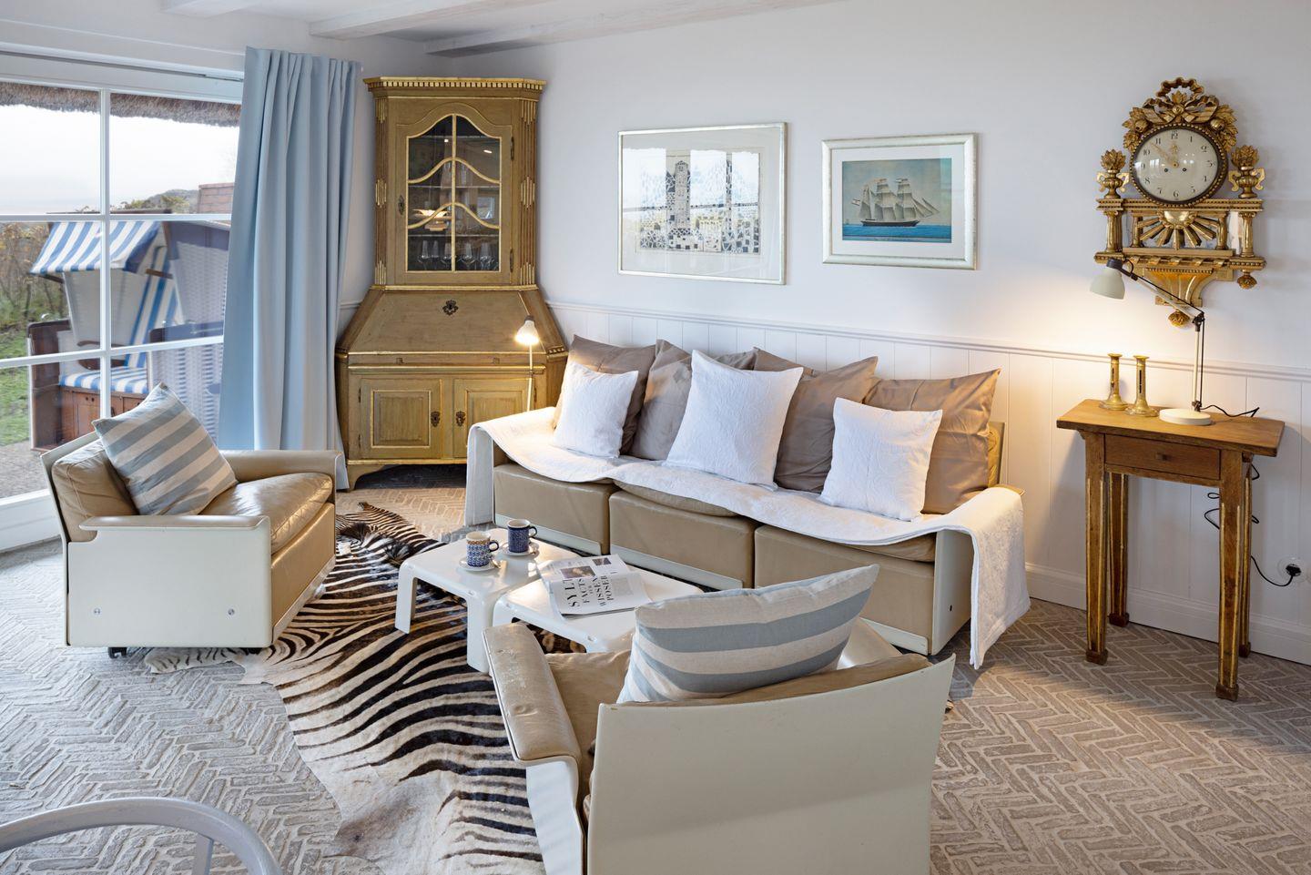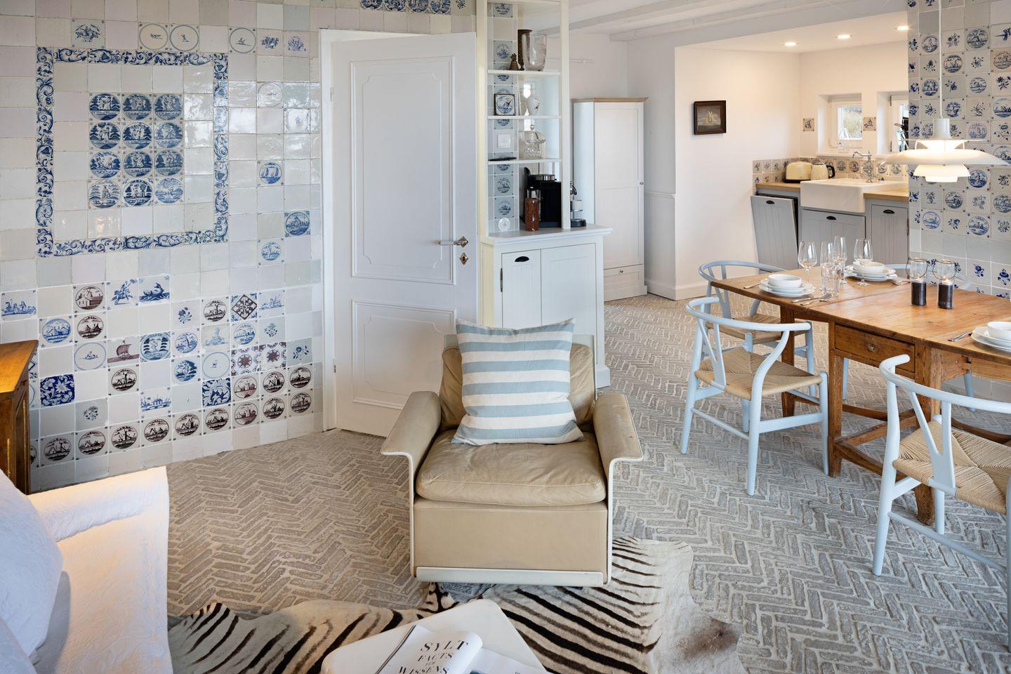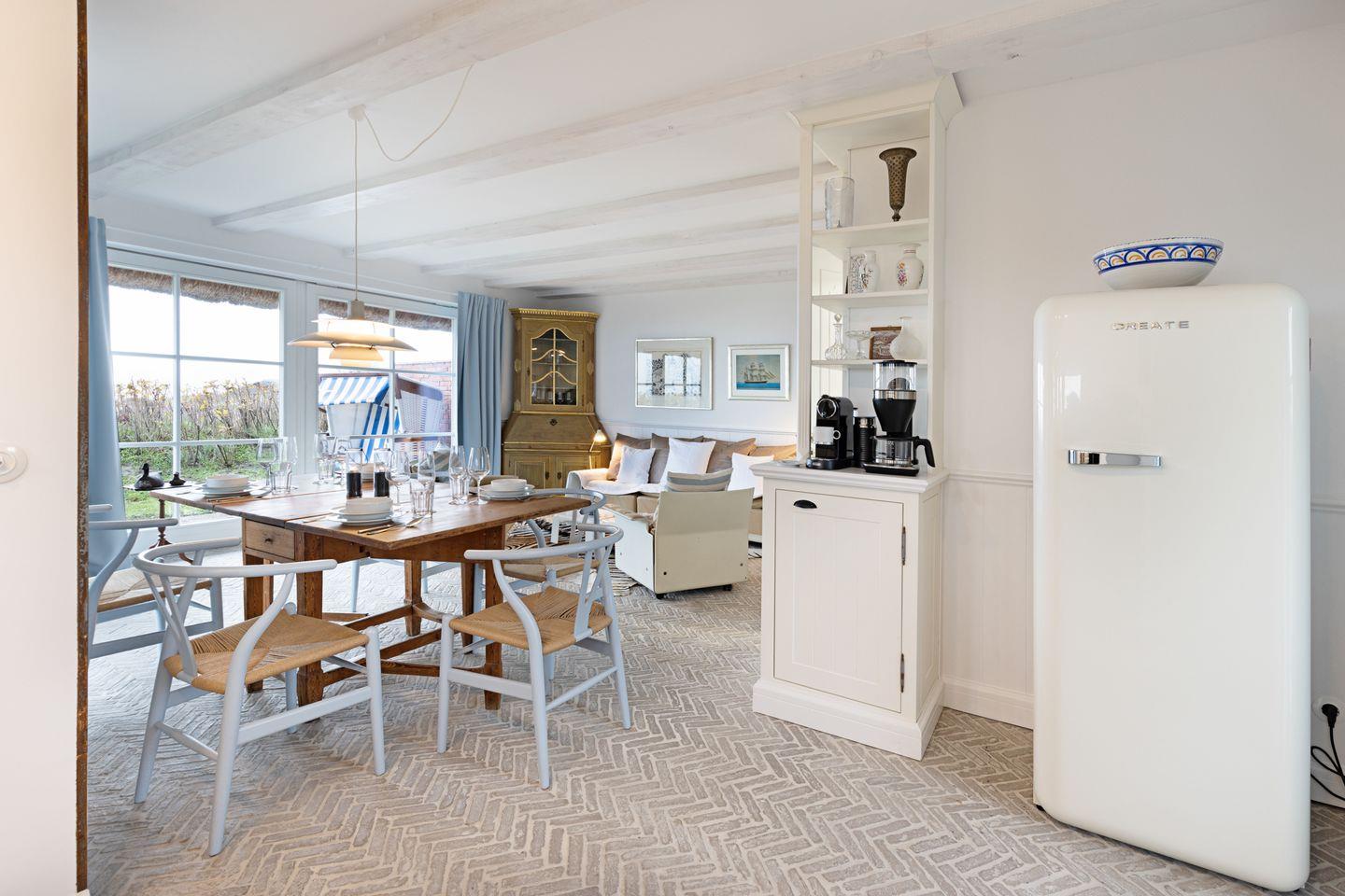 Die sehr persönlich gestaltete Einrichtung verbindet das traditionelle Sylt mit individuellem Vintage-Stil. In der ersten Etage befinden sich zwei Schlafzimmer.