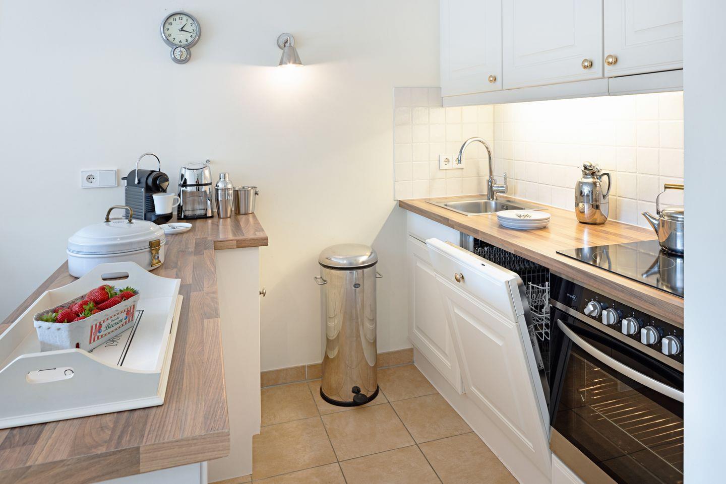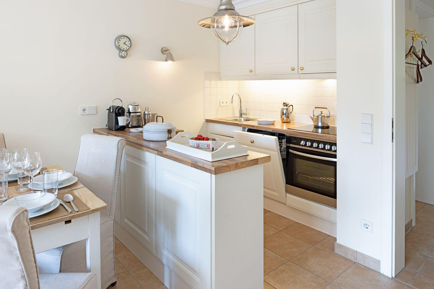 Die voll ausgestattete Küche erfüllt alle Ihre kulinarischen Bedürfnisse. Ausgestattet mit Geschirrspüler, Kühlschrank, Backofen, Cerankochfeld, Nespresso-Maschine und allem nötigen Küchenzubehör, können Sie hier leckere Gerichte zaubern. Und für den perfekten Start in den Tag steht ein Brötchenservice zur Verfügung, damit Sie jeden Morgen frische Brötchen genießen können.