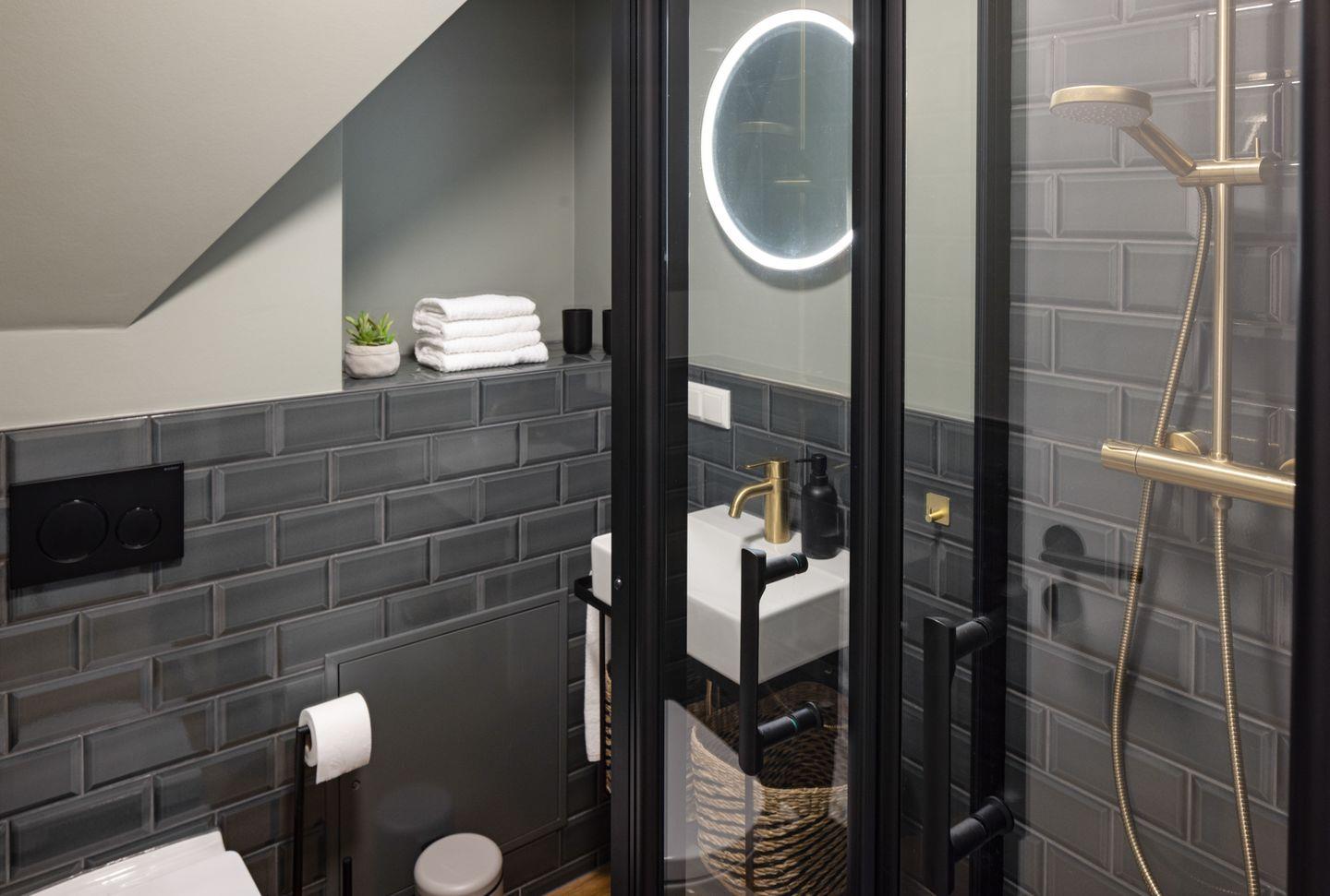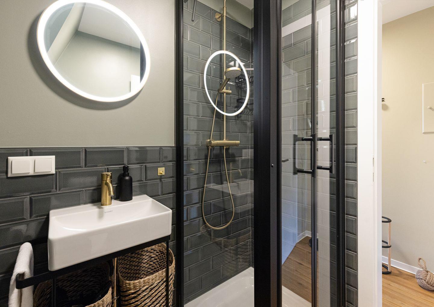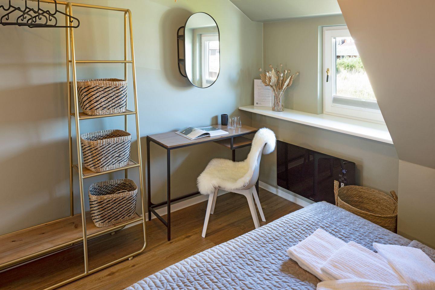 Das separate Schlafzimmer verfügt über ein komfortables Doppelbett (180x200 cm), einen großen Schreibtisch und einen Spiegel alles für einen entspannten Aufenthalt. Das moderne Badezimmer ist mit einer Dusche und einem Fön ausgestattet.