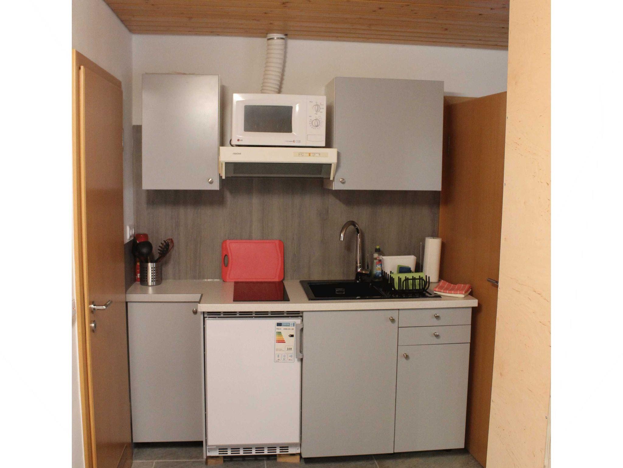 Plattenceranfeld, Dunstesse, Kühlschrank mit Gefrierfach, Mikrowelle,