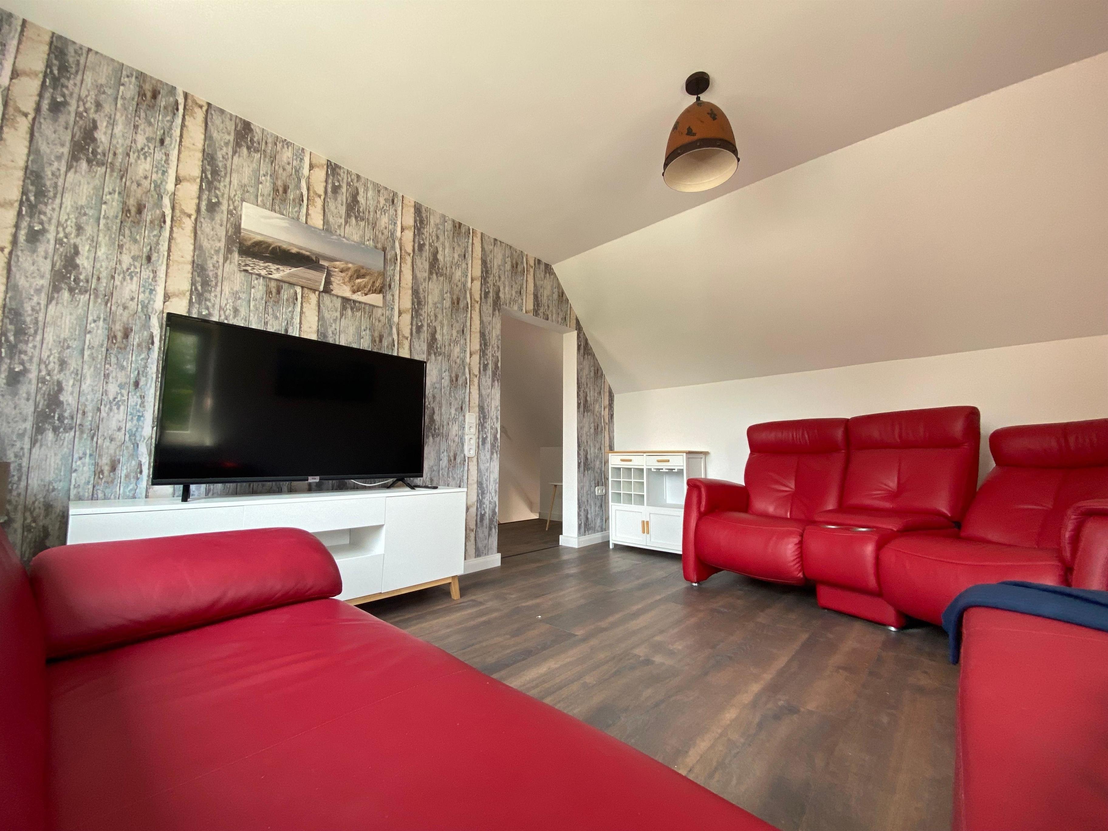 im Obergeschoss befindet sich, Wohnzimmer mit Blick in die Natur, eine volleingerichtete Küche und ein WC.