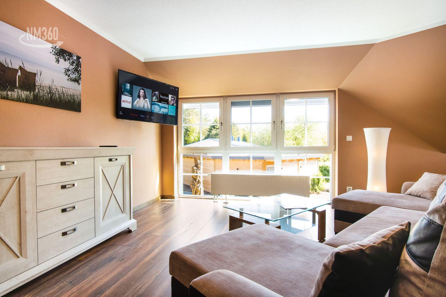 Die offene Küche ist komplett ausgestattet und bietet alles, was Sie für die Zubereitung Ihrer Lieblingsgerichte benötigen – von der Spülmaschine über den Kühlschrank bis hin zu Mikrowelle und Kaffeemaschine. Genießen Sie Ihre Mahlzeiten im Essbereich der Wohnung oder im Garten der Anlage, während Sie die frische Seeluft atmen und die entspannte Atmosphäre der Umgebung wahrnehmen. Die Ferienwohnung ist natürlich familienfreundlich