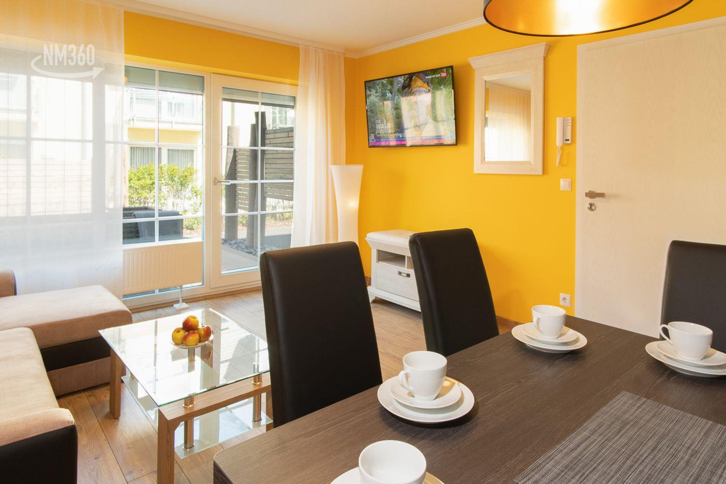 Die Wohnung verfügt über ein gemütliches Schlafzimmer, das Ihnen Ruhe und Erholung bietet. Im Wohnbereich befindet sich eine Schlafcouch, die sich hervorragend für zusätzliche Gäste eignet. Genießen Sie die helle, offene Küche, die komplett ausgestattet ist mit modernen Annehmlichkeiten wie einem Cerankochfeld, Backofen, Geschirrspüler und Mikrowelle. Hier können Sie Ihre Lieblingsgerichte zubereiten und Ihre Mahlzeiten am Esstisch im privatem Setting genießen.