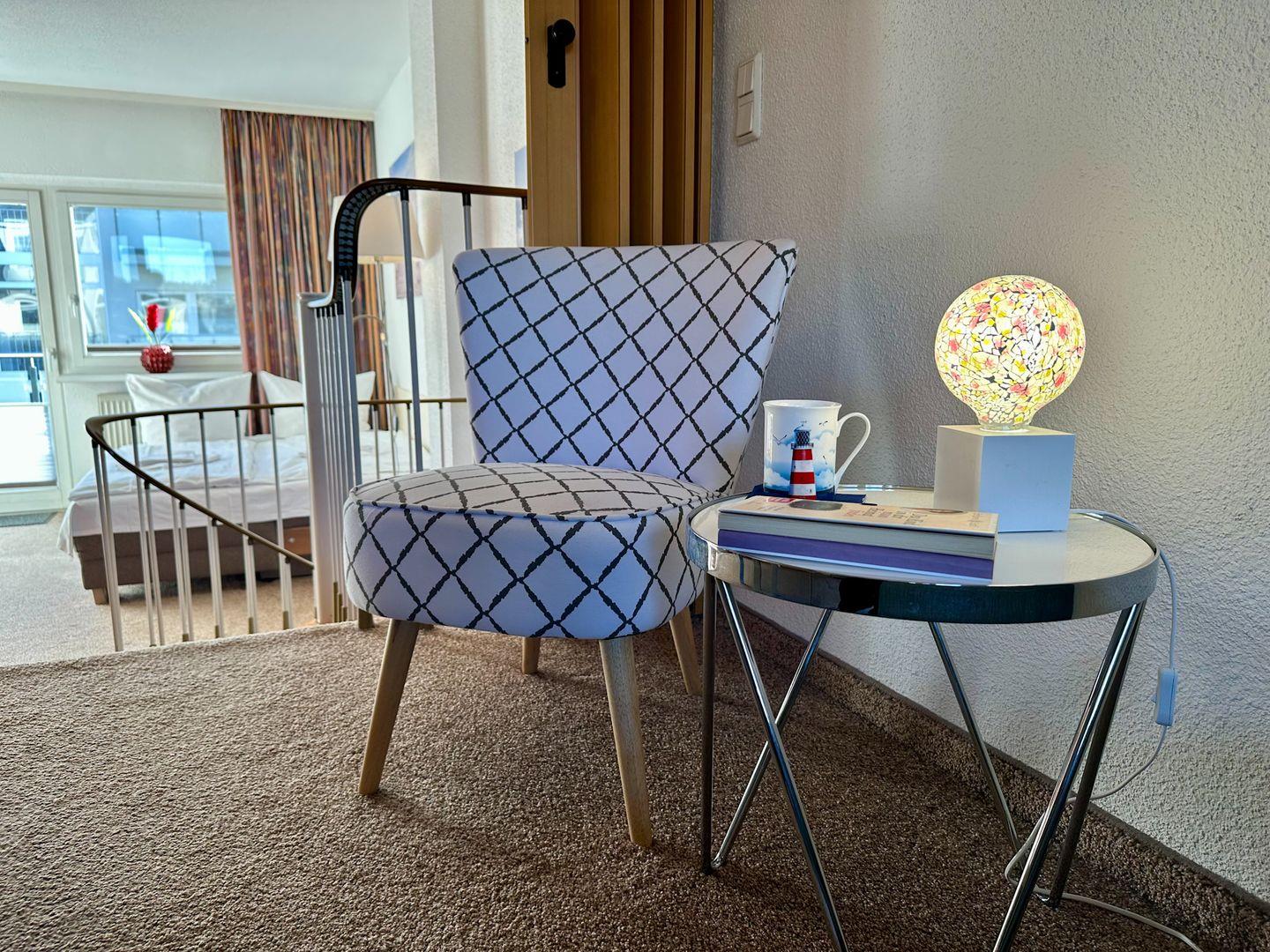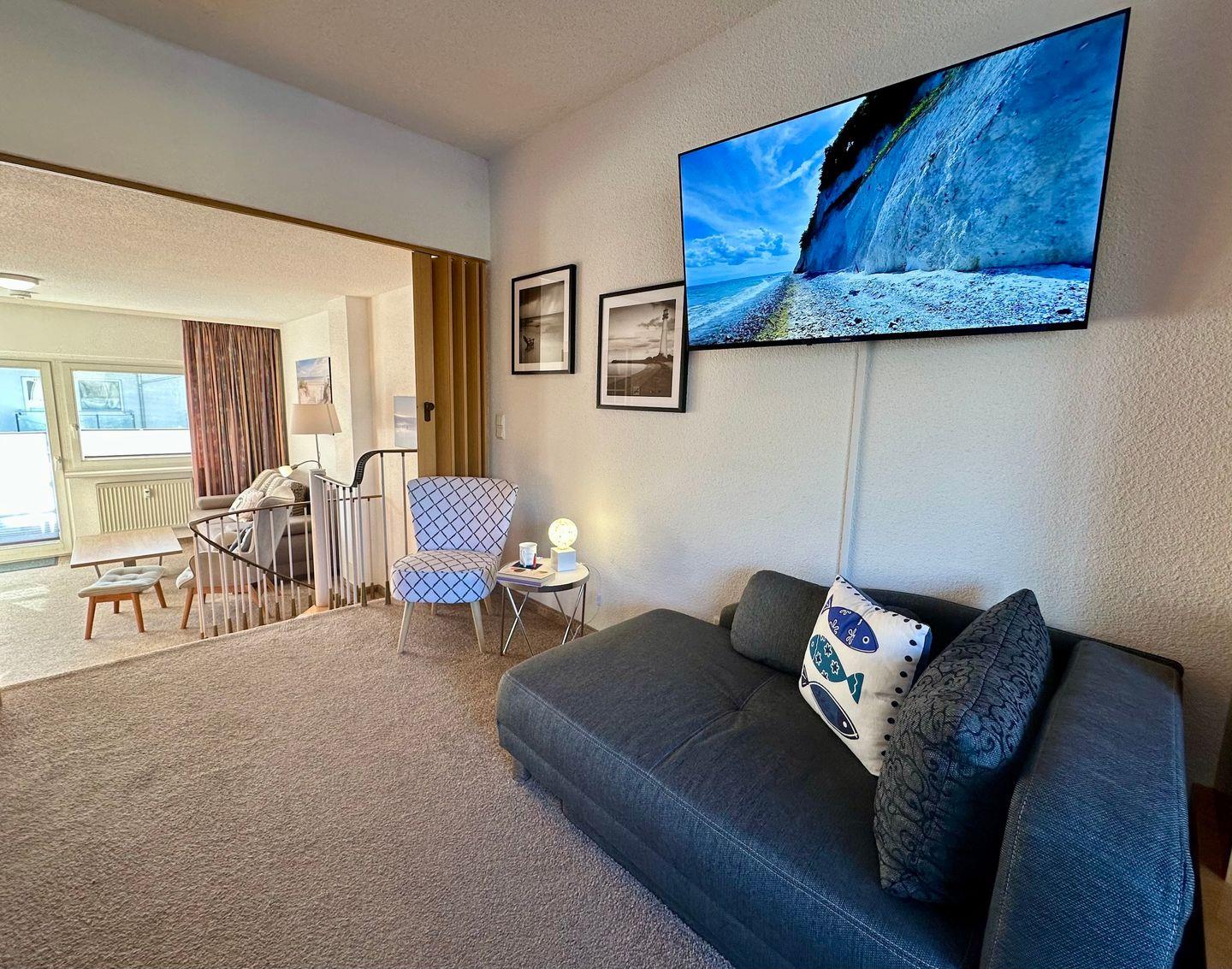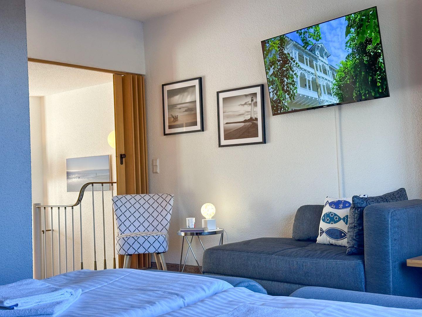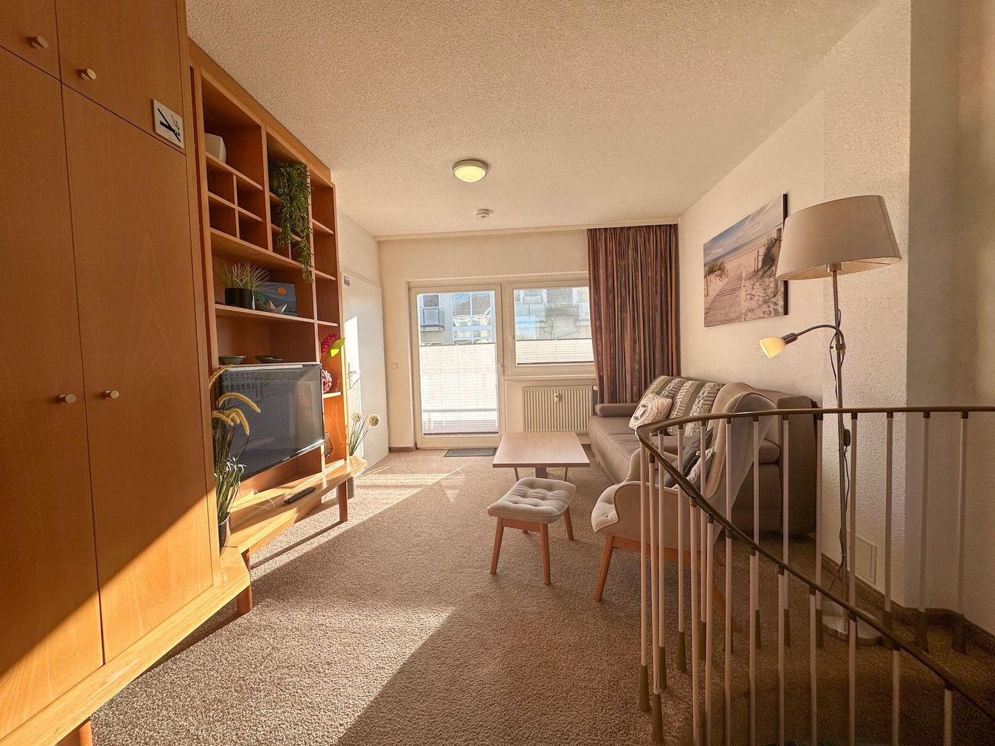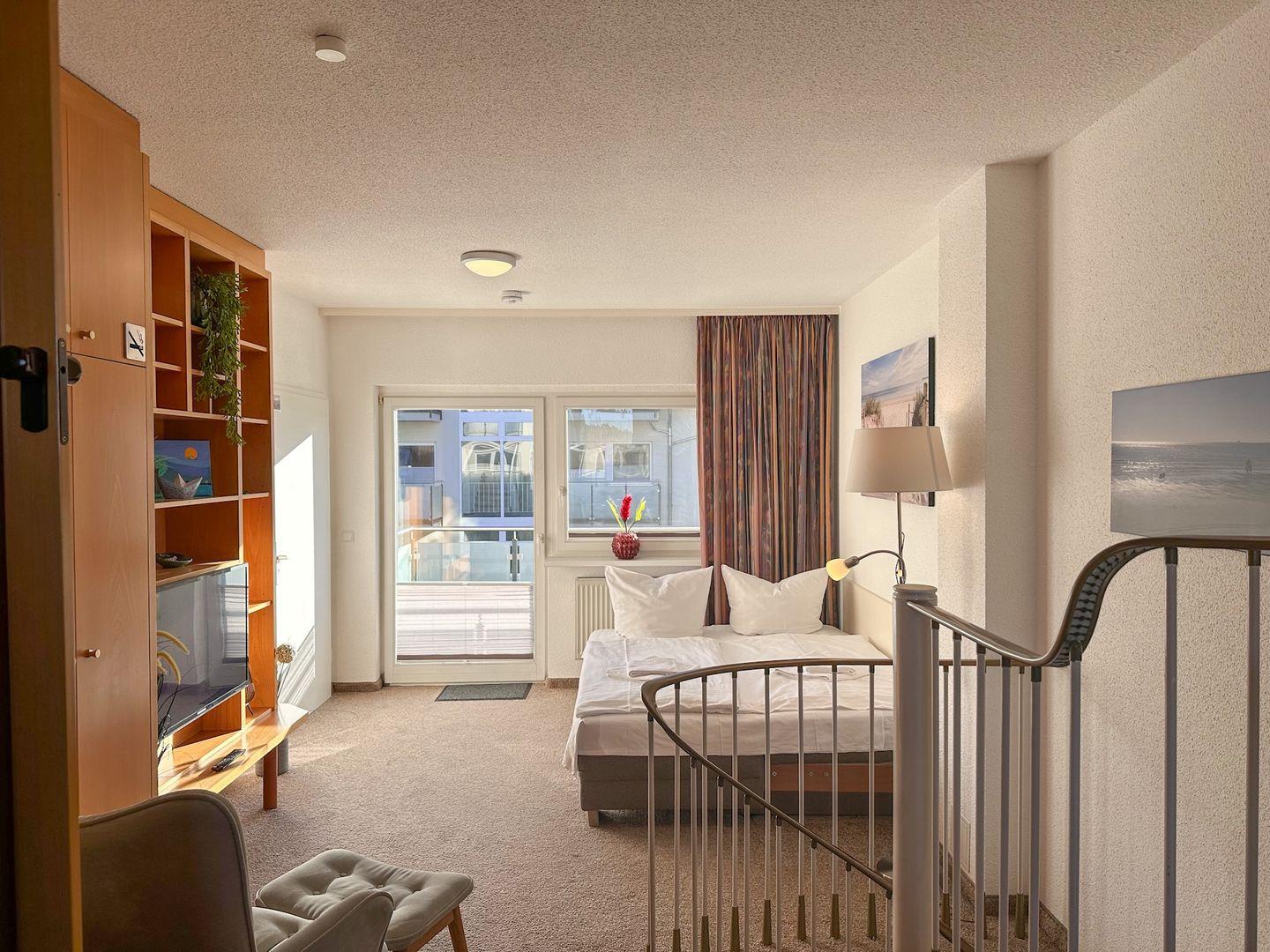 Über eine Empore gelangen Sie in den Wohnbereich auch mit Balkonzugang. Hier bietet eine bequeme Schlafcouch noch Schlafplatz für zwei Personen.