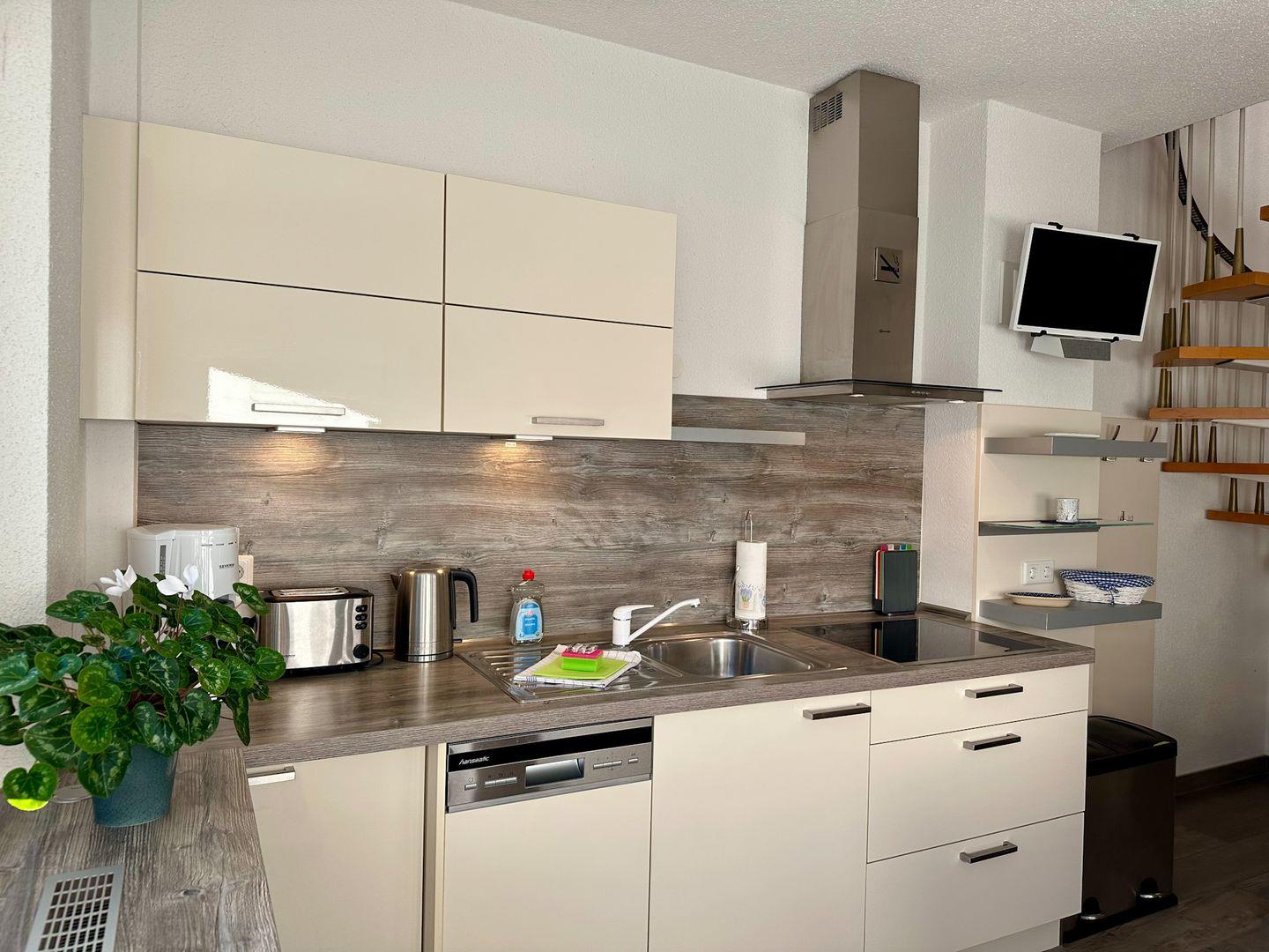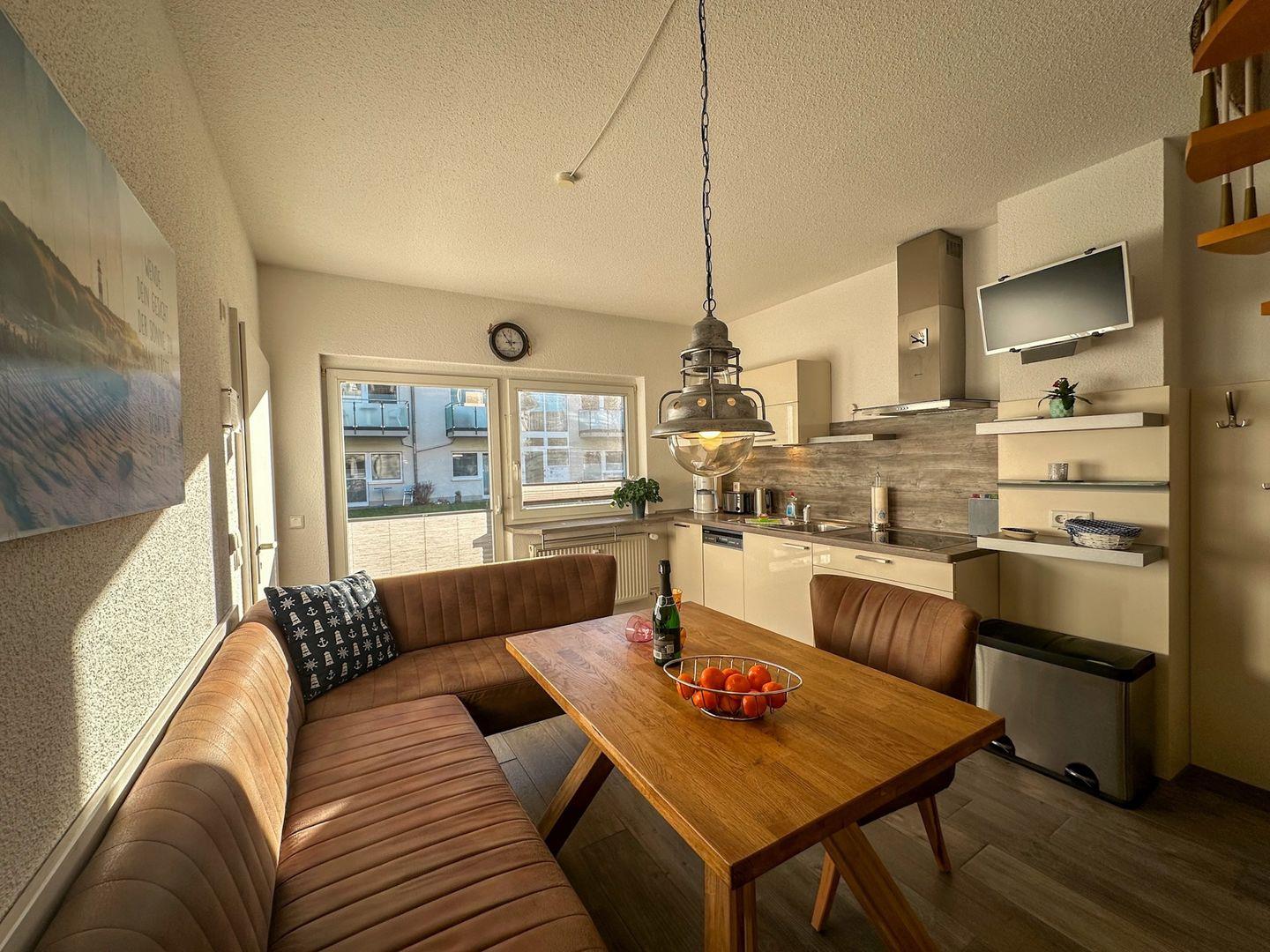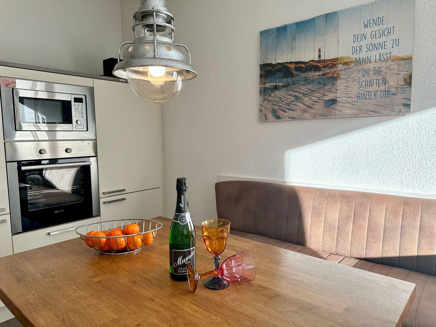 Im Erdgeschoss befindet sich die voll ausgestattete Küche mit Esstisch und Terrassenzugang. Zur Ausstattung zählen: Backofen, Mikrowelle, Kaffeemaschine und viele weitere Küchenutensilien, die Sie für die Dauer Ihres Rügen-Urlaubes gebrauchen können.