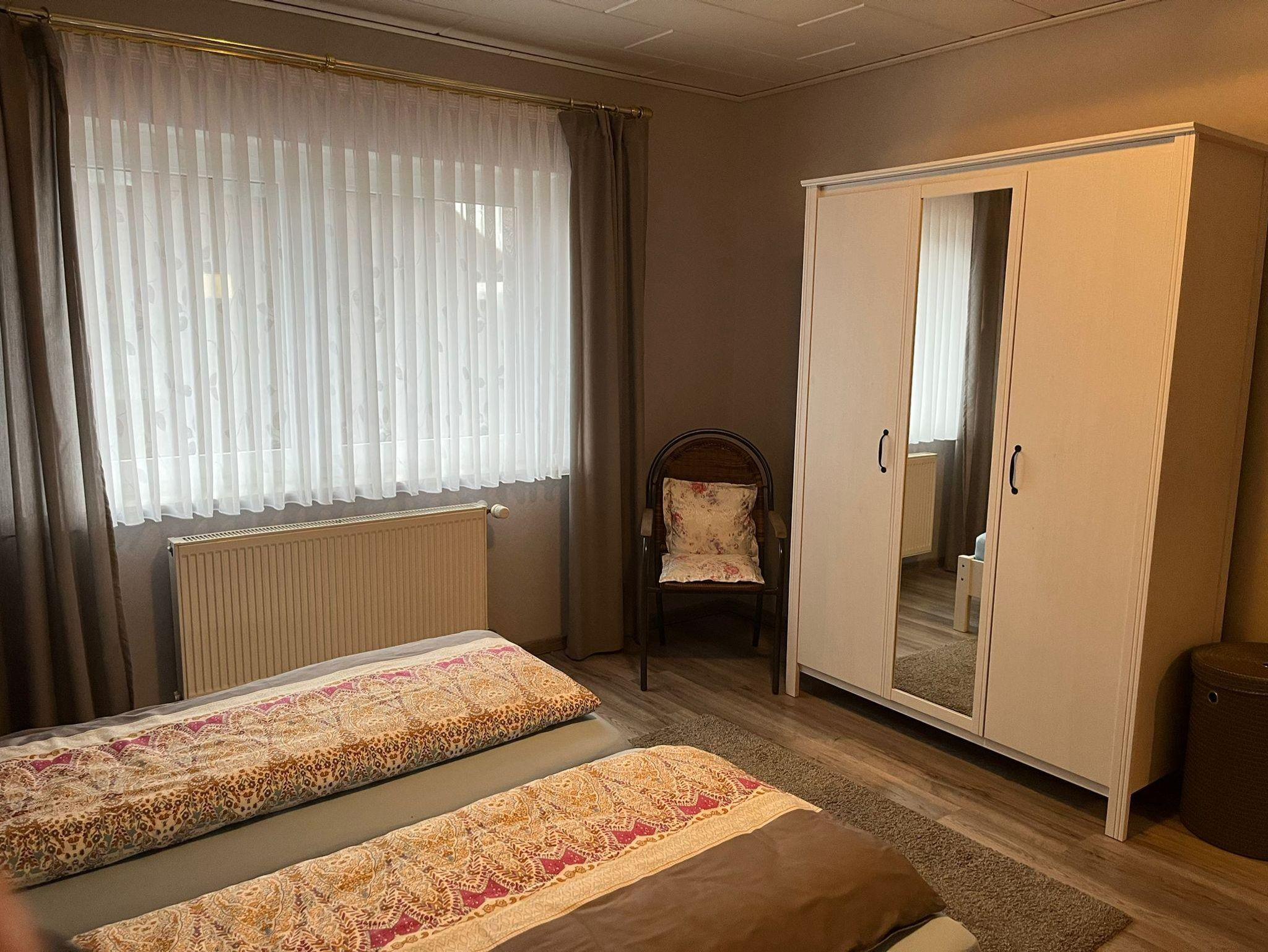 Ferienwohnung mit ebenerdigem Eingang, einem 3-Bettschlafzimmer, Wohnzimmer, Kücher mit Essplatz, Bad sowie Flur mit großem Einbauschrank.