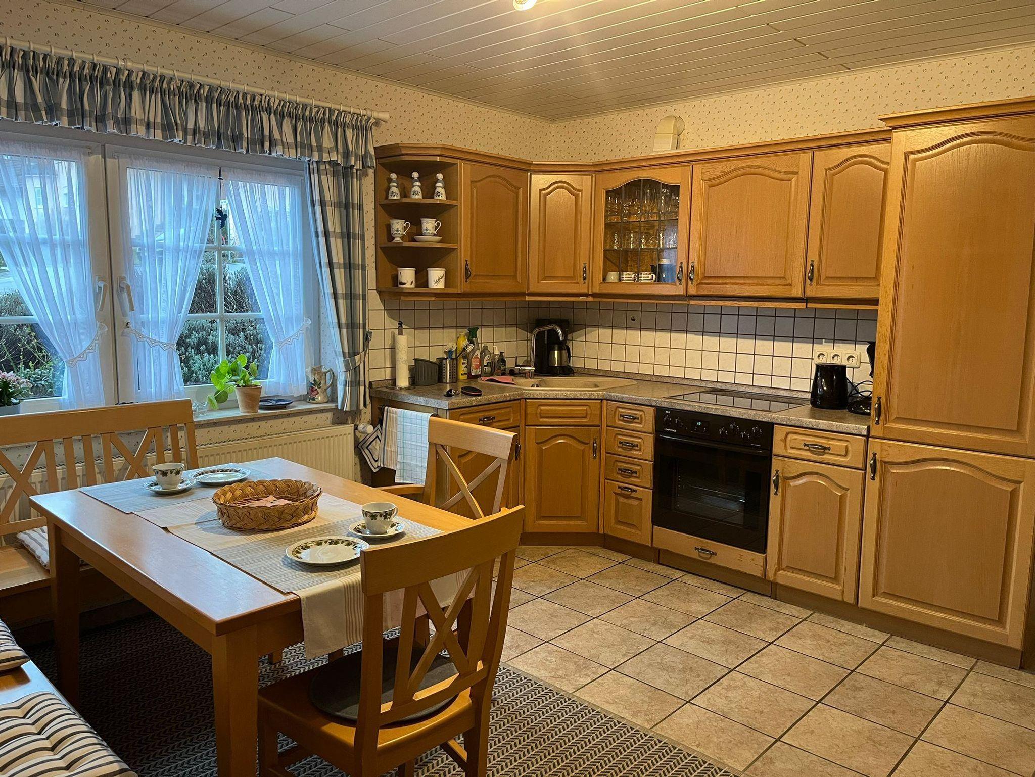 Küche mit Herd, Backofen, Kühlschrank, Mikrowelle, Esstisch für 5 Personen.
