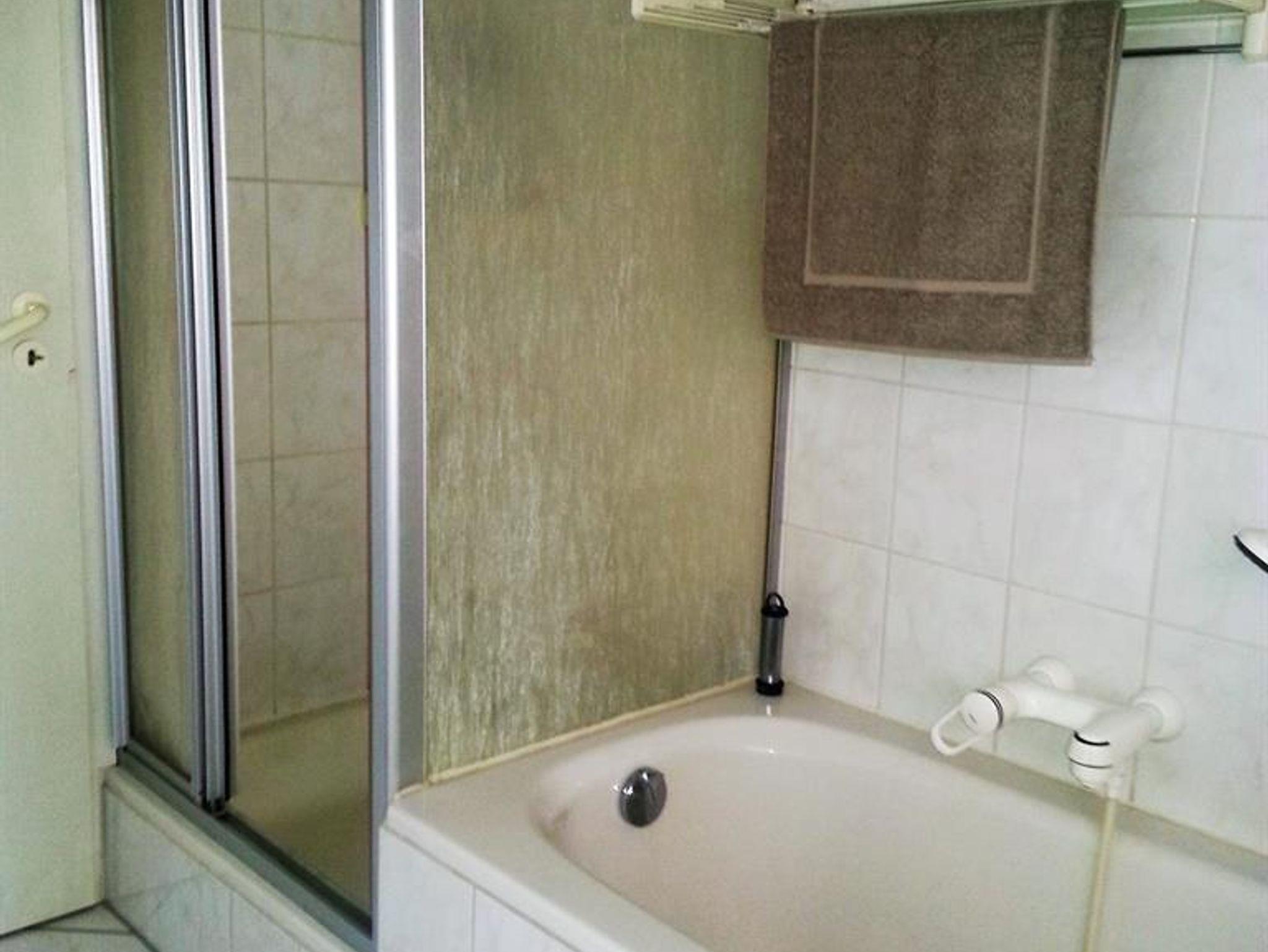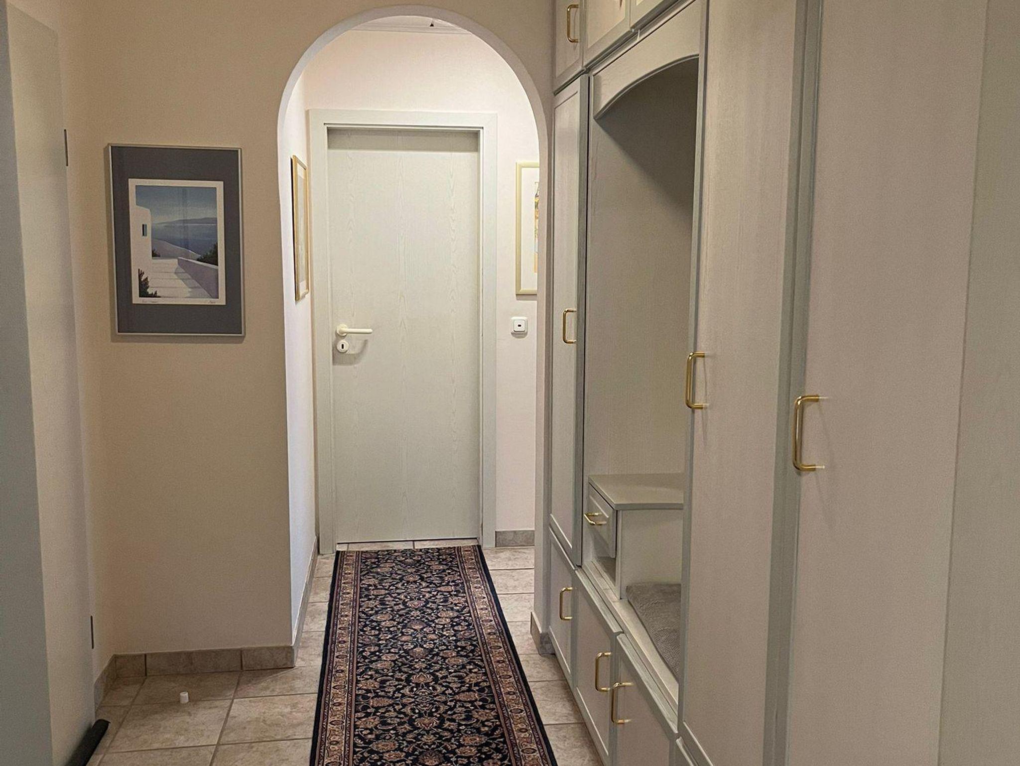 Badezimmer mit Wanne und Dusche, Flur mit eingebautem Wandschrank.
