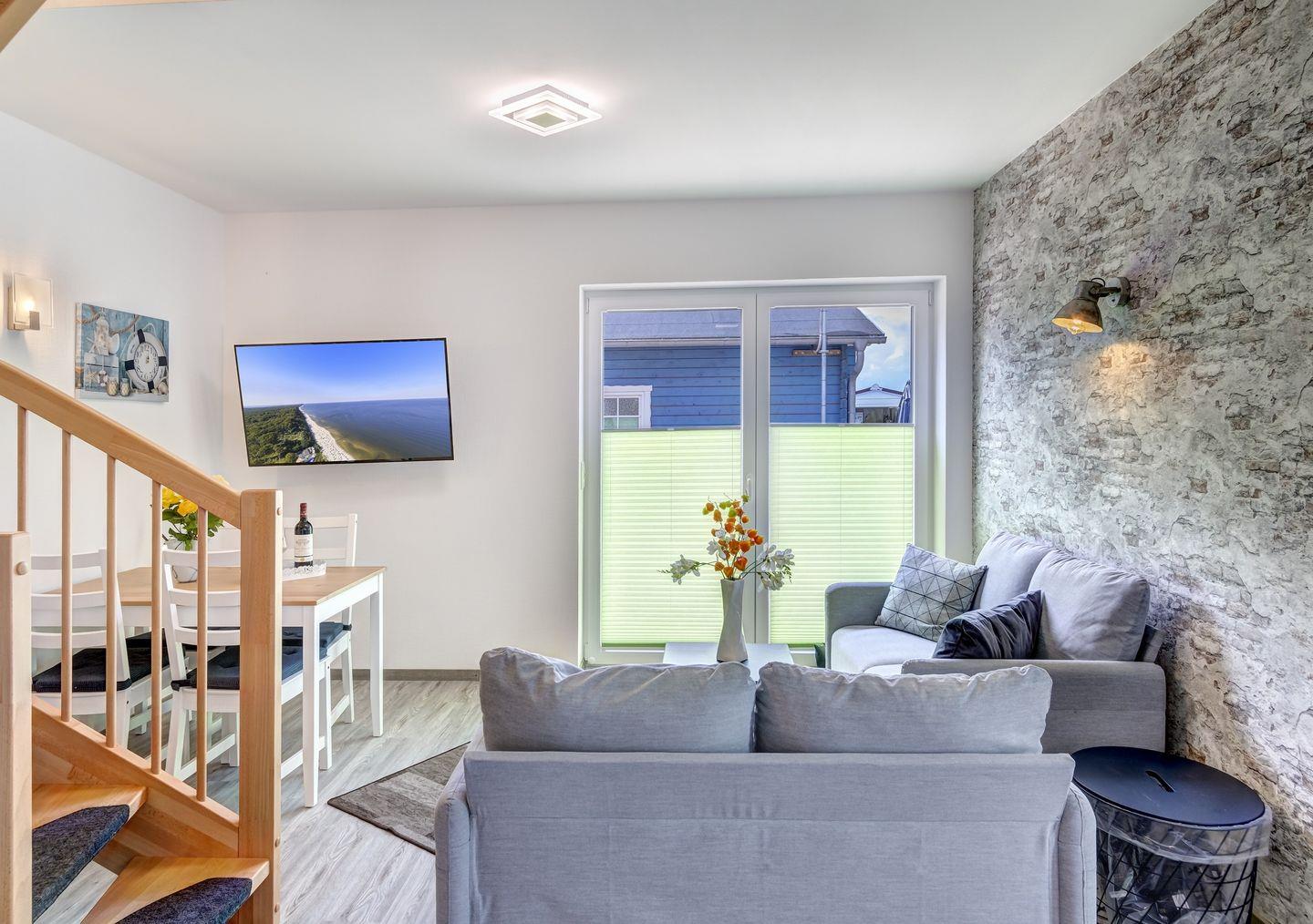 Genießen Sie den lichtdurchfluteten Wohn- und Essbereich mit einer gemütlichen Sitzgruppe, der Ihnen ein besonderes Urlaubsambiente bietet. Direkter Zugang zur Terrasse ermöglicht entspannte Momente im Freien. Die separate, modern und vollausgestattete Küche lässt keine Wünsche offen. Zwei vollwertige Schlafzimmer sorgen für erholsame Nächte: das erste mit komfortablem Doppelbett und das zweite mit einem Hochbett für drei Personen.