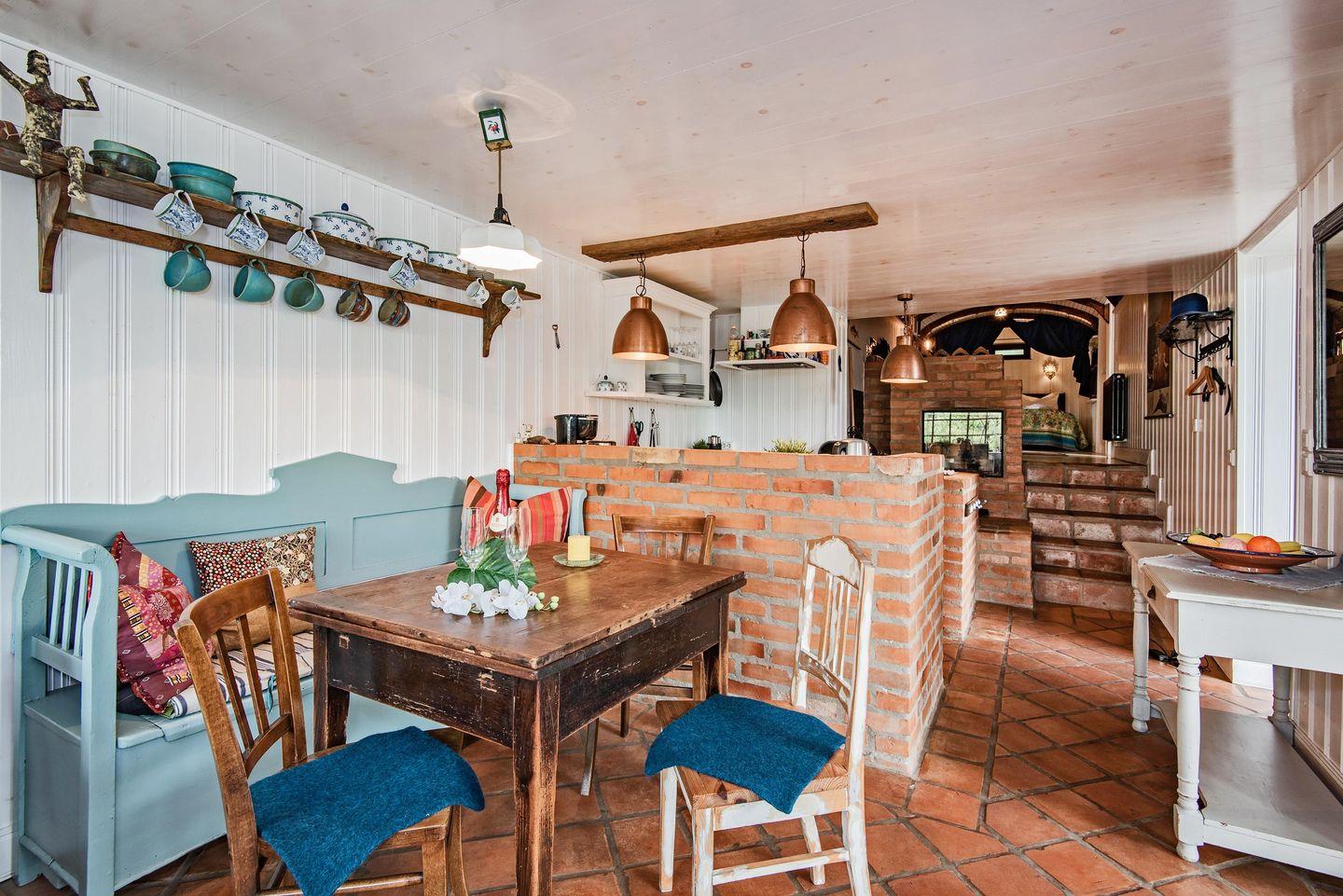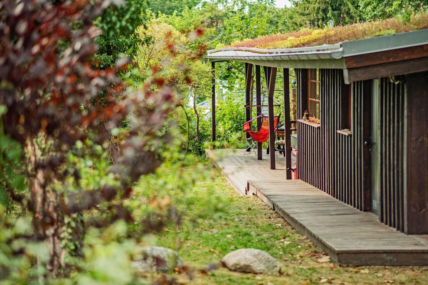Ideal für Familien! Südexponiert mit Blick auf den Kölpinsee liegt verborgen und phantasieumwoben ein ganz eigenes Ferienhaus. Es sind die tanzenden Farben und die Geschichten erzählenden Details, die das Drinnen und Draußen so lebendig machen und die Besucher so frei für viele neue Gedanken auf dem Weg der Erholung. Im Herzen wärmt ein Lehmofen, dessen Feuer den kältesten Oststürmen trotzt. Es gibt die Wahl: Einschlafen unter dem Wagenhimmel oder Aufwachen mit Blick auf den See. Eine Wohltat bei Hitze oder Sommerregen: eine große überdachte Holzterrasse mit mehreren Sitznischen. Ein wilder‚ Waldgarten’ empfängt den, der sich mit Buch und Gartenstuhl darin bewegt.