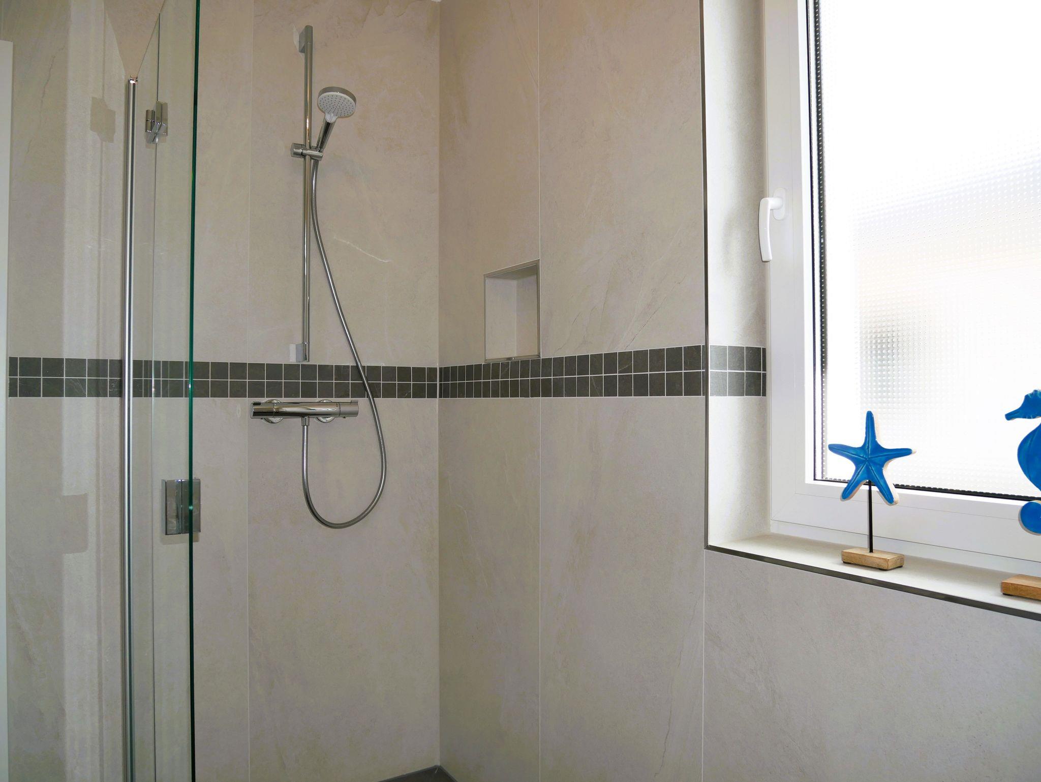 Das helle Tageslichtbad ist mit zwei Waschbecken, einem WC sowie einer ebenerdigen Dusche ausgestattet und verfügt über ein Fenster zur natürlichen Belüftung.