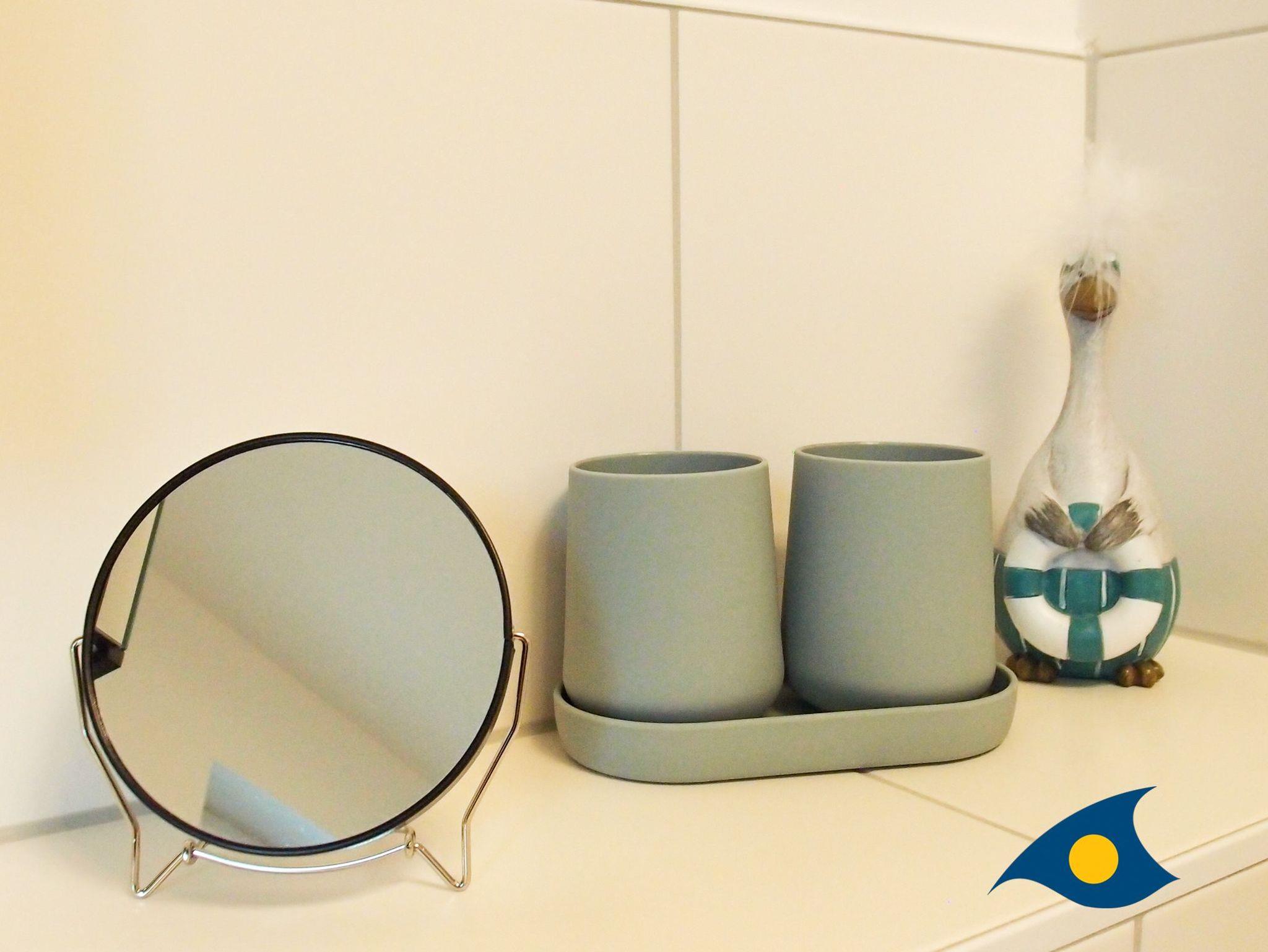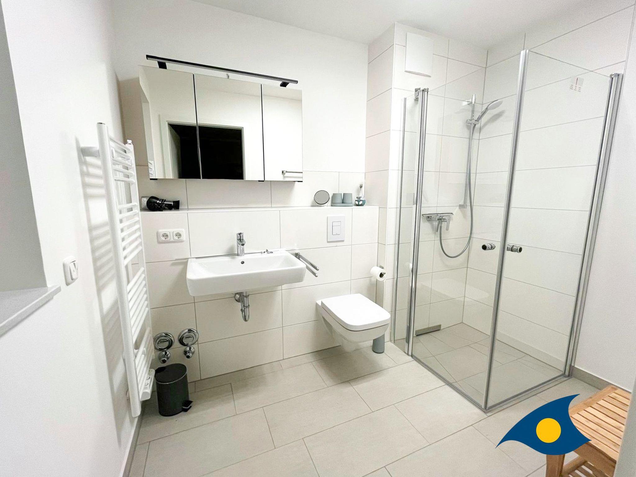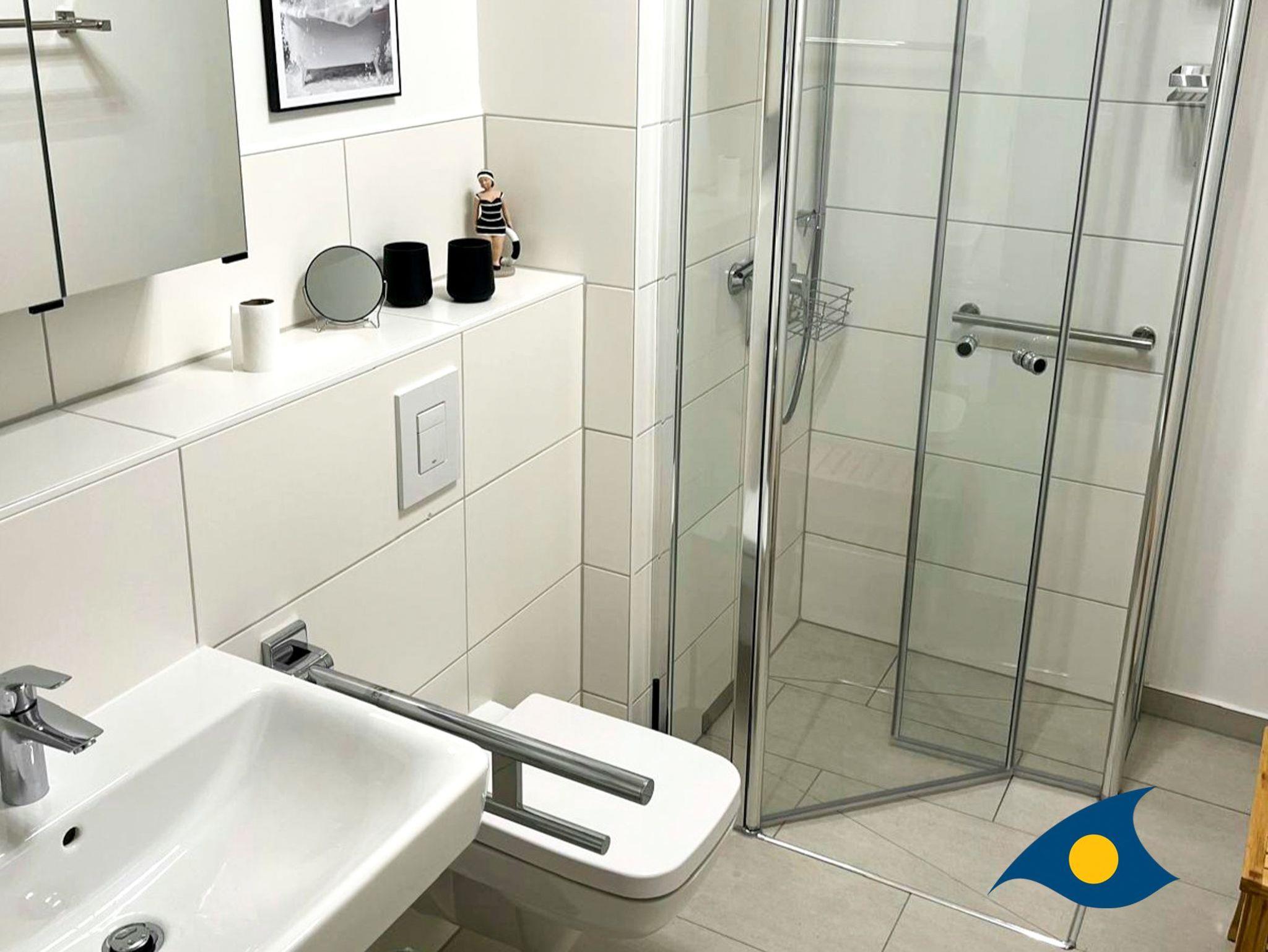 Die beiden modernen Bäder mit ebenerdigen Duschen bieten zusätzlichen Komfort. Für Gäste mit eingeschränkter Mobilität verfügt ein Badezimmer über Haltegriffe in der Dusche, sowie am WC. Bahnanreisende erreichen das Objekt ebenfalls barrierefrei vom Bahnhof kommend.