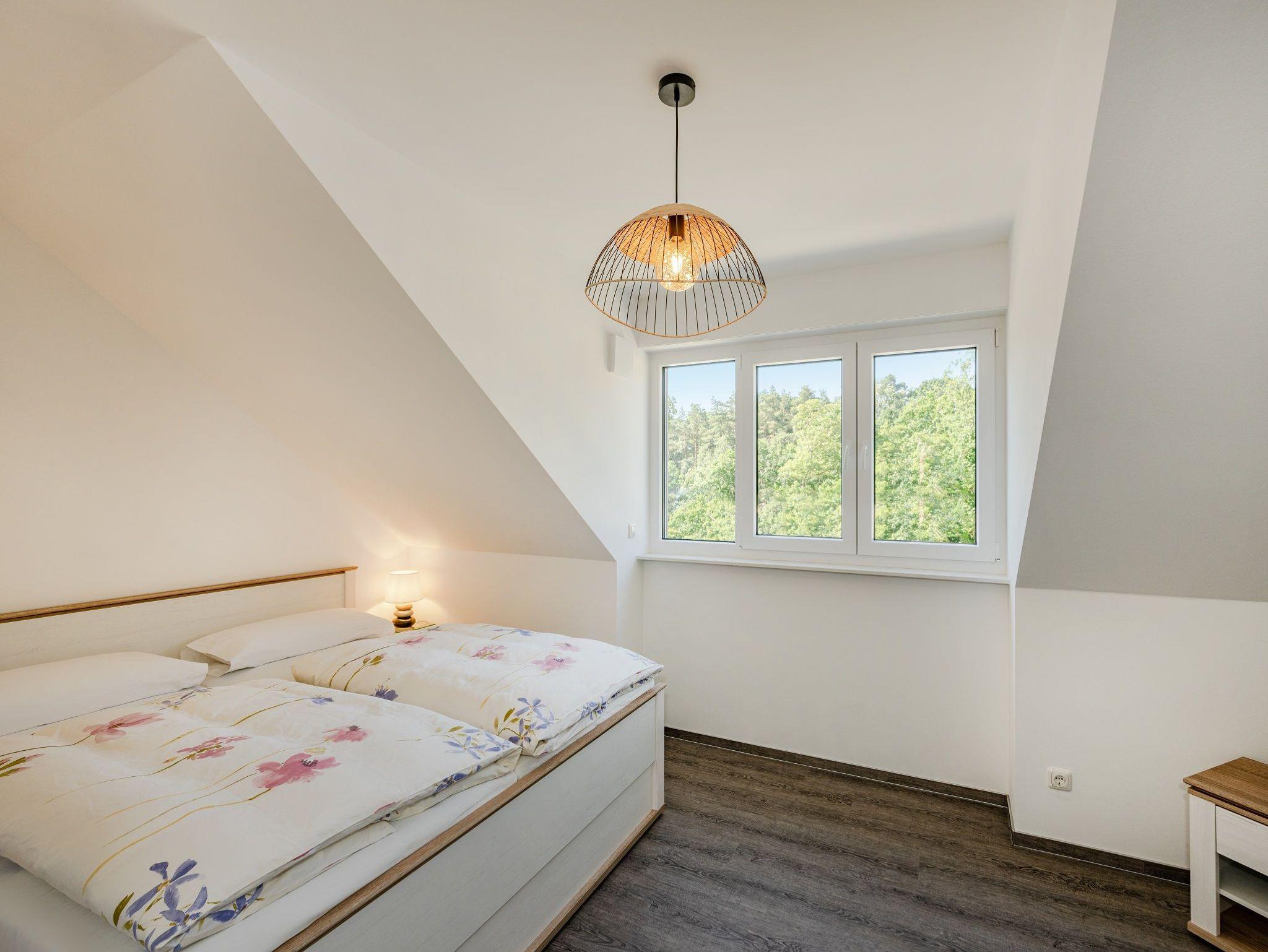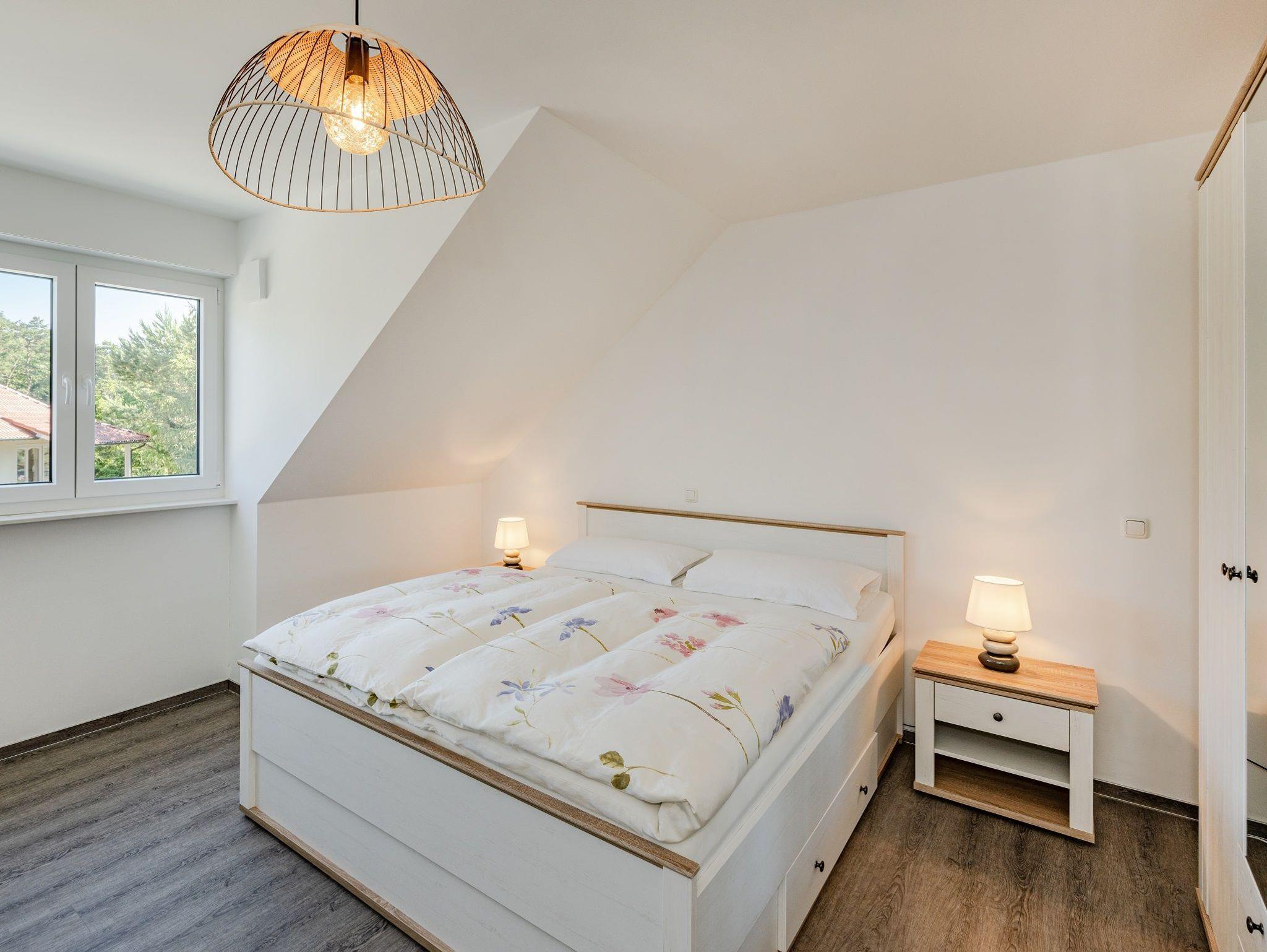 Im Obergeschoss befinden sich zwei separate Schlafräume, jeweils ausgestattet mit hochwertigem Doppelbett und Kleiderschrank. Ein weiteres Badezimmer mit ebenerdiger Dusche und WC sorgt für zusätzlichen Komfort. An den Fenstern sind Plissees montiert; einige Fenster verfügen zudem über Insektenschutz.