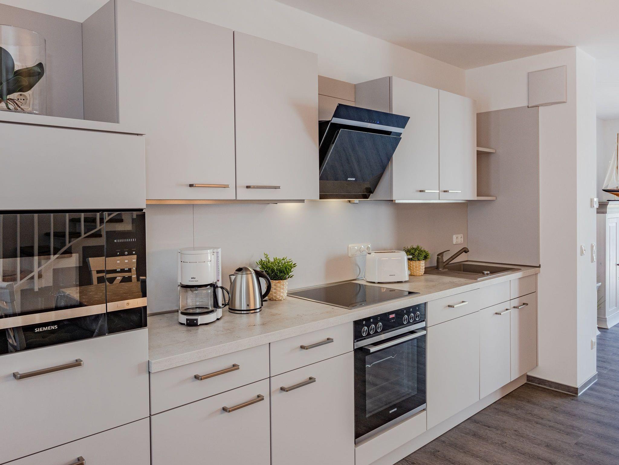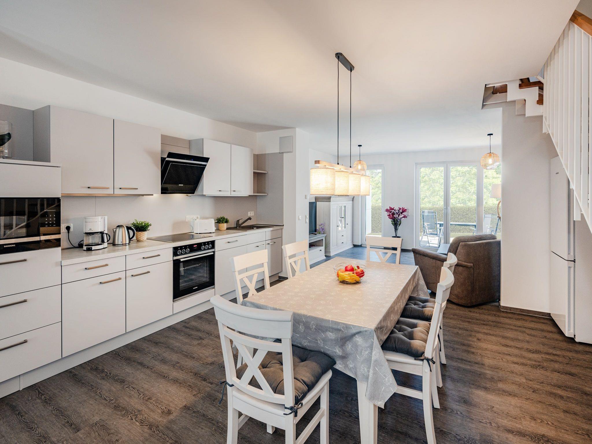 Im Erdgeschoss befindet sich eine offene, helle Küche mit Komplettausstattung (Backofen, Cerankochfeld, Mikrowelle, Wasserkocher, Kaffeemaschine, Toaster, Spülmaschine, Kühlschrank mit separatem Gefrierabteil) sowie einem großen Esstisch mit sechs Stühlen. Von dort gelangen Sie in den gemütlichen Wohnbereich, der eine Couch, Sessel, einen Tisch und einen QLED-TV beherbergt. Ebenfalls im Erdgeschoss finden Sie ein Badezimmer mit ebenerdiger Dusche und WC.
