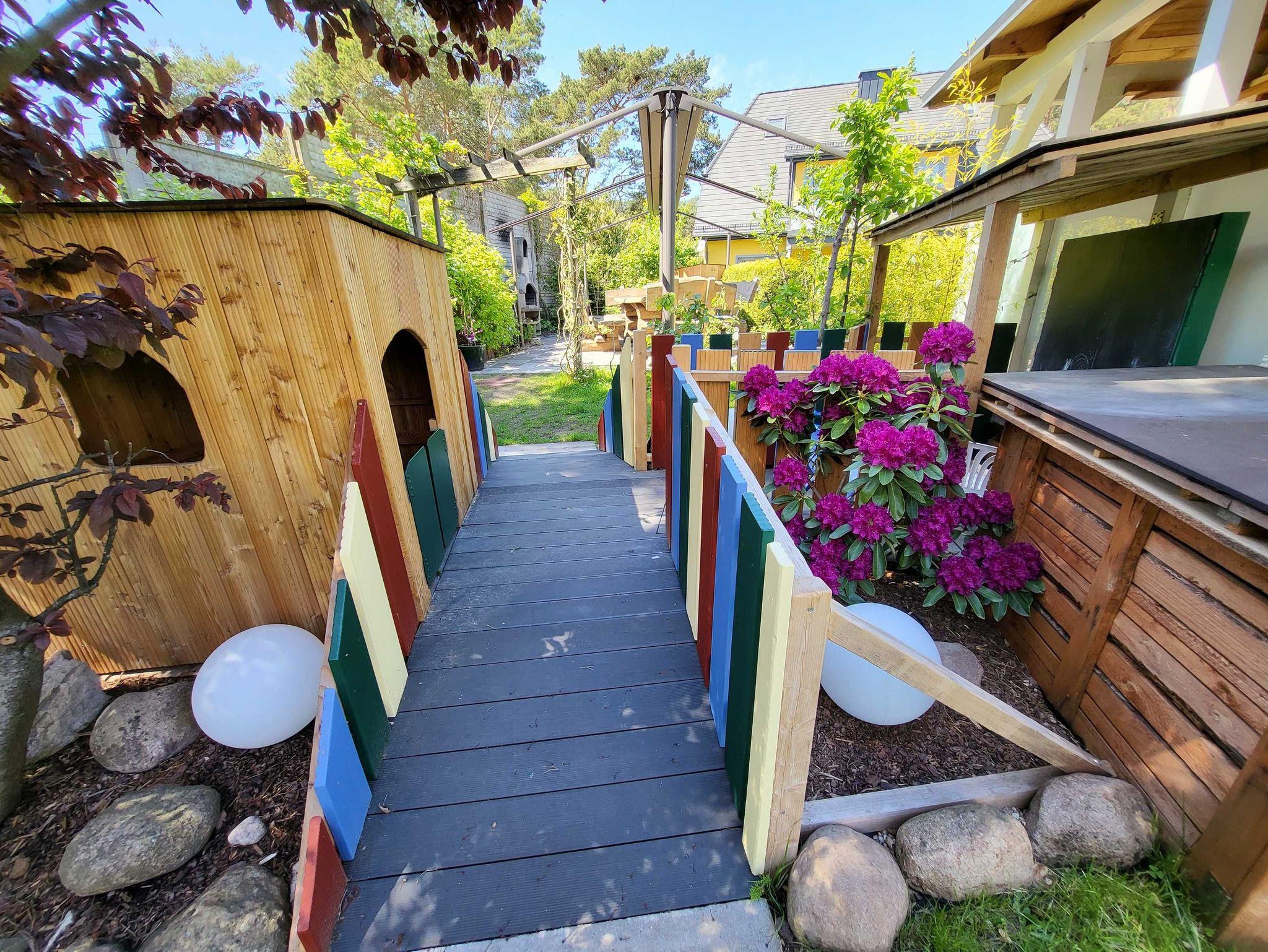 • Eine Kinderküche, Spielhäuser, eine Schultafel und mehrere Fahrgeräte stehen im Garten für alle Kinder bereit.