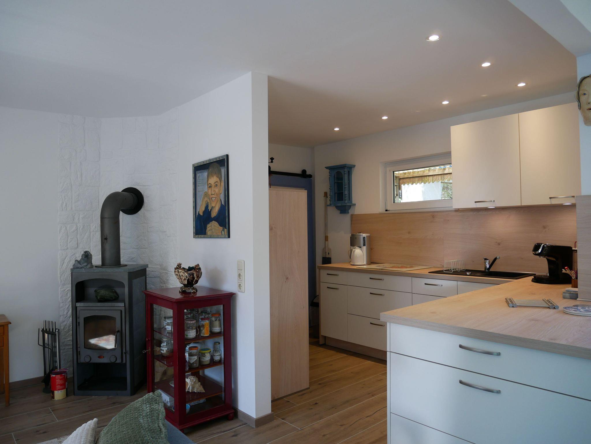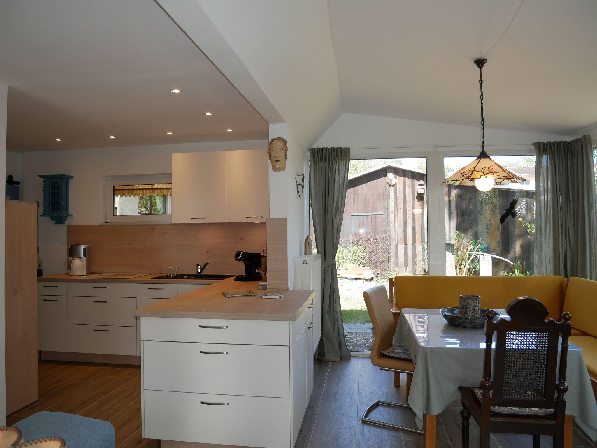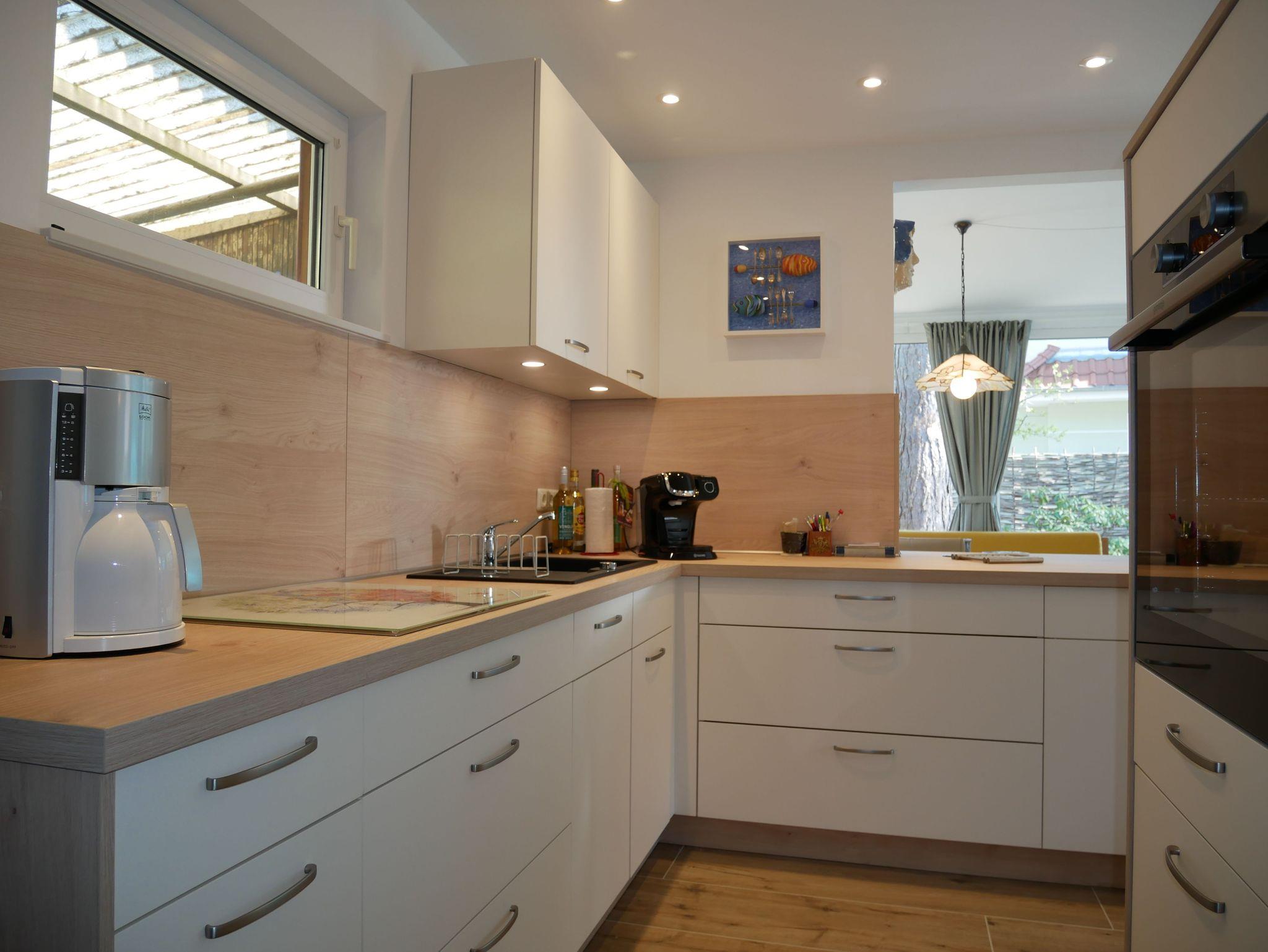 Die moderne Küche ist komplett ausgestattet mit einem Backofen, 4-Platten-Ceranfeld, Kaffeemaschine, Wasserkocher, Toaster, Kaffeepadmaschine sowie einer Spülmaschine. Der Kühlschrank mit Tiefkühlfach bietet ausreichend Platz für Ihre Einkäufe. Das helle Wohnzimmer lädt mit einem Sofa, Smart TV, W- Lan und Radio zum Verweilen ein. Der Essbereich mit Esstisch und Sitzpolstern bietet genügend Platz für gemeinsame Mahlzeiten.