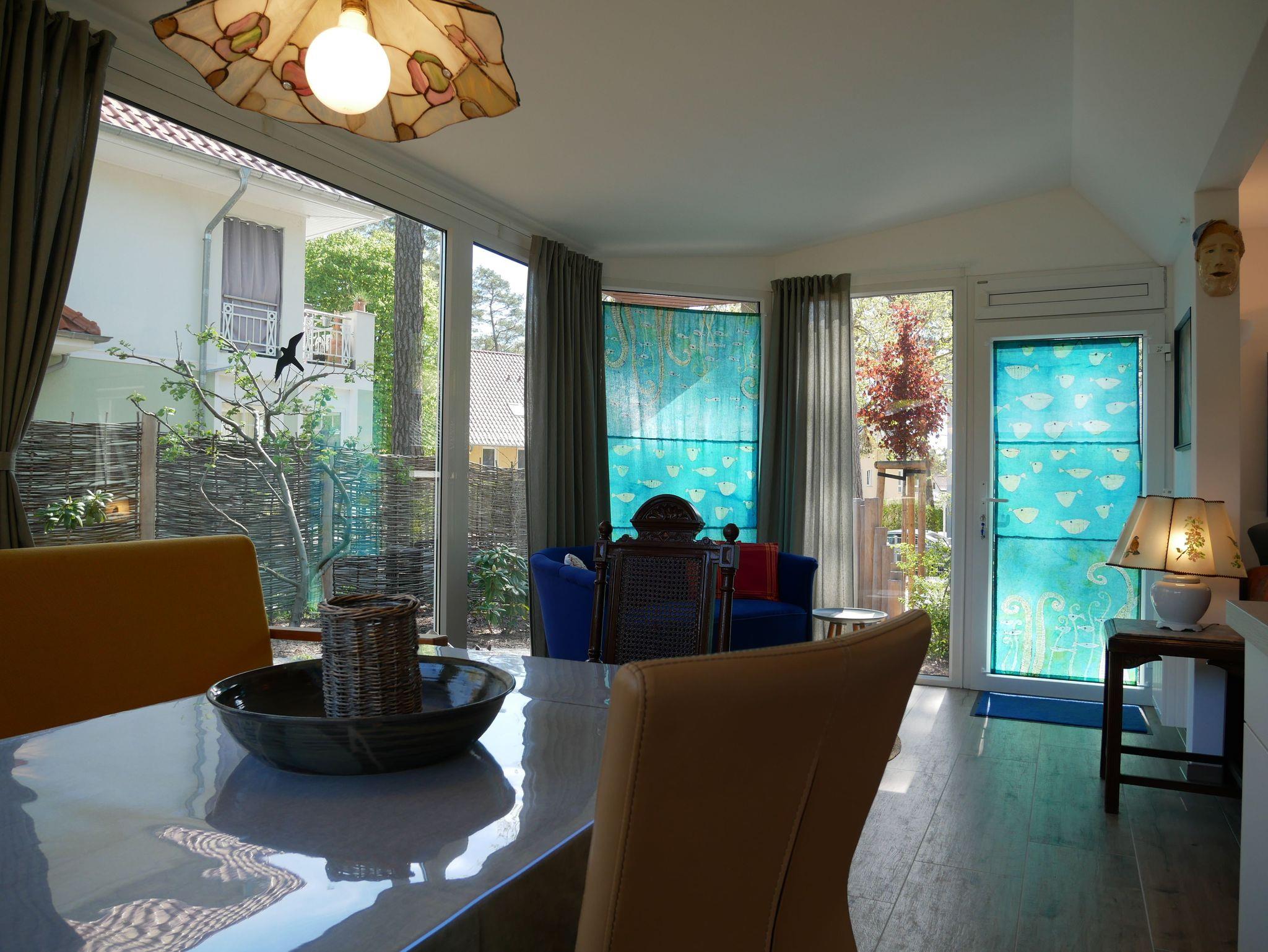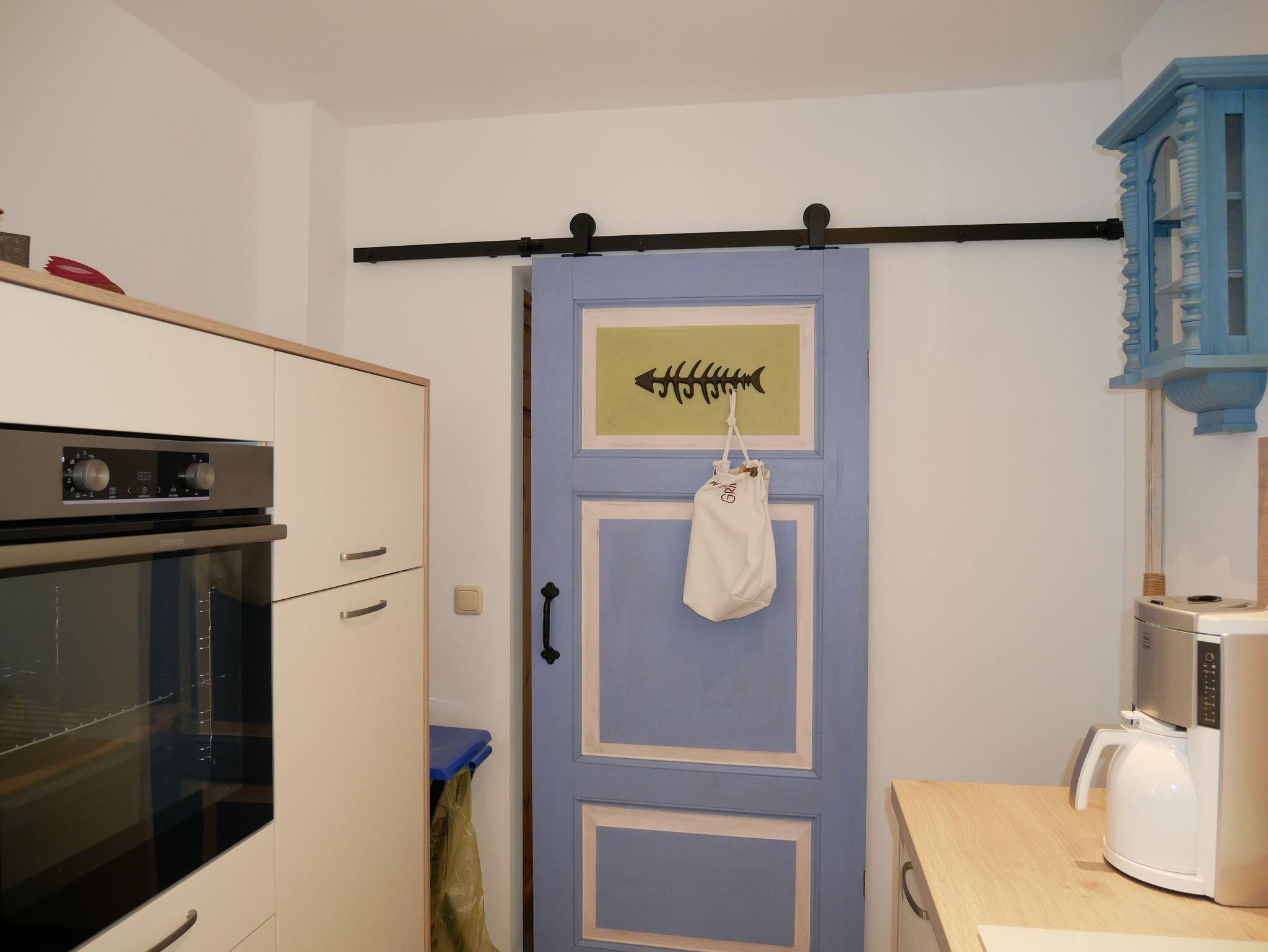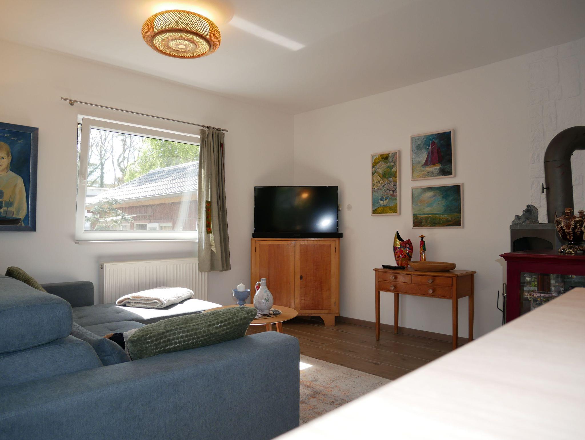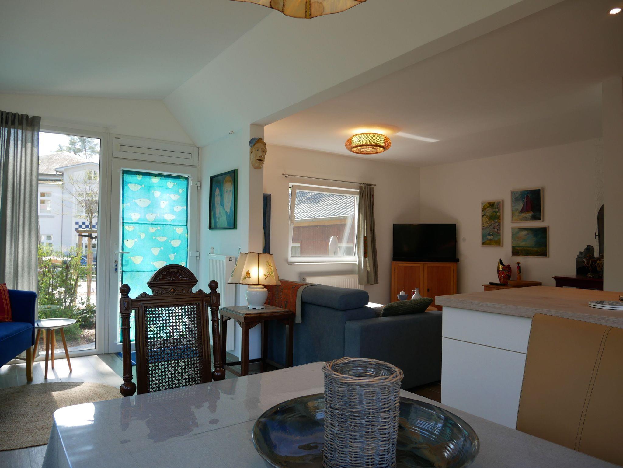 Die moderne Küche ist komplett ausgestattet mit einem Backofen, 4-Platten-Ceranfeld, Kaffeemaschine, Wasserkocher, Toaster, Kaffeepadmaschine sowie einer Spülmaschine. Der Kühlschrank mit Tiefkühlfach bietet ausreichend Platz für Ihre Einkäufe. Das helle Wohnzimmer lädt mit einem Sofa, Smart TV, W- Lan und Radio zum Verweilen ein. Der Essbereich mit Esstisch und Sitzpolstern bietet genügend Platz für gemeinsame Mahlzeiten.