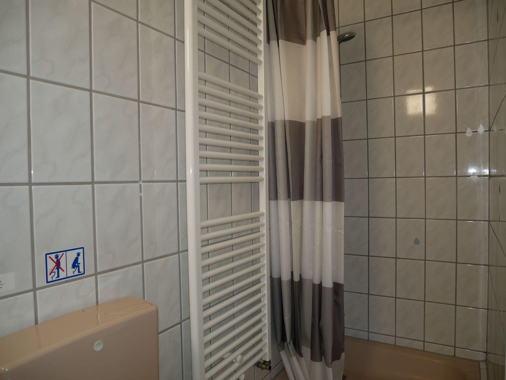 Das Badezimmer verfügt über eine Dusche mit Vorhang, Toilette, Waschbecken, Kosmetikmülleimer, Fön, Kosmetikspiegel sowie Seife und Toilettenpapier.