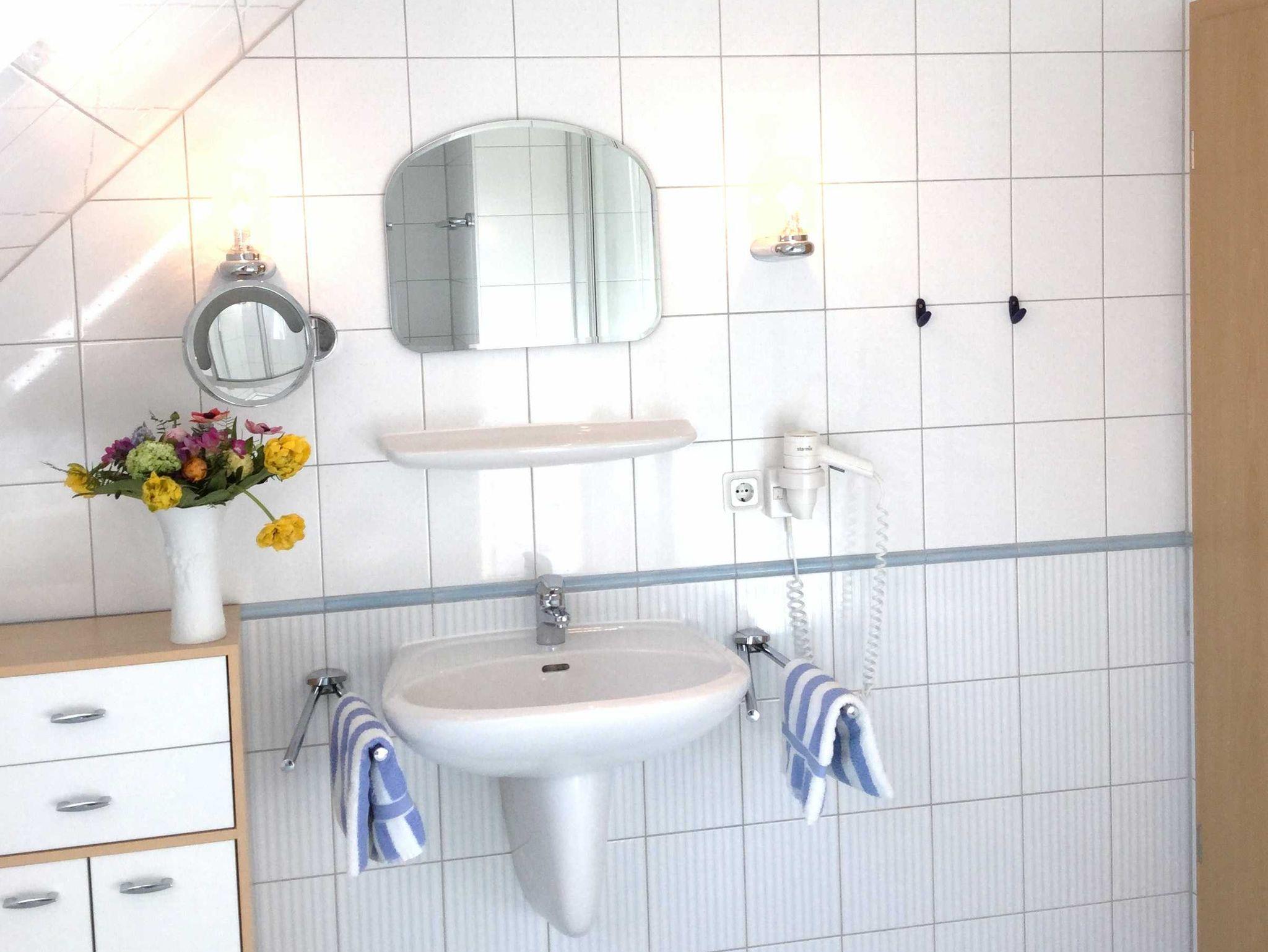 Ein Fön und beleuchteter Kosmetikspiegel sorgt für zusätzlichen Komfort.